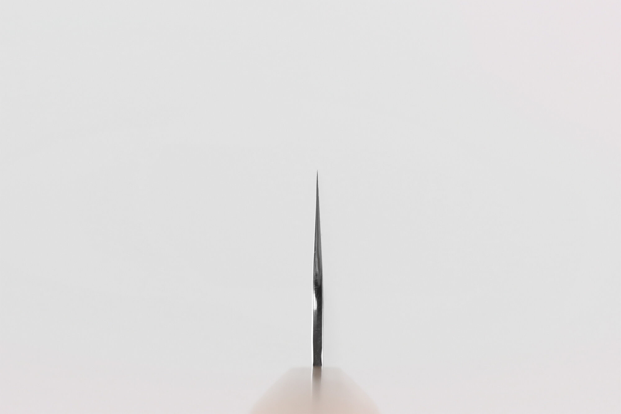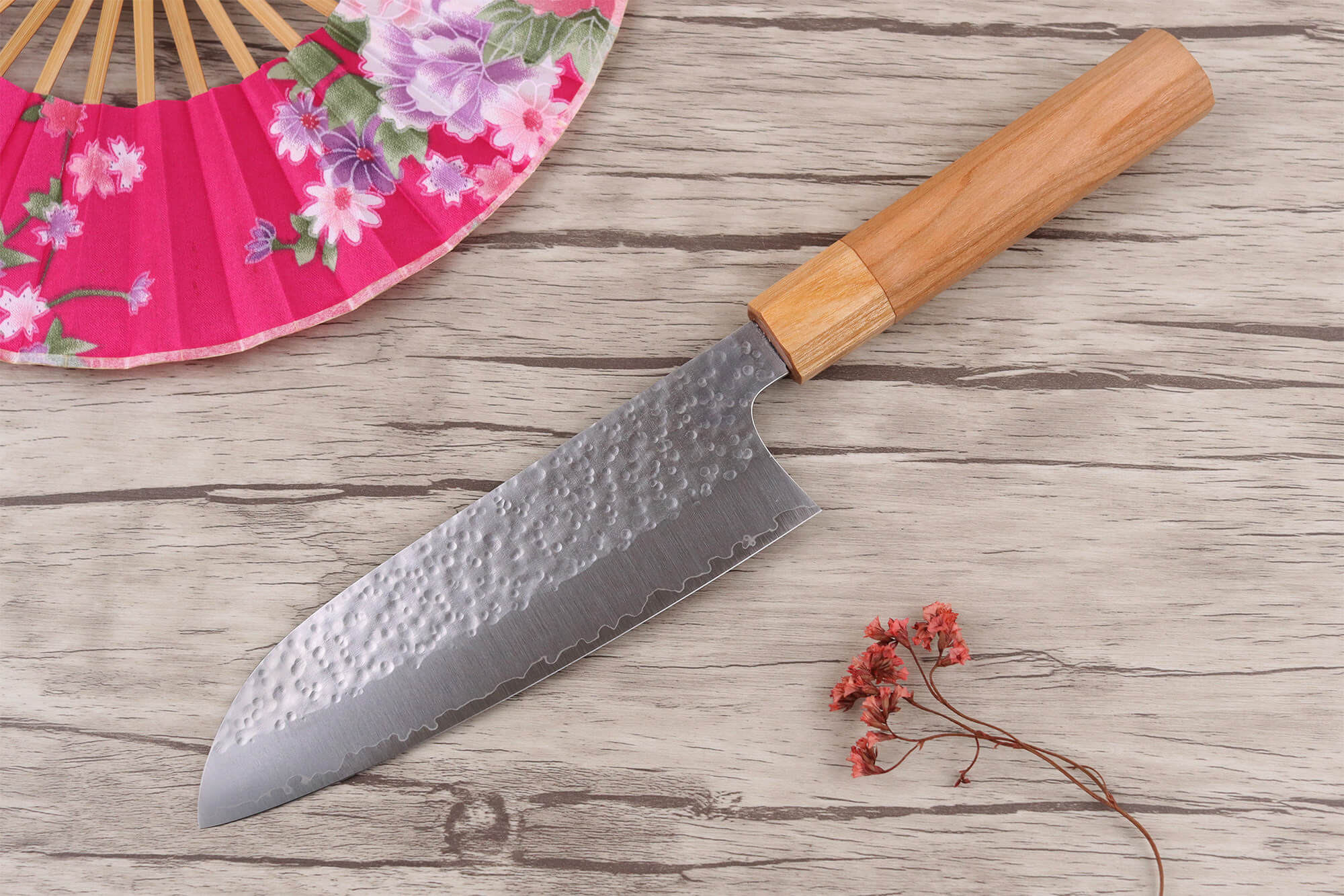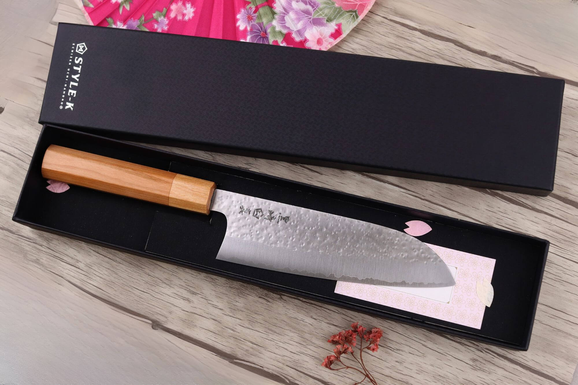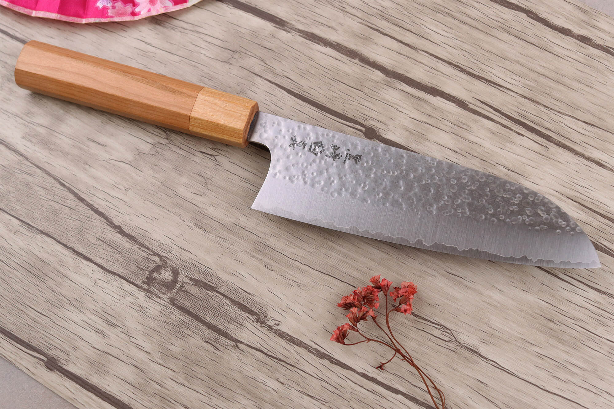 Ce couteau japonais artisanal santoku de 16,5cm est un modèle multifonctions, très apprécié au Japon et en Occident pour sa grande polyvalence. Il remplit les mêmes usages qu’un couteau de chef et permet de hacher, émincer ou ciseler facilement une large variété d’aliments. Sa lame légèrement plus courbée qu’un couteau de chef classique le rend particulièrement efficace pour ciseler les herbes avec des mouvements fluides et précis.