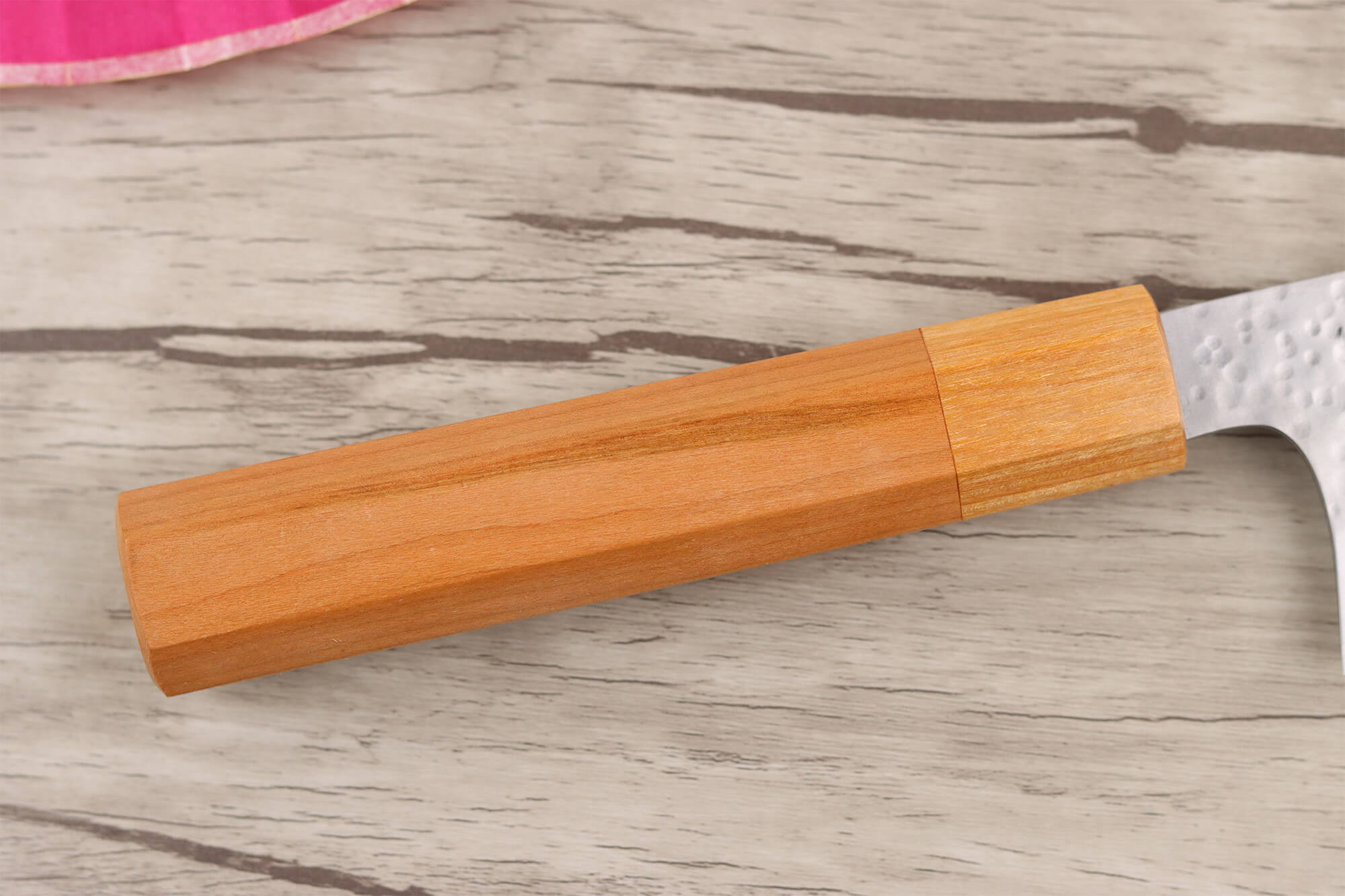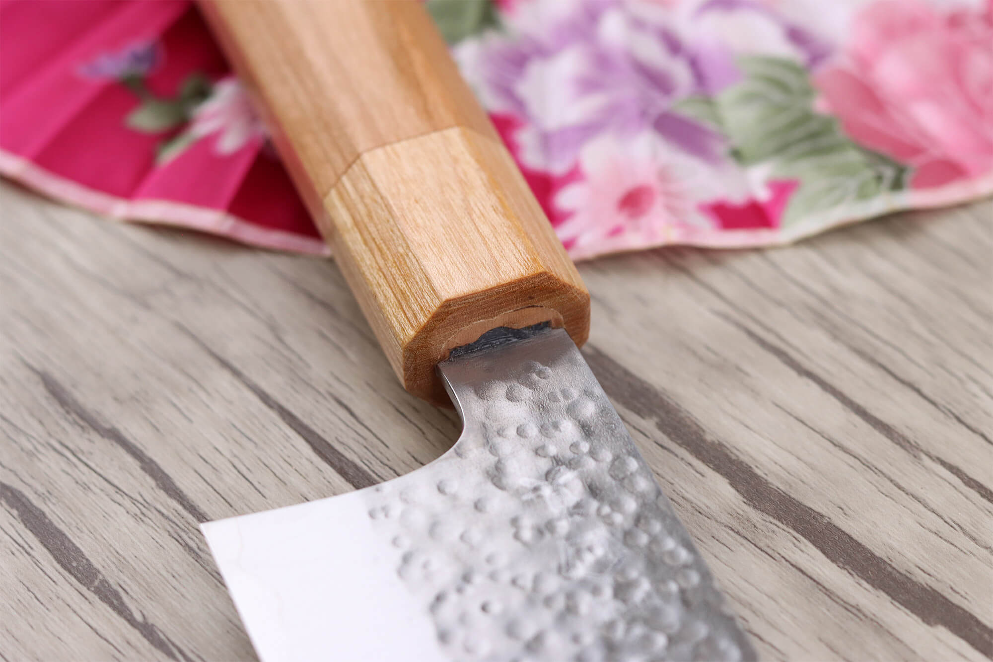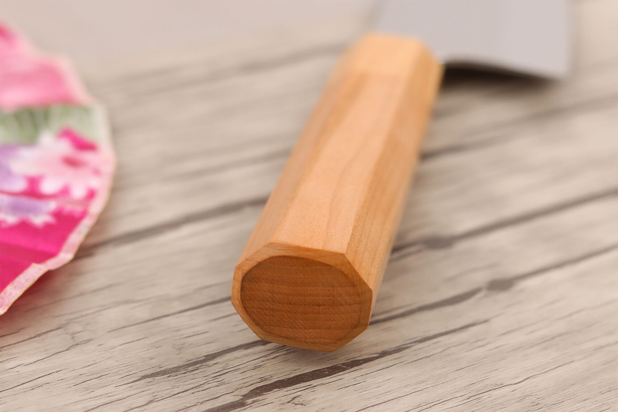 De forme octogonale, il épouse naturellement la paume de la main et assure un excellent contrôle lors de la découpe. Une mitre en bois de pakka clair relie la lame au manche. Ce matériau composite est particulièrement résistant à l’humidité et aux possibles variations de température. La jonction est comblée par une pâte à bois, rendant l’ensemble étanche et empêchant l’eau ou les résidus alimentaires dans le bois de cerisier.