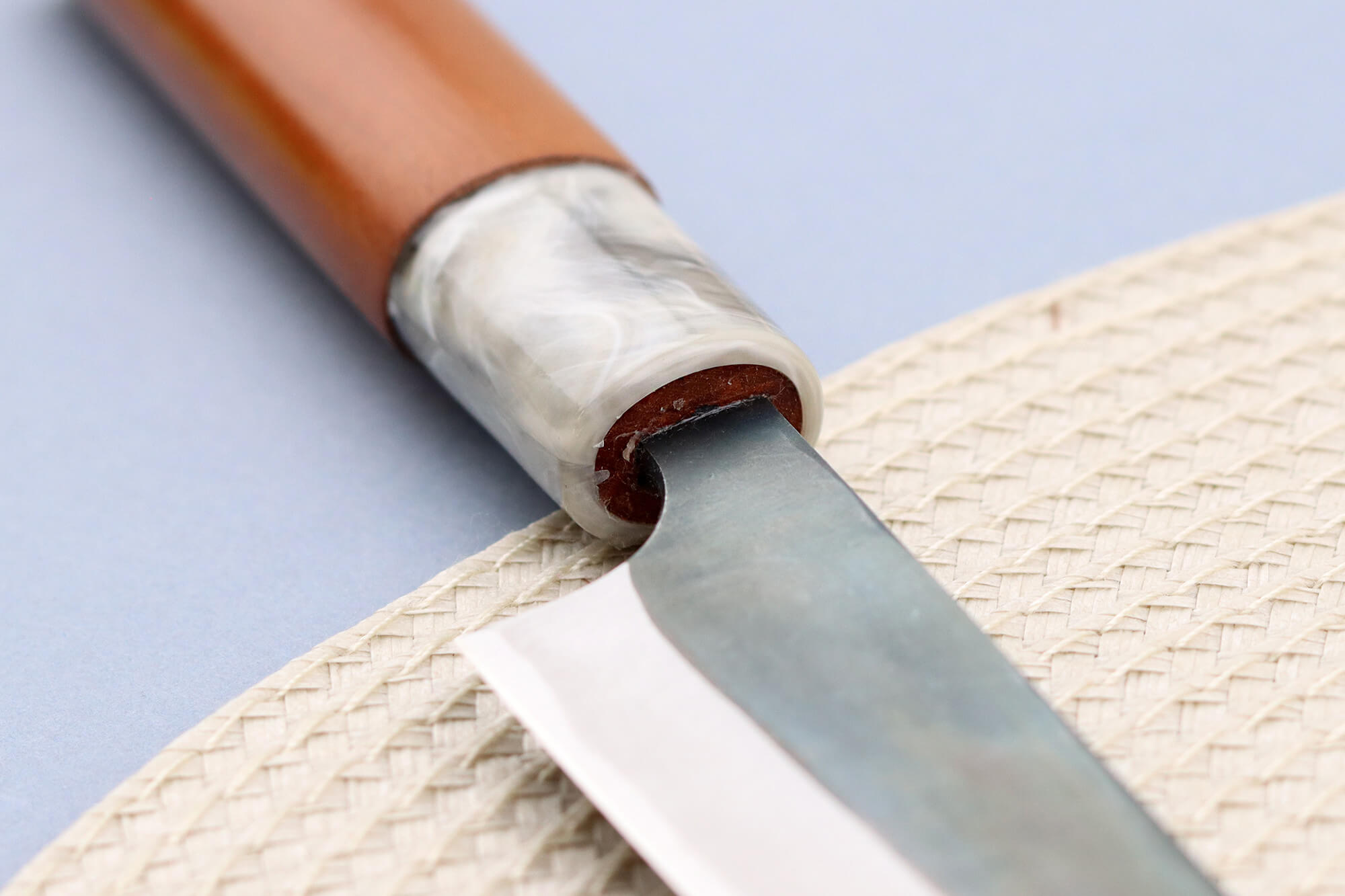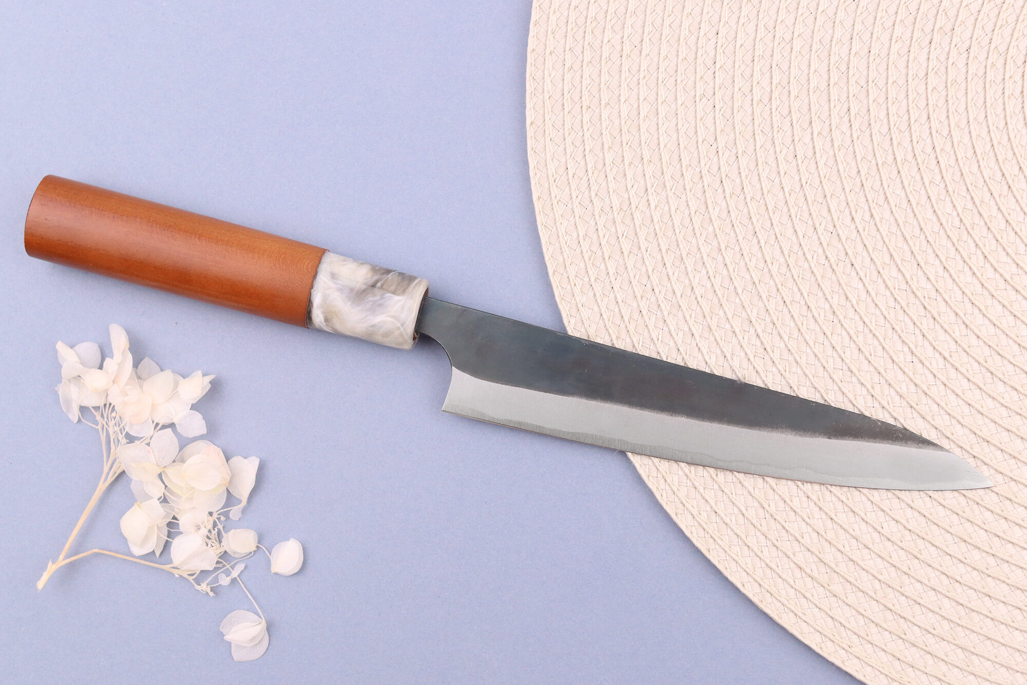 La lame de votre couteau japonais de cuisine, courte et maniable, est construite selon la méthode San Maï, c’est-à-dire à partir d'un cœur en acier rigide entouré de 2 couches de fer souples. Son noyau central est en acier Aogami #2, particulièrement riche en carbone (environ 1,2 %), ce qui lui confère une dureté de 62HRC Rockwell. Résultat : un tranchant d’une finesse remarquable, qui conserve son efficacité longtemps.