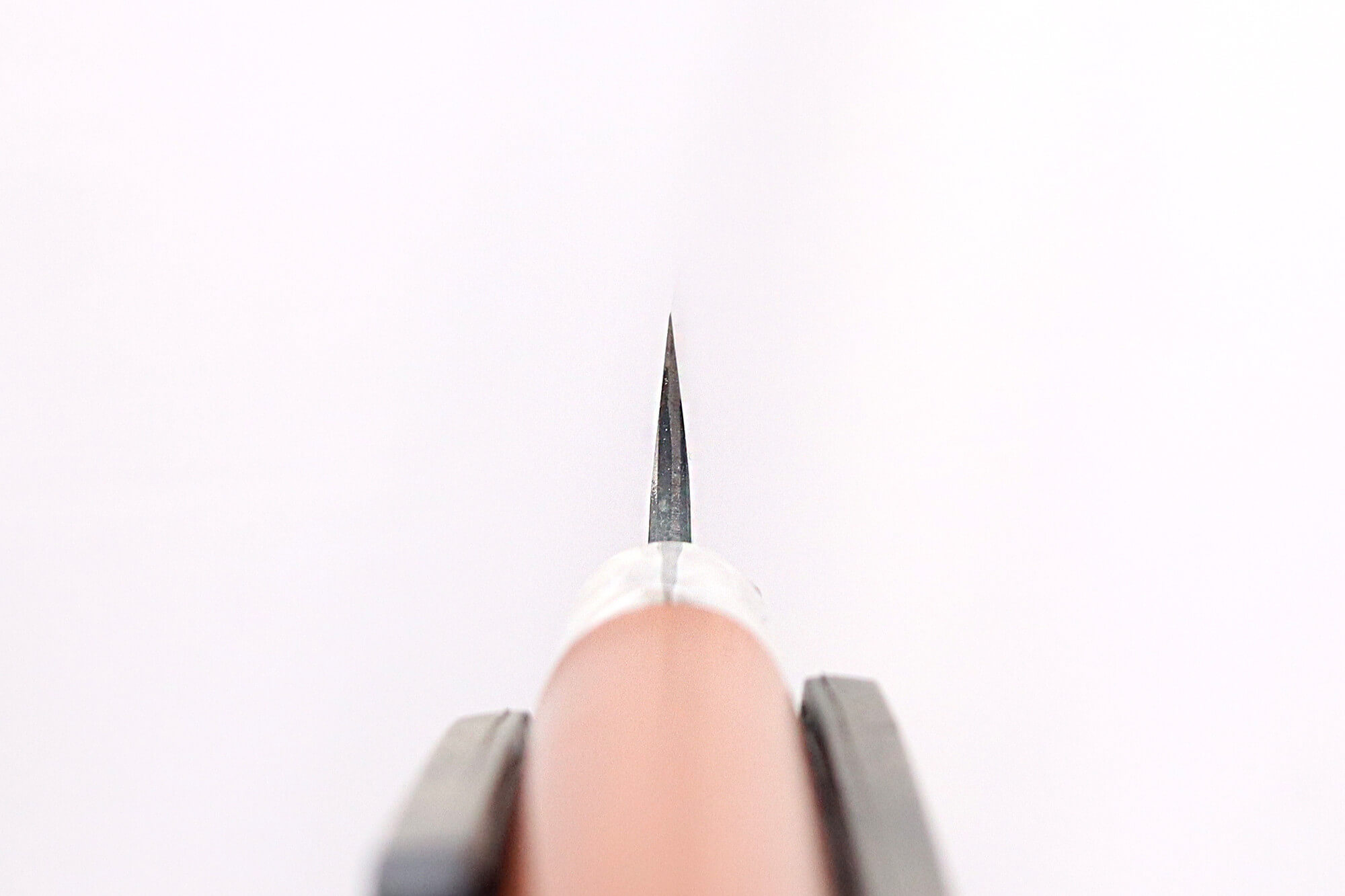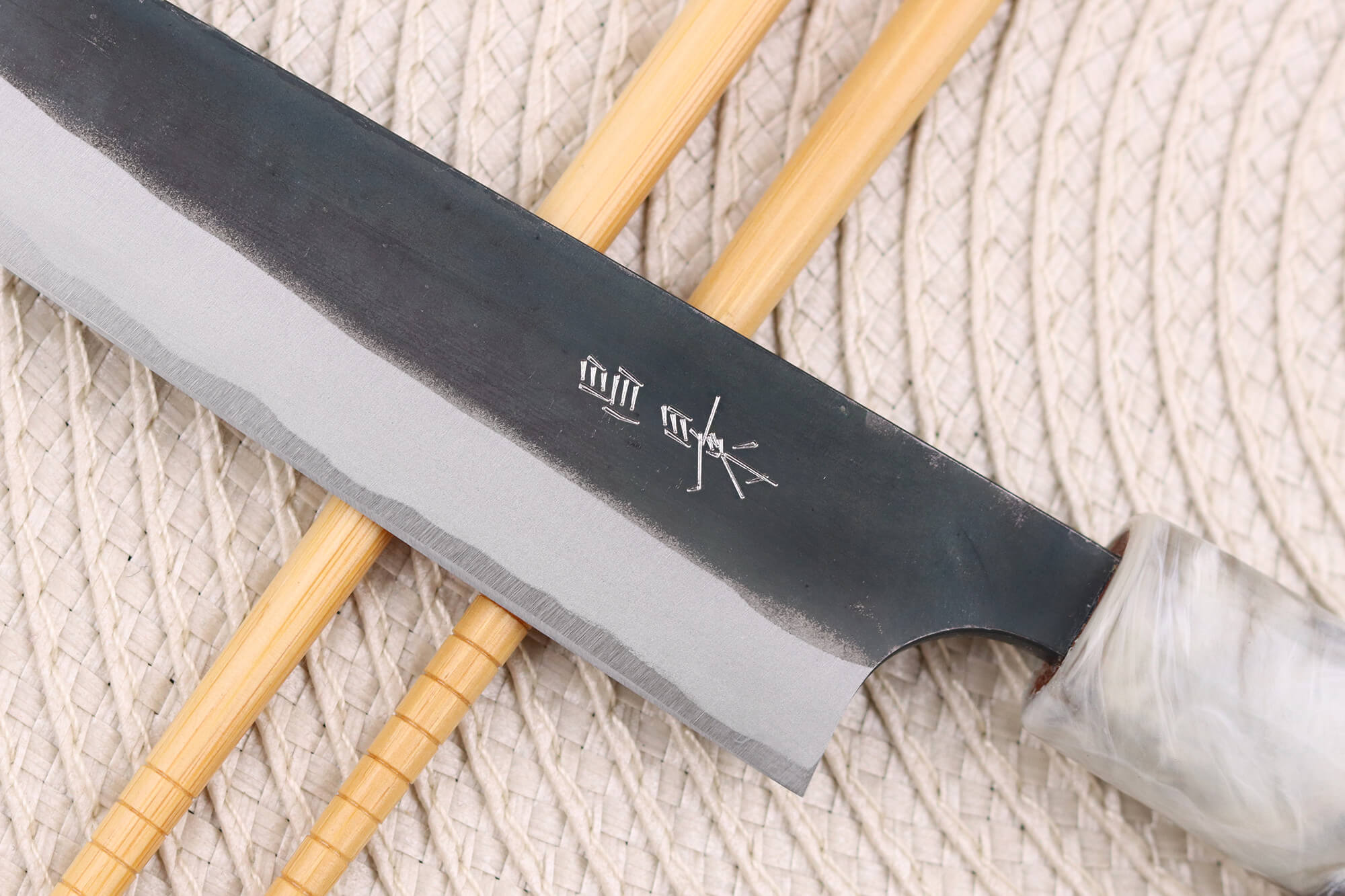 La lame présente une finition brute de forge, qui lui apporte un caractère visuel unique ! Vous pouvez aussi observer les reflets bleus formés par le carbone qui font écho au nom de la gamme Masakage Mizu qui signifie "eau".