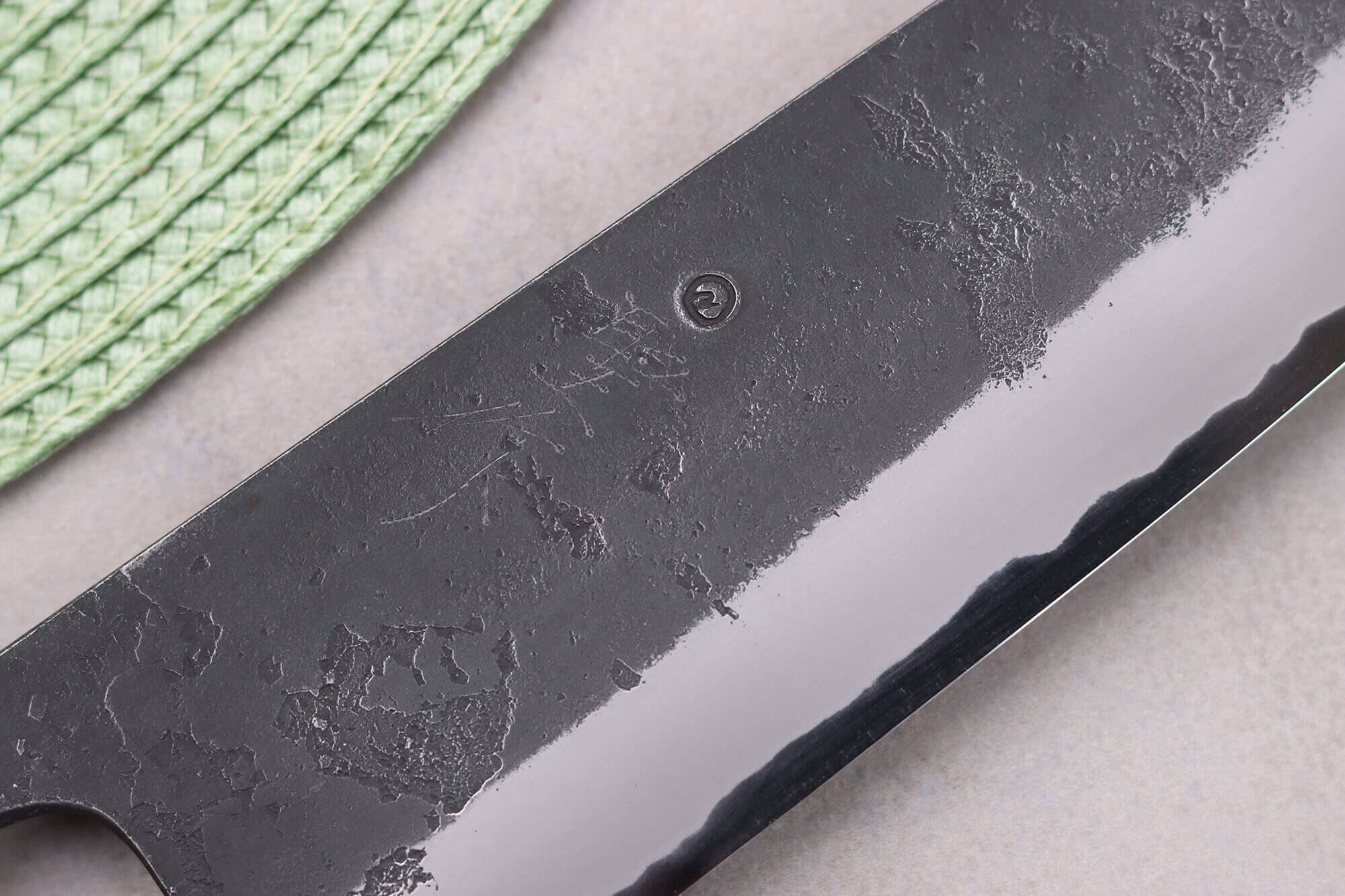 Cette lame bénéficie d'une finition Black Nashiji traditionnelle. C'est une technique qui lui confère sa teinte noire et son aspect rustique, comme si elle avait été martelée, et rappelle la finition brute de forge. Le poinçon du forgeron ainsi que de très fins kanji gravés sont visibles sur la lame.