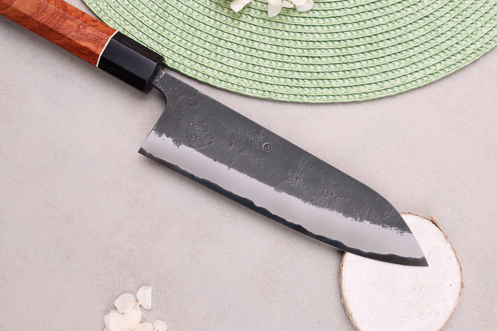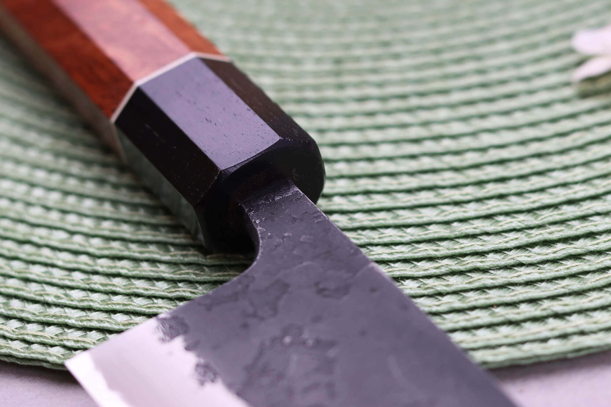 L'acier Aogami #1 contient un fort taux de carbone de près de 1,3%. Le carbone est l'élément crucial pour accroître la dureté d'un alliage, sachant qu'un acier avec une dureté élevée bénéficie d'un tranchant marqué qui tient très longtemps. La lame de ce couteau atteint 63 HRC, preuve de son excellente rétention du tranchant et de l'efficacité de son fil de coupe.