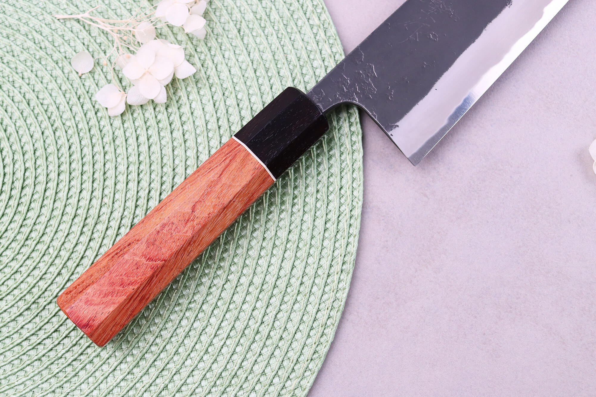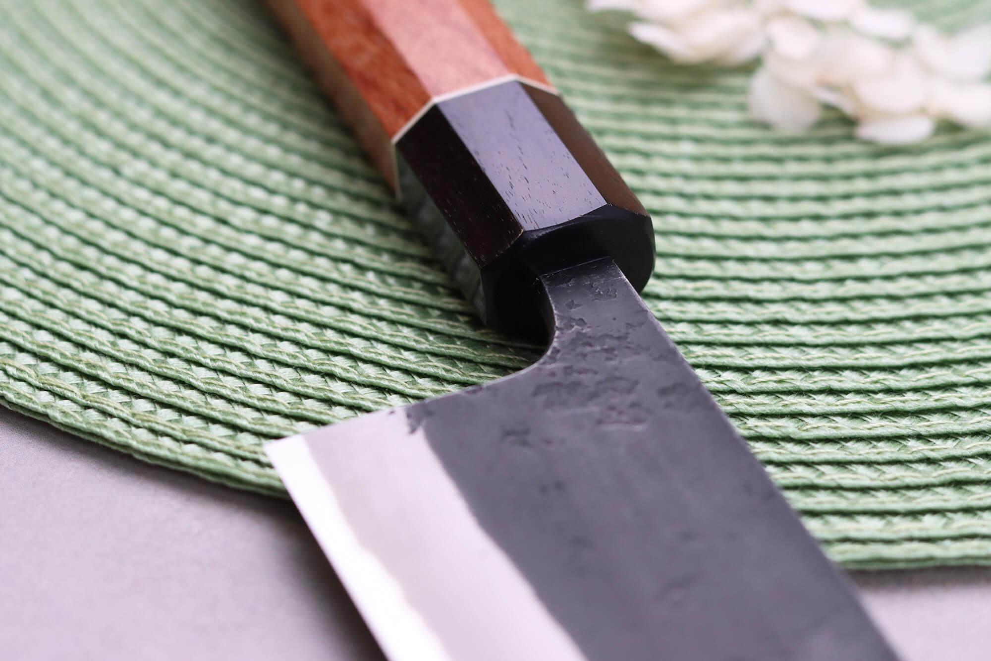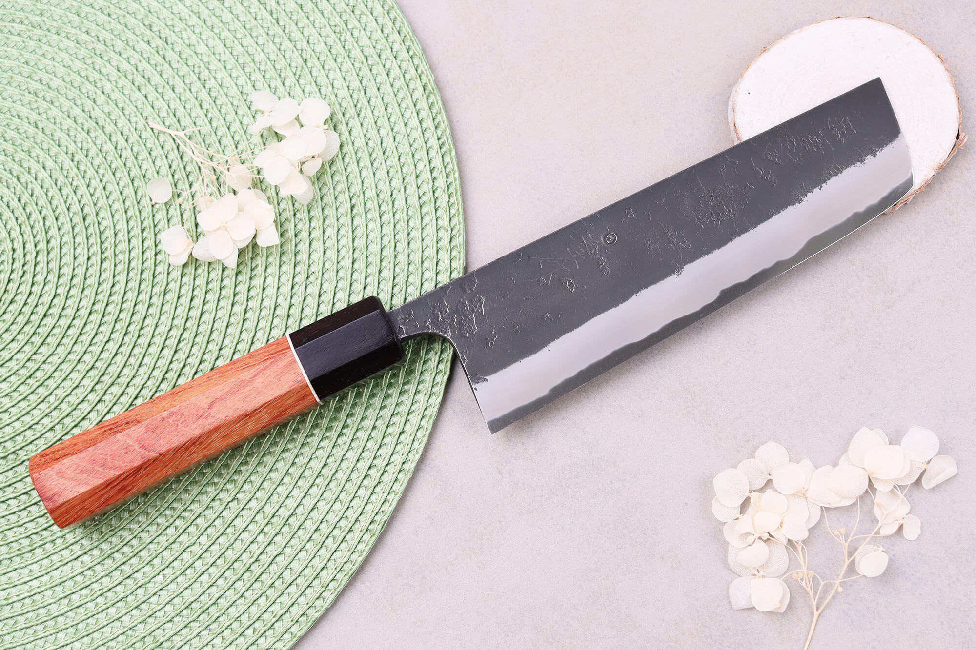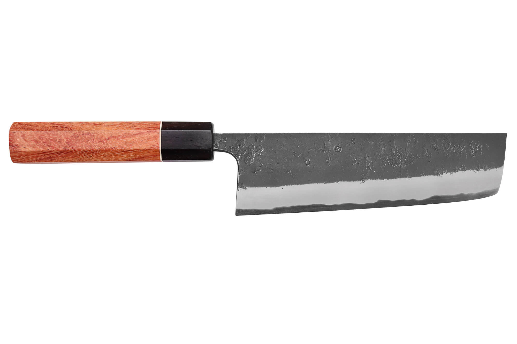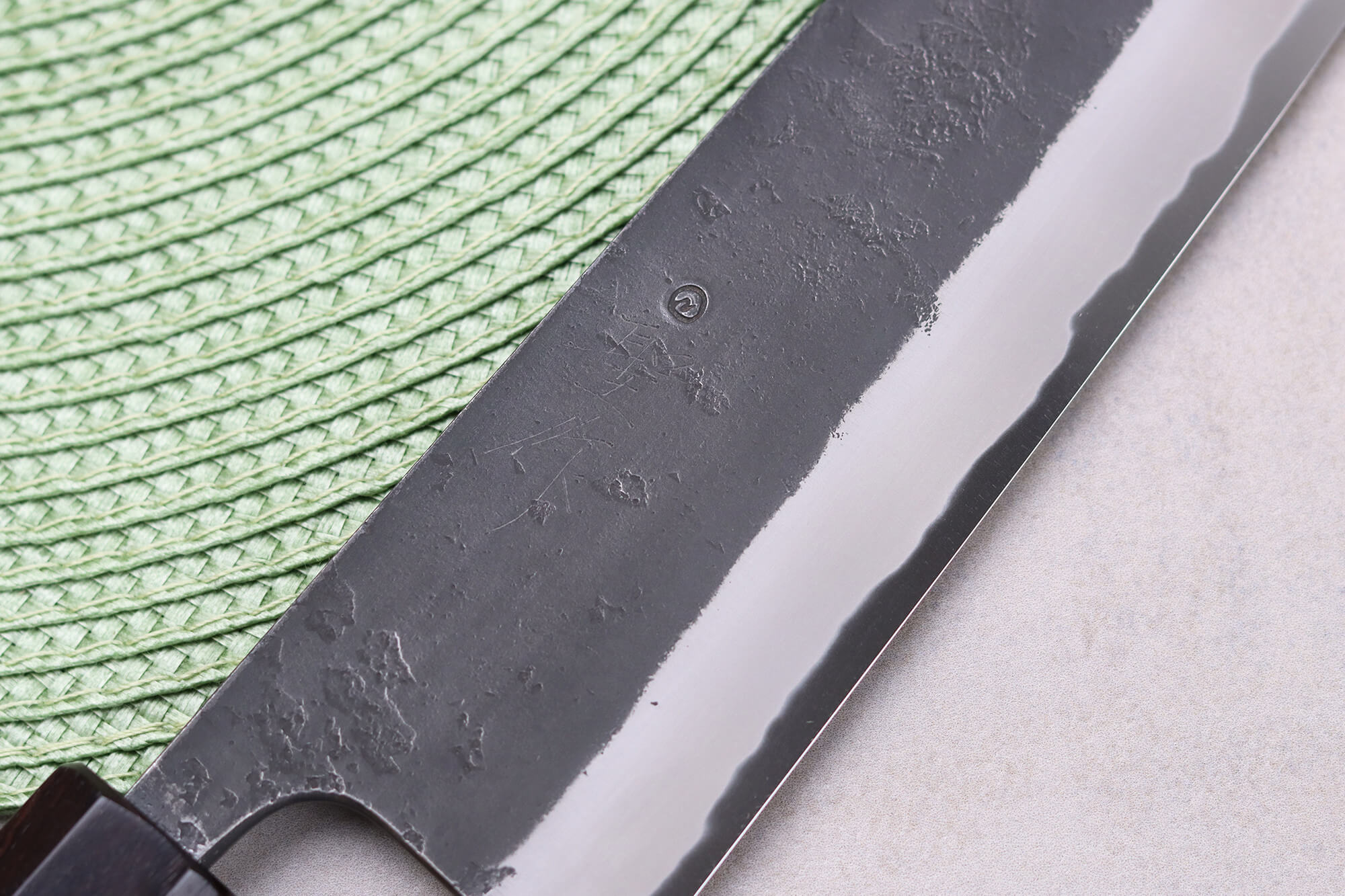 Le forgeron a apporté une finition Black Nashiji traditionnelle à la lame de ce couteau japonais. C'est une technique qui offre à la lame un aspect rustique, authentique, comme si elle n'avait pas été polie et qu'elle avait gardé sa teinte noire. Cet aspect de lame fait penser à une finition brute de forge. Enfin, le forgeron a appliqué son poinçon et de très fins kanji gravés sur la lame.
