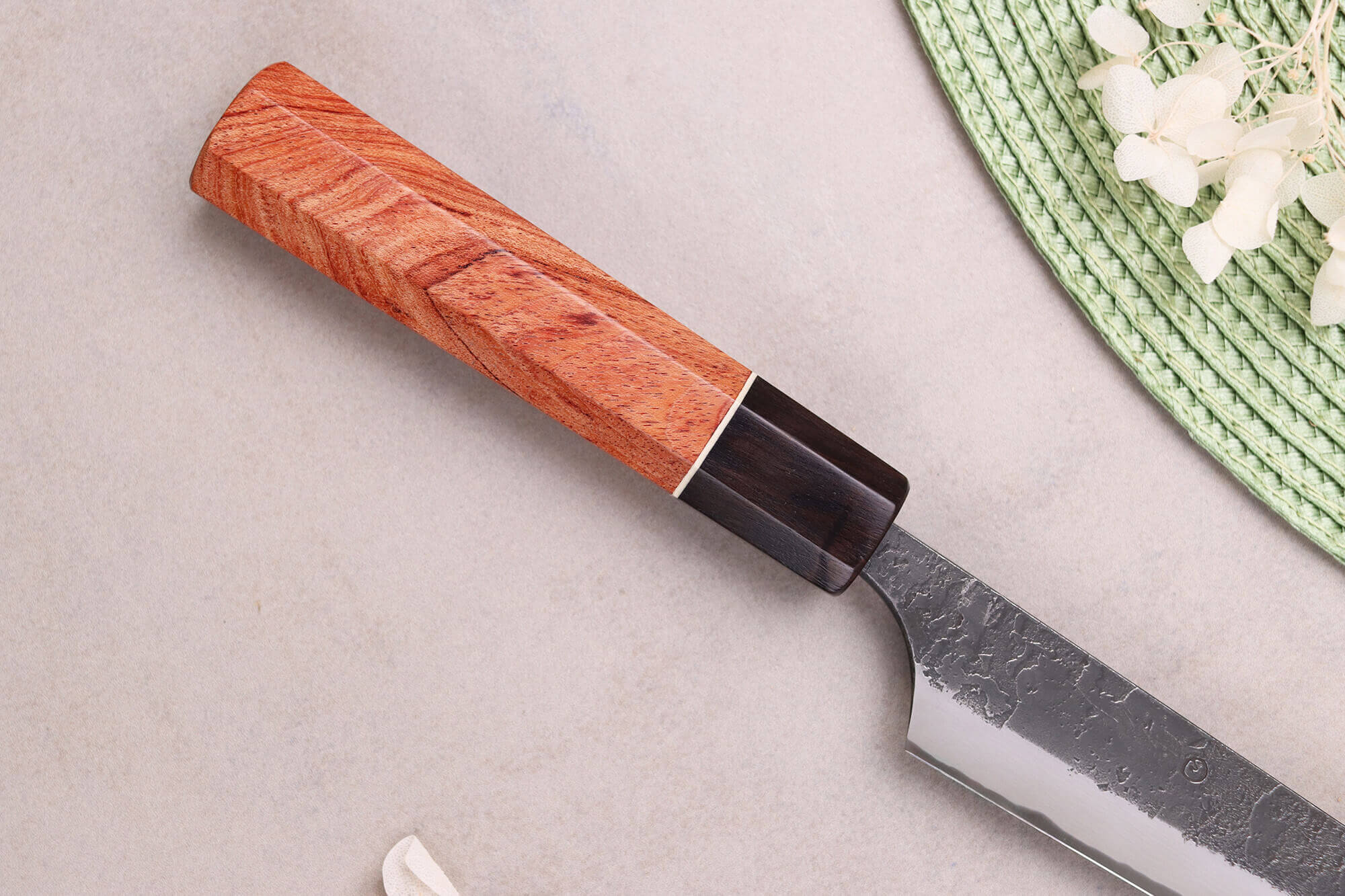 Le manche a été taillé dans une forme octogonale qui épouse idéalement votre paume de main. Ainsi, vous avez le plein contrôle du couteau qui est parfaitement maniable. Notez aussi que la forme octogonale convient tant aux cuisiniers droitiers que gauchers.