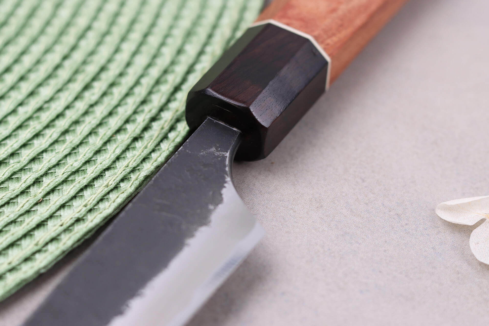 Notez que les couteaux Masashi Yamamoto dispose d'une pointe plus fine que la moyenne des autres couteaux. En effet, l'épaisseur de la lame rétrécie lorsqu'on arrive à son extrémité, pour la rendre plus flexible et donc faciliter les découpes, avec une sensation plus agréable et naturelle à l'usage. C'est une nouvelle preuve du savoir-faire de ce forgeron hors-pair. Cependant, faites bien attention de ne pas appuyer trop dessus, car la flexibilité a ses limites !