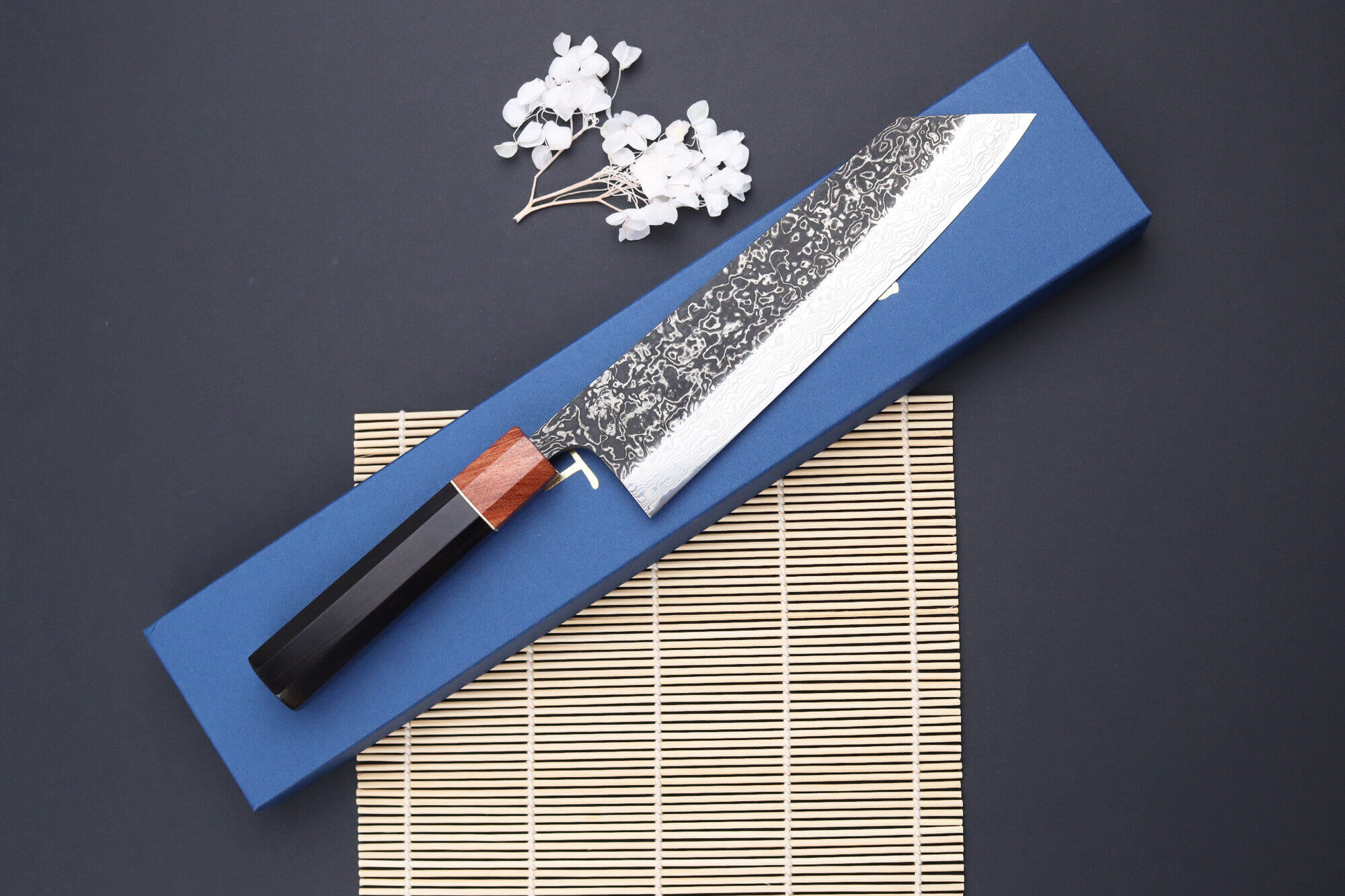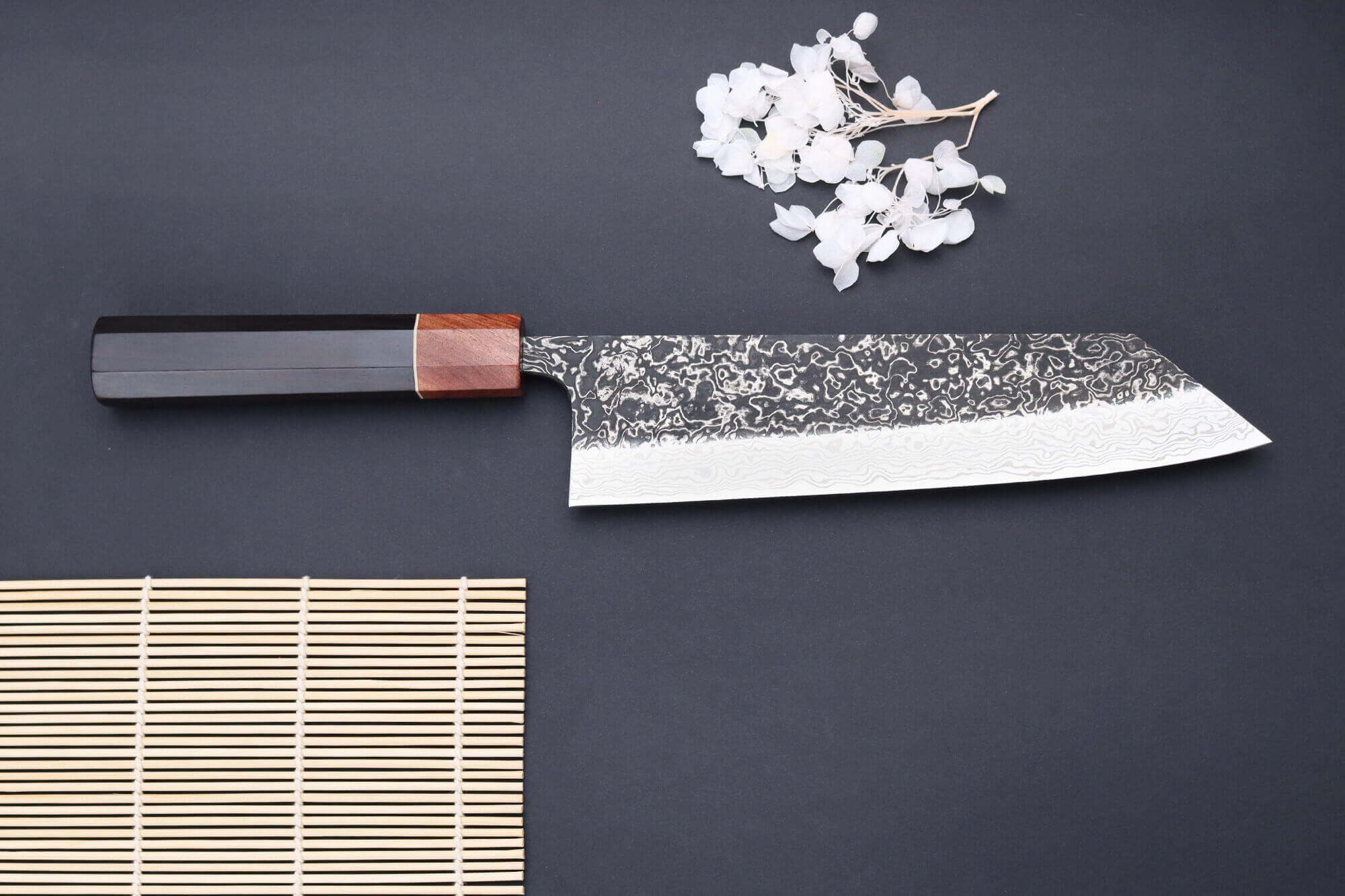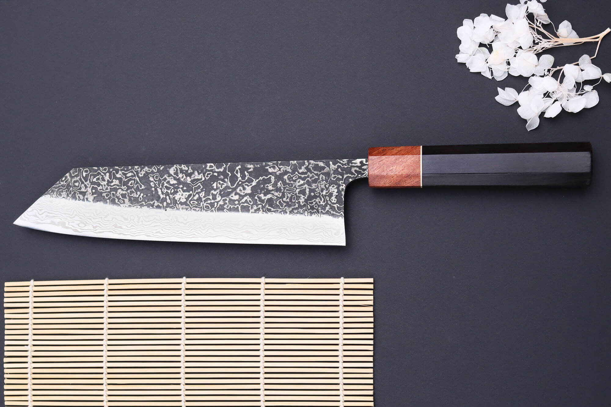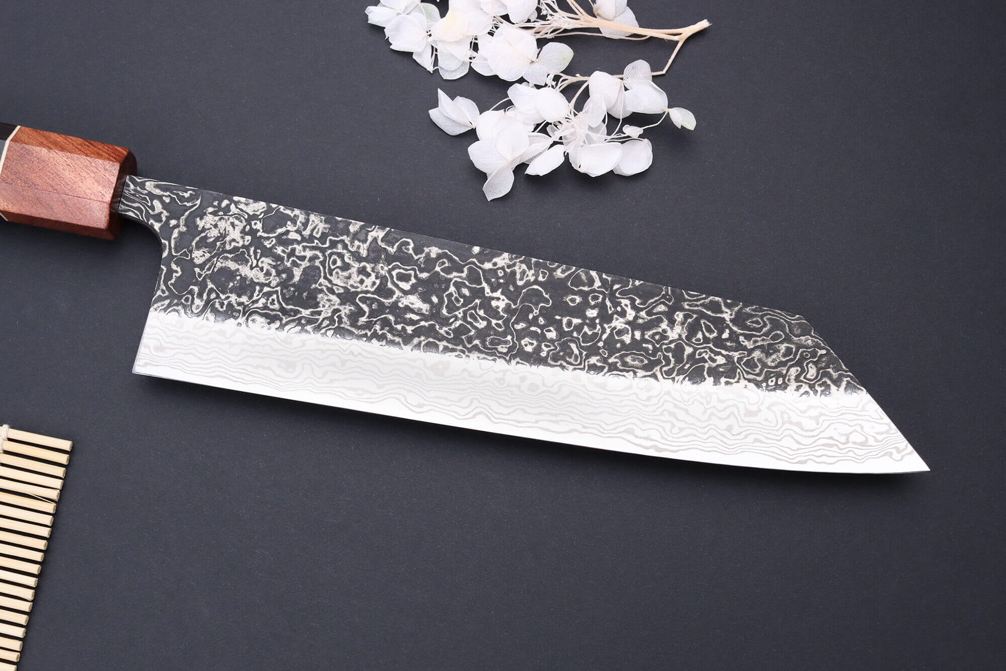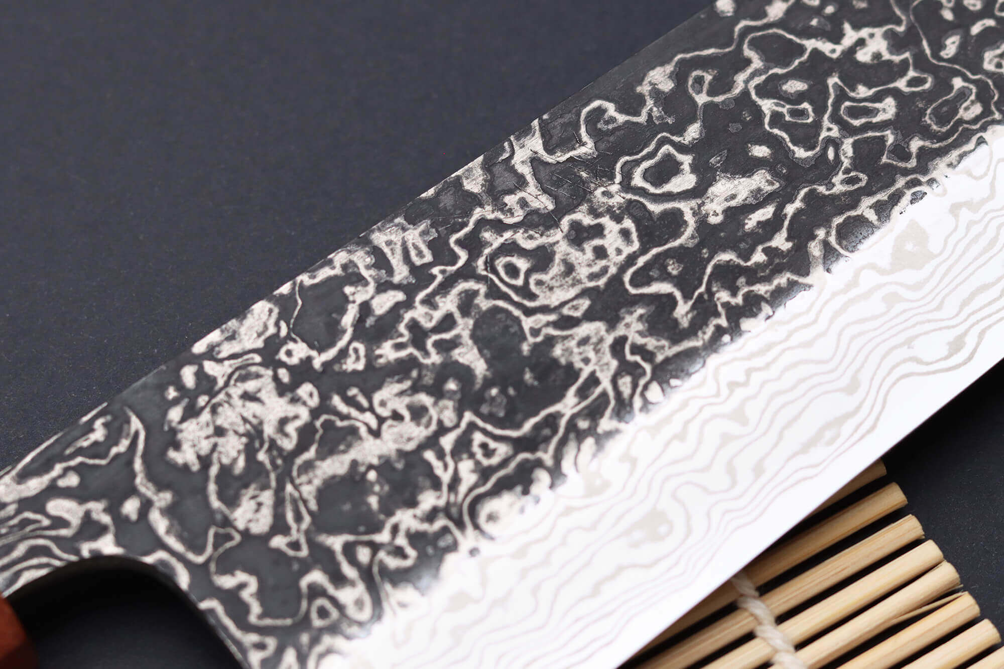 Vous pouvez également voir le mot "kuro" dans le nom du couteau, qui veut dire "noir" en japonais. Ce mot n'a pas été choisi par hasard : le haut de la lame est plus sombre que le reste, ce qui renforce son caractère.