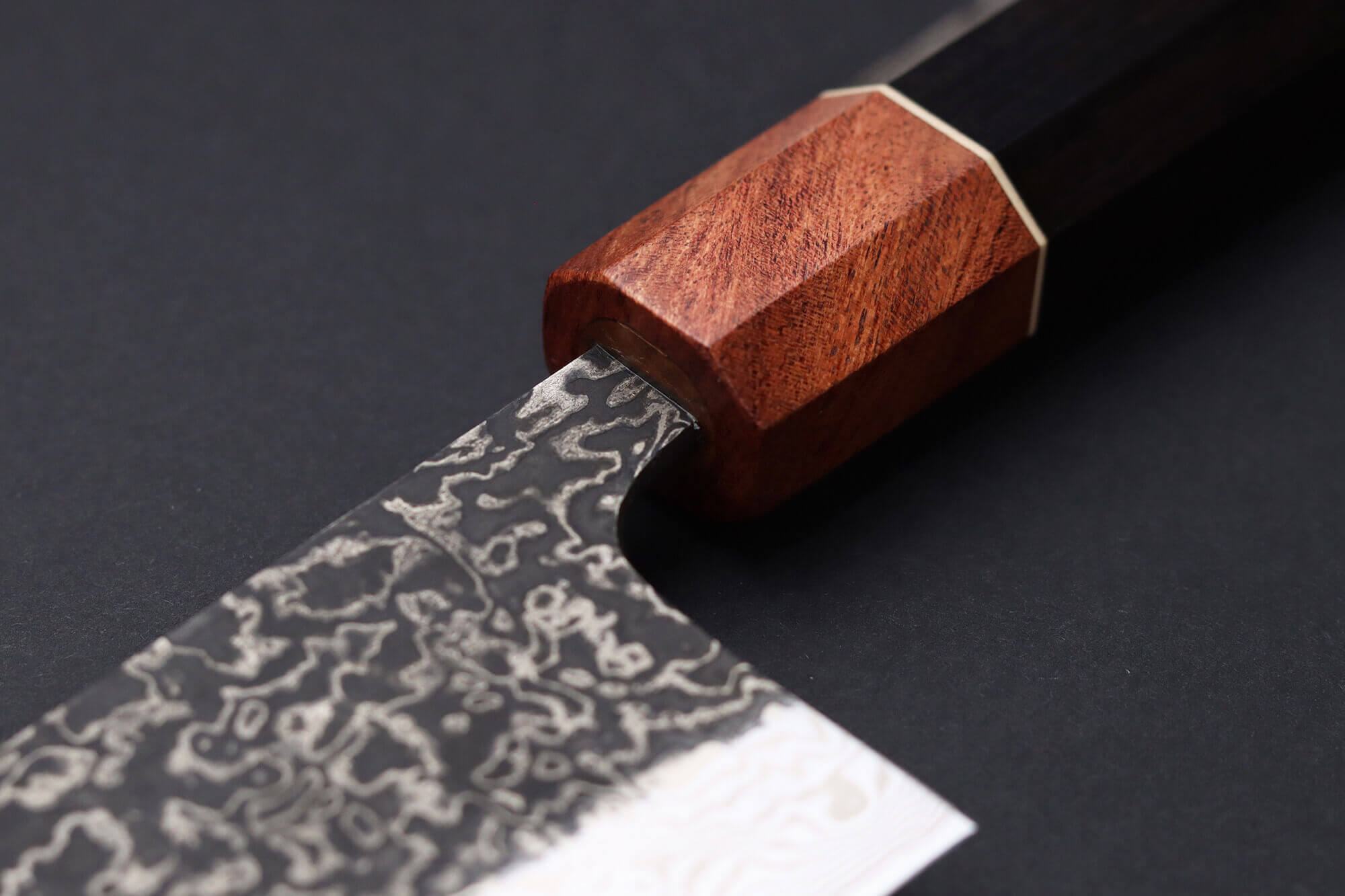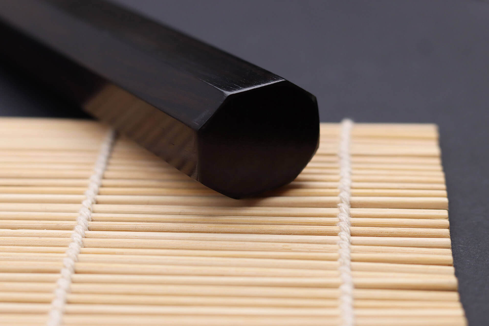 Passons au manche du couteau. C'est de l'ébène aux belles nuances profondes qui a été choisi pour le réaliser. Il est très dense, ce qui le protège mieux contre les fissures : il convient donc très bien à un usage régulier, et même au quotidien. Sa durabilité est un avantage en cuisine ! L'ébène a une forme octogonale afin de convenir aux cuisiniers gauchers et droitiers.