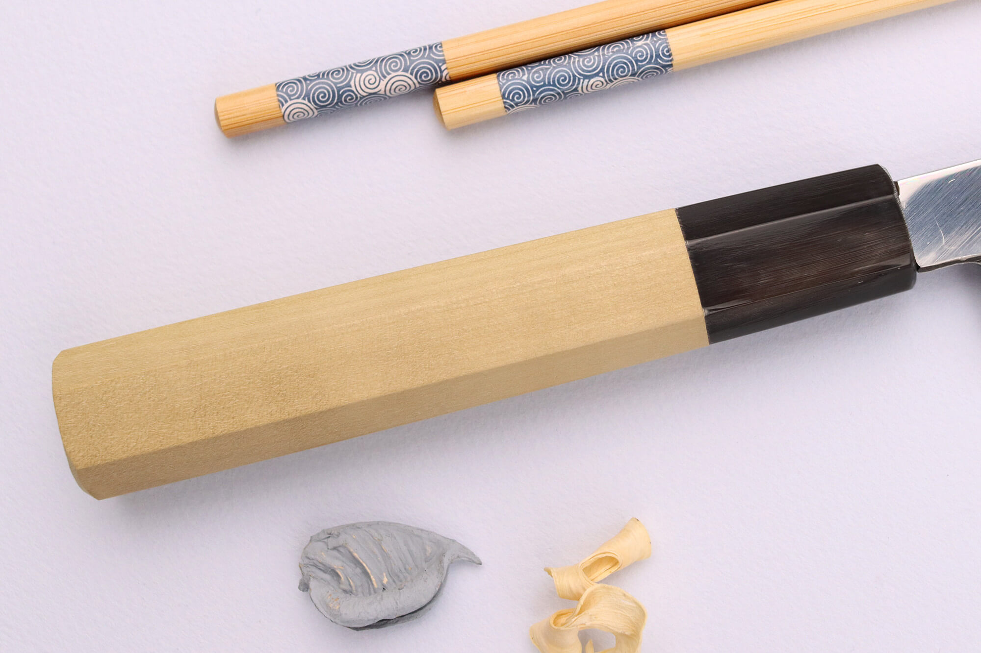 Fabriqué en bois de magnolia, une essence reconnue pour sa robustesse et sa résistance naturelle à l’humidité, chaque manche présente des nuances claires et un veinage unique, rendant chaque couteau Kaishin singulier !