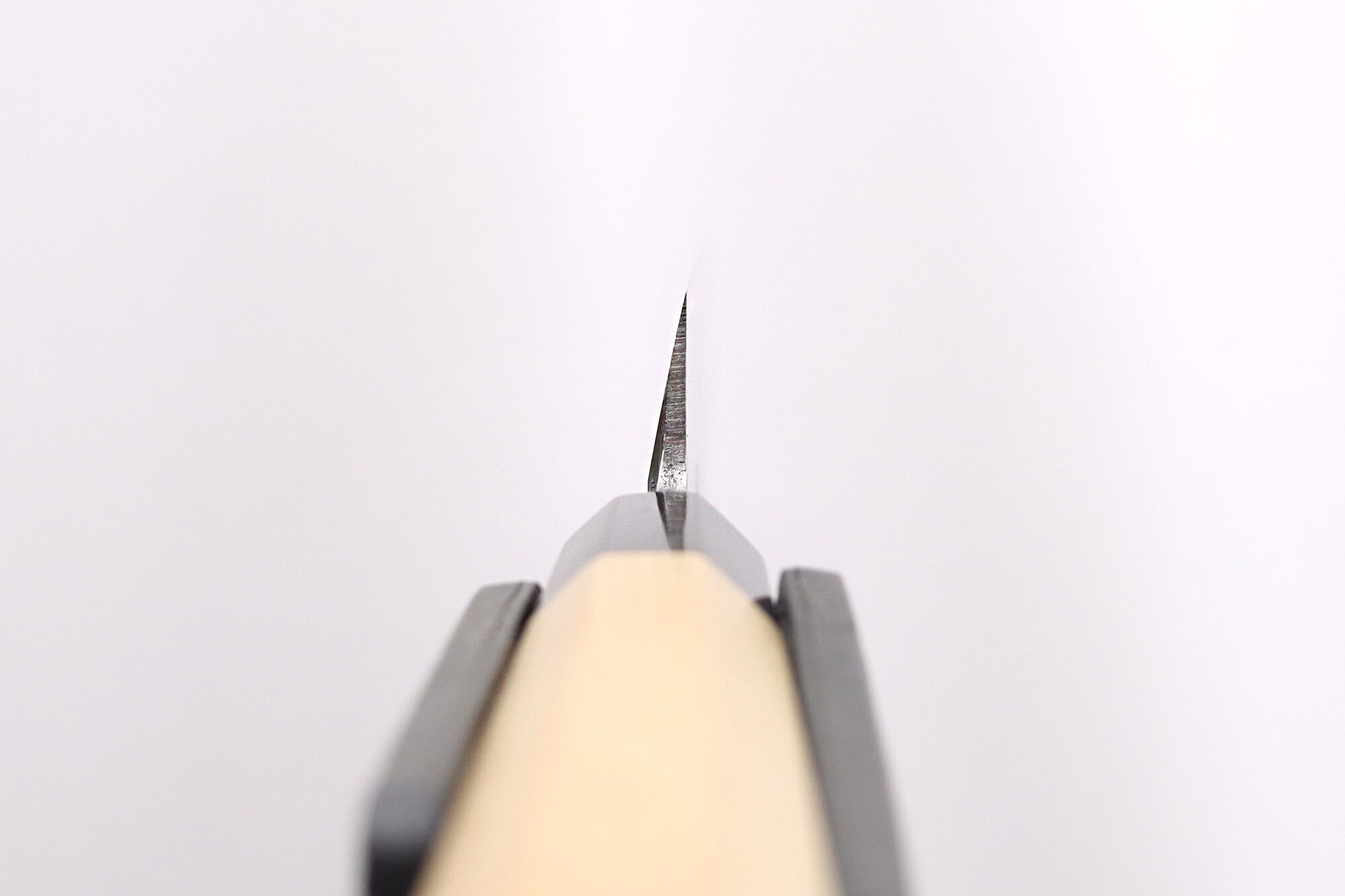 Ensuite, ce couteau a été aiguisé par Tomoyuki Ajioka, un maître affûteur traditionnel réputé, lui aussi originaire de Sakai. Il exerce son métier depuis une cinquantaine d'années et a formé de nombreux apprentis à la maitrise de son art, dans le but de transmettre la tradition de la coutellerie. Lorsqu'il aiguise des couteaux, il se met toujours à la place de l'utilisateur pour lui assurer le meilleur tranchant possible !