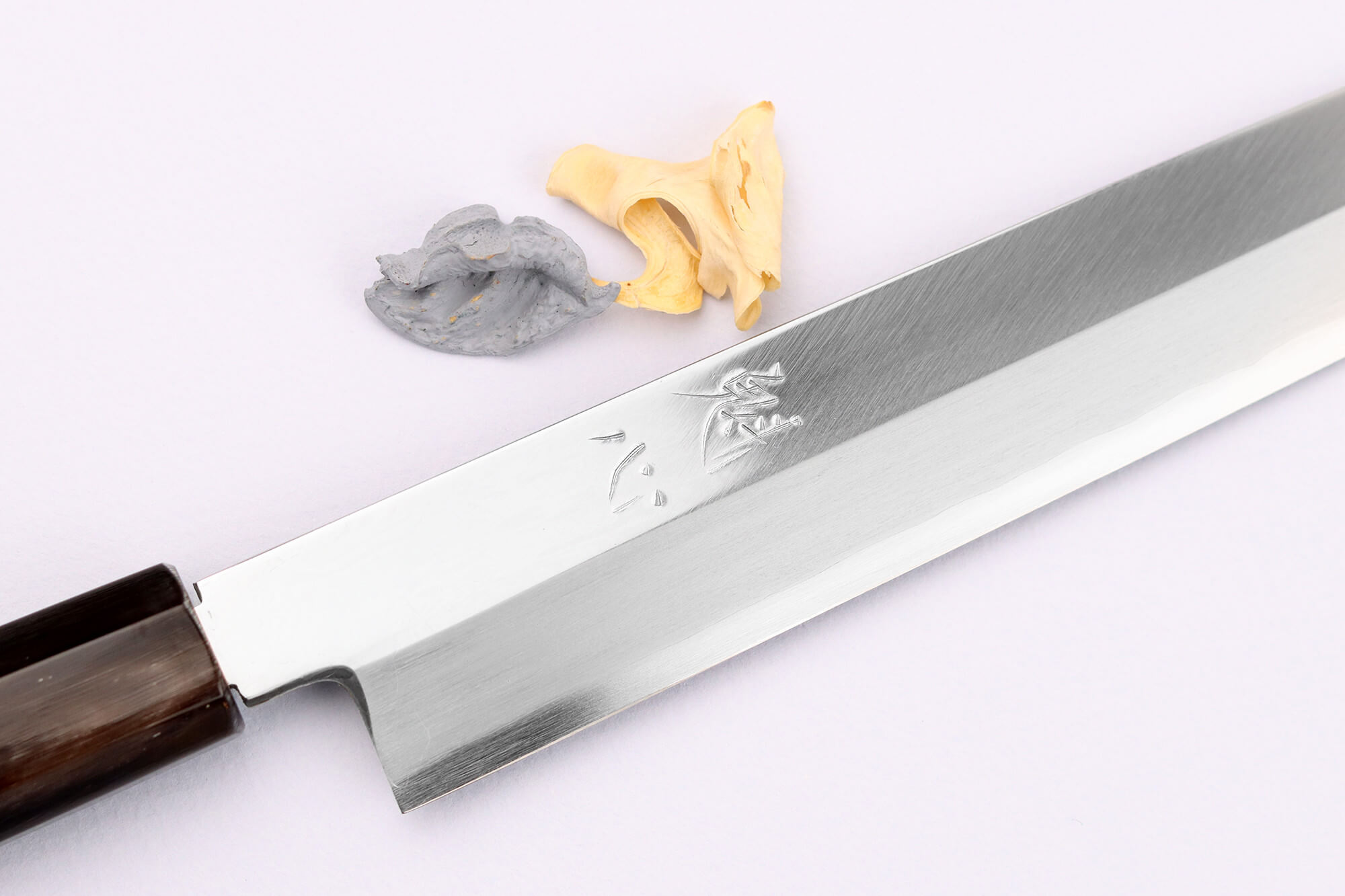Ce yanagiba est le fruit du travail de Shogo Yamatsuka, forgeron originaire de Sakai. Fils d’un artisan coutelier, il a découvert très jeune l’univers de la forge et s’est naturellement formé auprès de son père. Spécialiste de l’acier Ginsan, Yamatsuka-san lui a transmis tout son savoir-faire sur cet alliage de qualité. Déterminé à suivre cette voie, Shogo a consacré près de 30 ans à perfectionner la maîtrise du forgeage à chaud du Ginsan, devenant ainsi le seul forgeron à posséder une telle expertise. Son dévouement et son talent ont été salués par le ministère japonais de l’Économie, du Commerce et de l’Industrie, qui lui a attribué le prestigieux titre de Maître Artisan Traditionnel.