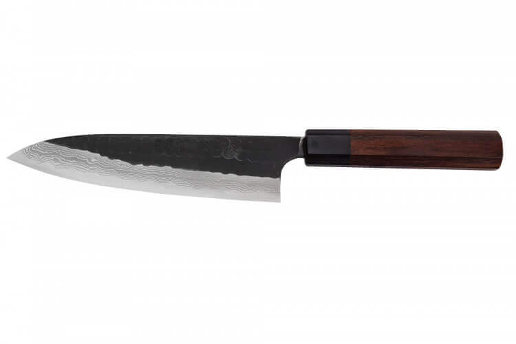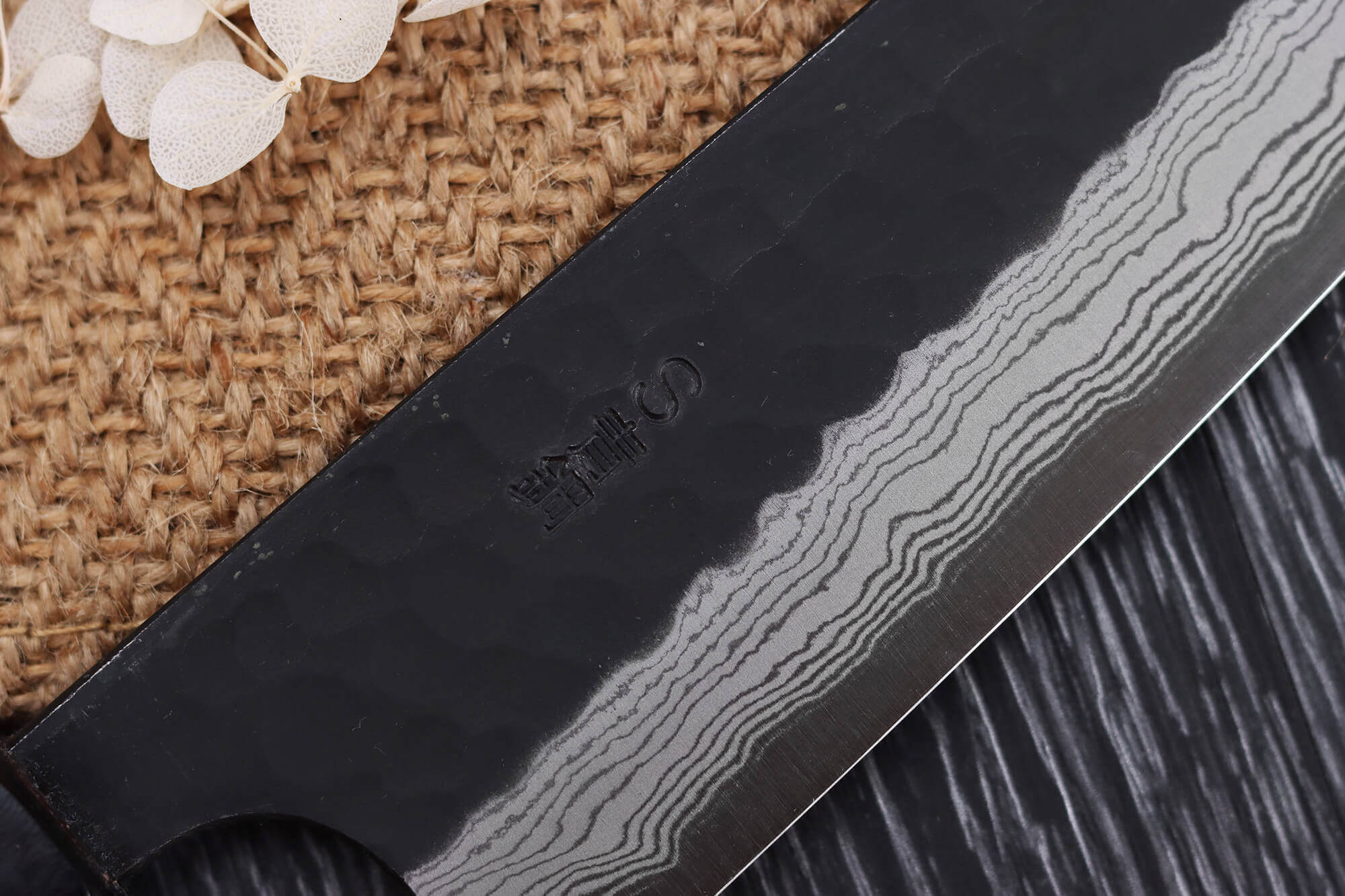 Enfin, la lame du couteau japonais a été martelée avec élégance à l'aide d'un poinçon. Cela forme des sortes d'alvéoles qui ajoutent au caractère du couteau. Le martelage présente en plus l'avantage de fonctionner un peu comme les alvéoles en empêchant les aliments de coller à la lame lors de leur découpe.