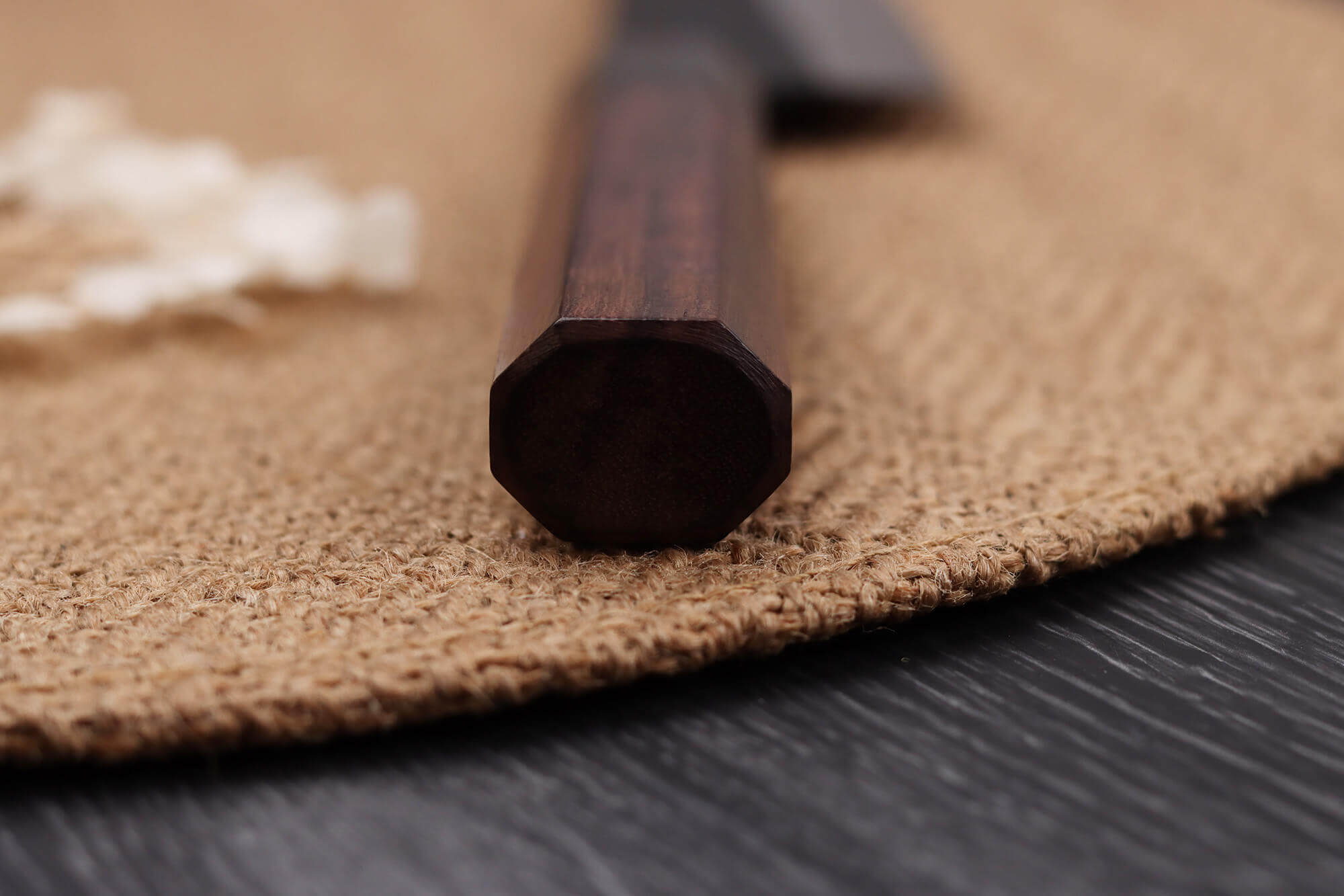 Le haut de la lame présente une superbe finition brute de forge. C'est une finition traditionnelle qui confère un aspect mat et sombre à la lame, elle est très appréciée pour son authenticité par les chefs japonais. Un parfait contraste entre le haut et le bas habille la lame !