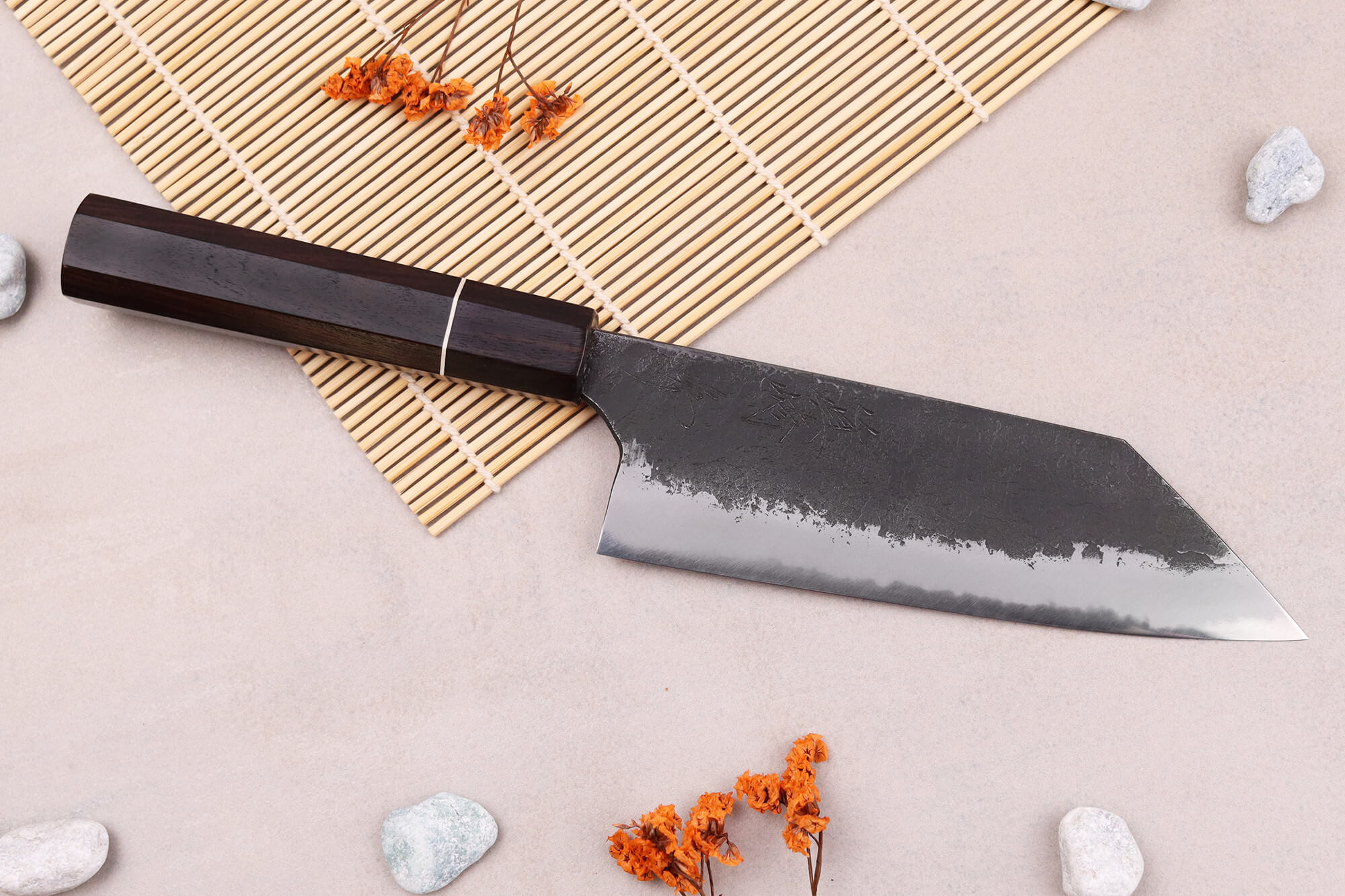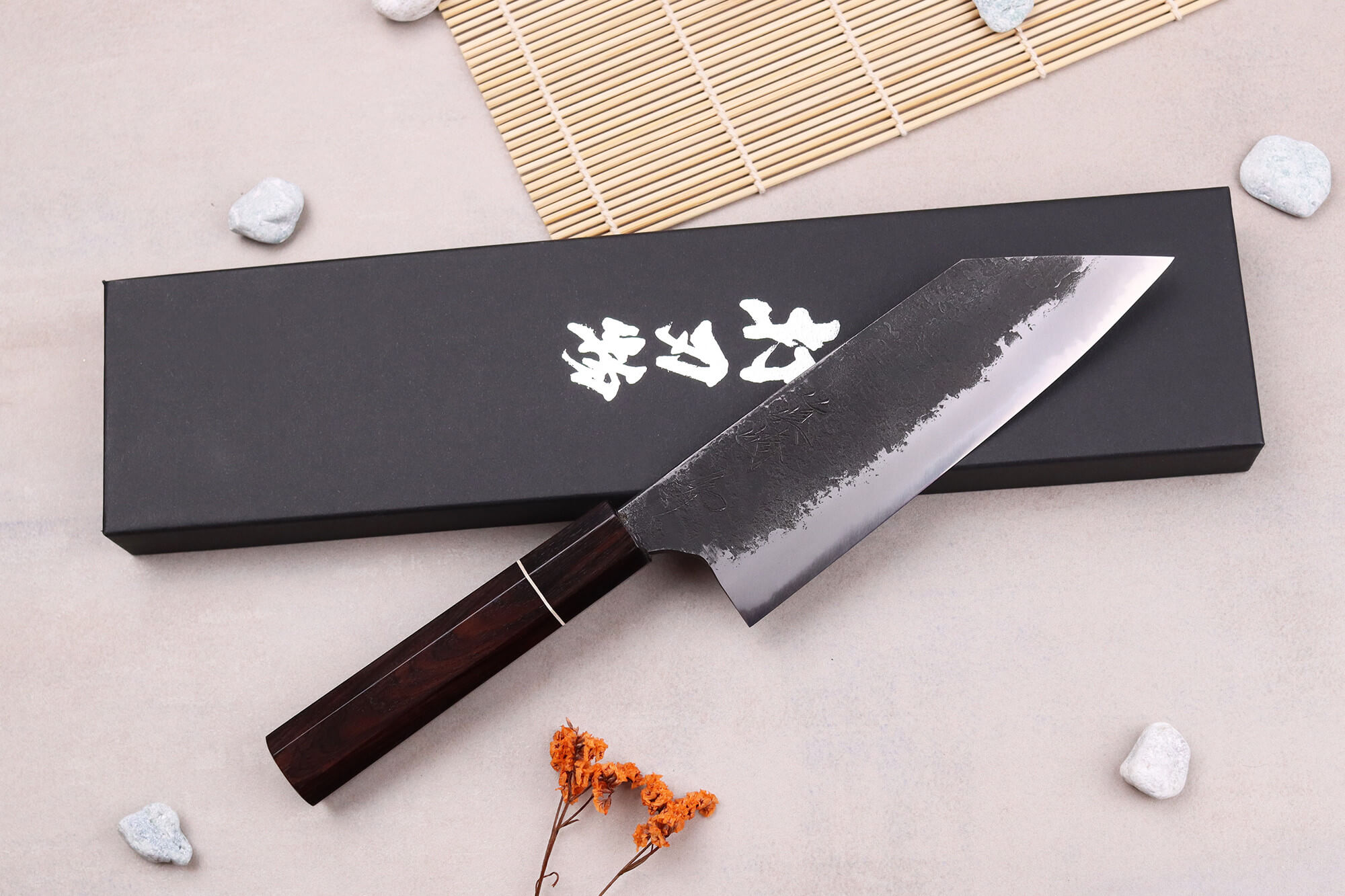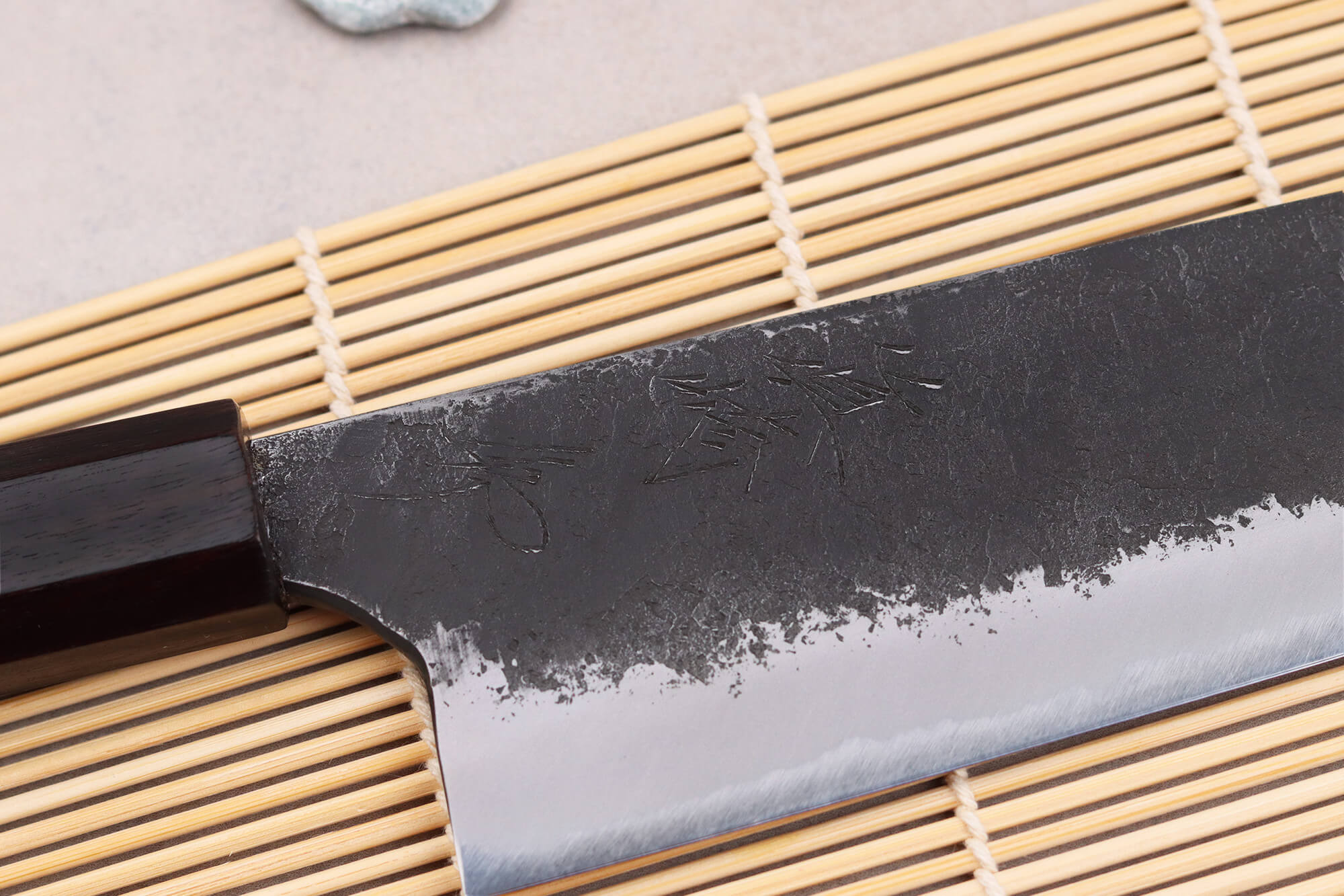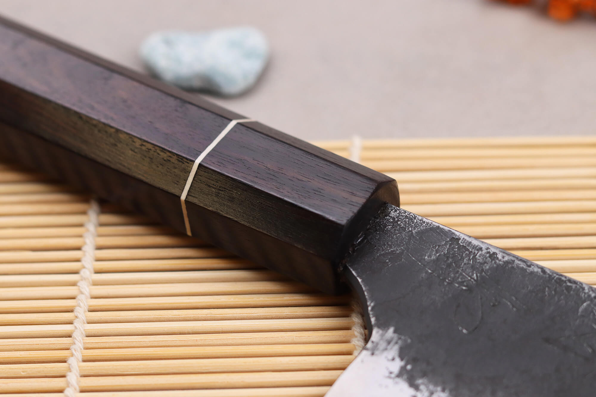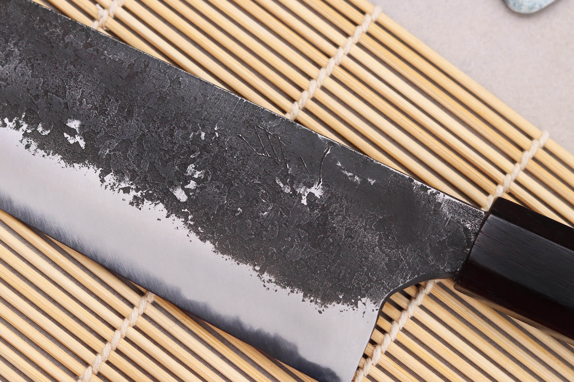 Naoki Mazaki étant aussi maître aiguiseur, il a personnellement affûté le couteau à la main en utilisant différentes pierres à aiguiser pour obtenir un tranchant impeccable. Votre couteau doit d'ailleurs être aiguisé à la pierre afin de maintenir ses performances lorsque le besoin se fait sentir.