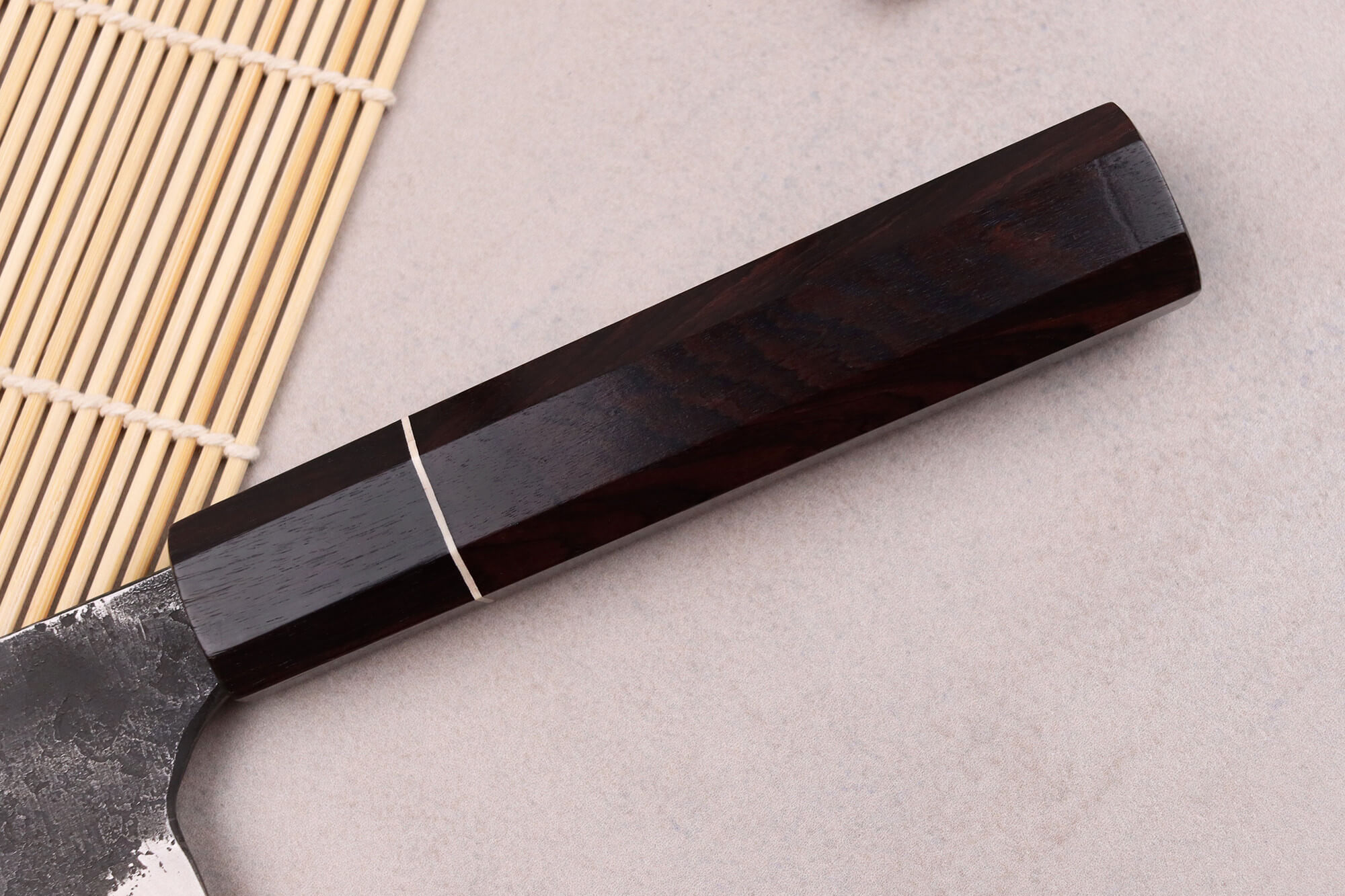 Ce couteau bunka possède un manche fait en bois d'ébène, un bois précieux aux tons chauds qui résiste très bien contre les fissures grâce à sa densité. Le bois d'ébène convient tout à fait à une utilisation régulière, voire quotidienne en cuisine en raison de sa durabilité. Le manche est complété par une mitre en corne de buffle noire, qui apporte équilibre et harmonie au couteau. Les deux matériaux sont élégamment délimités par un anneau en micarta blanc.