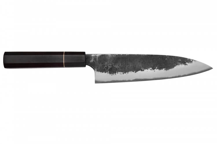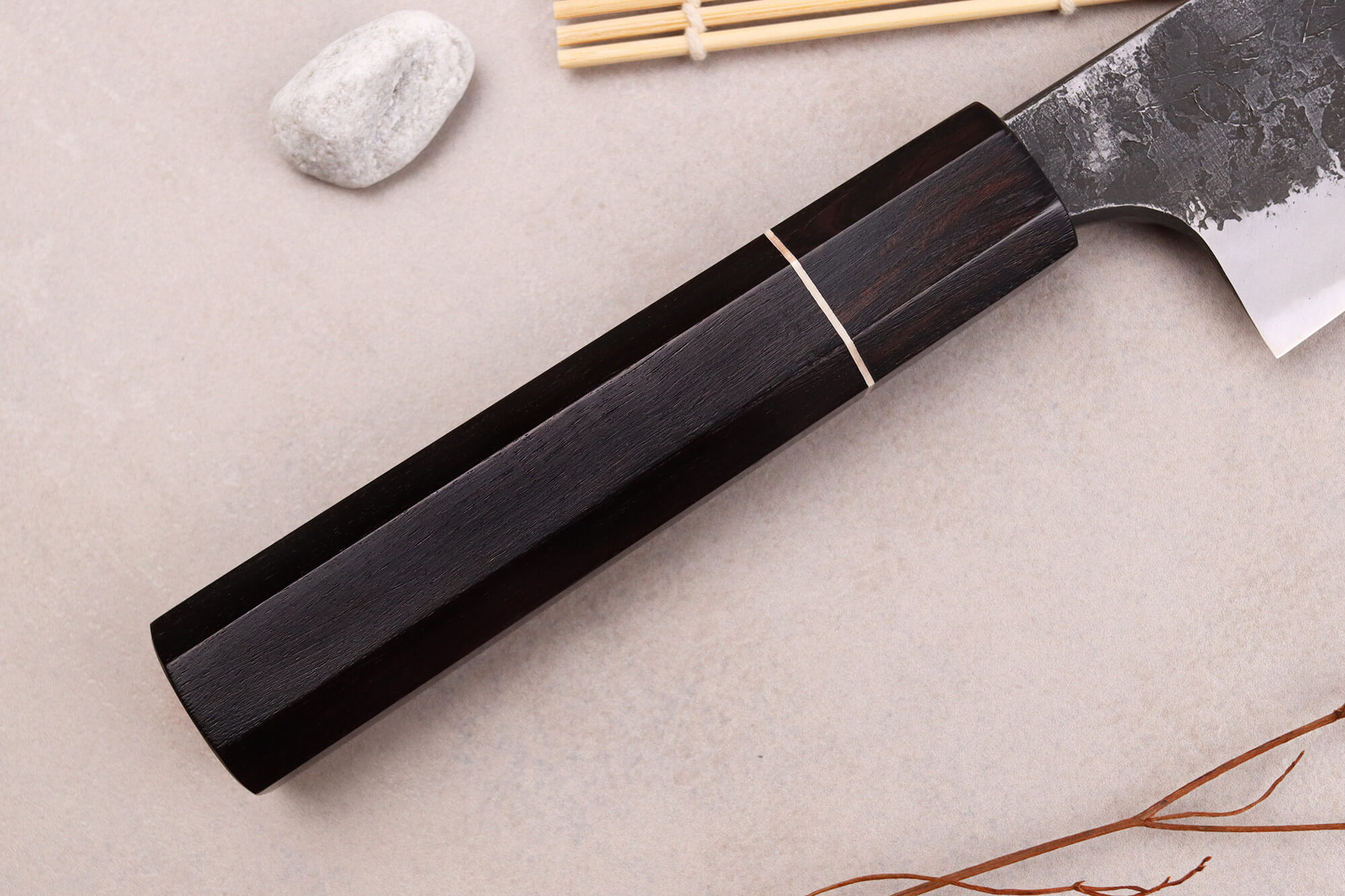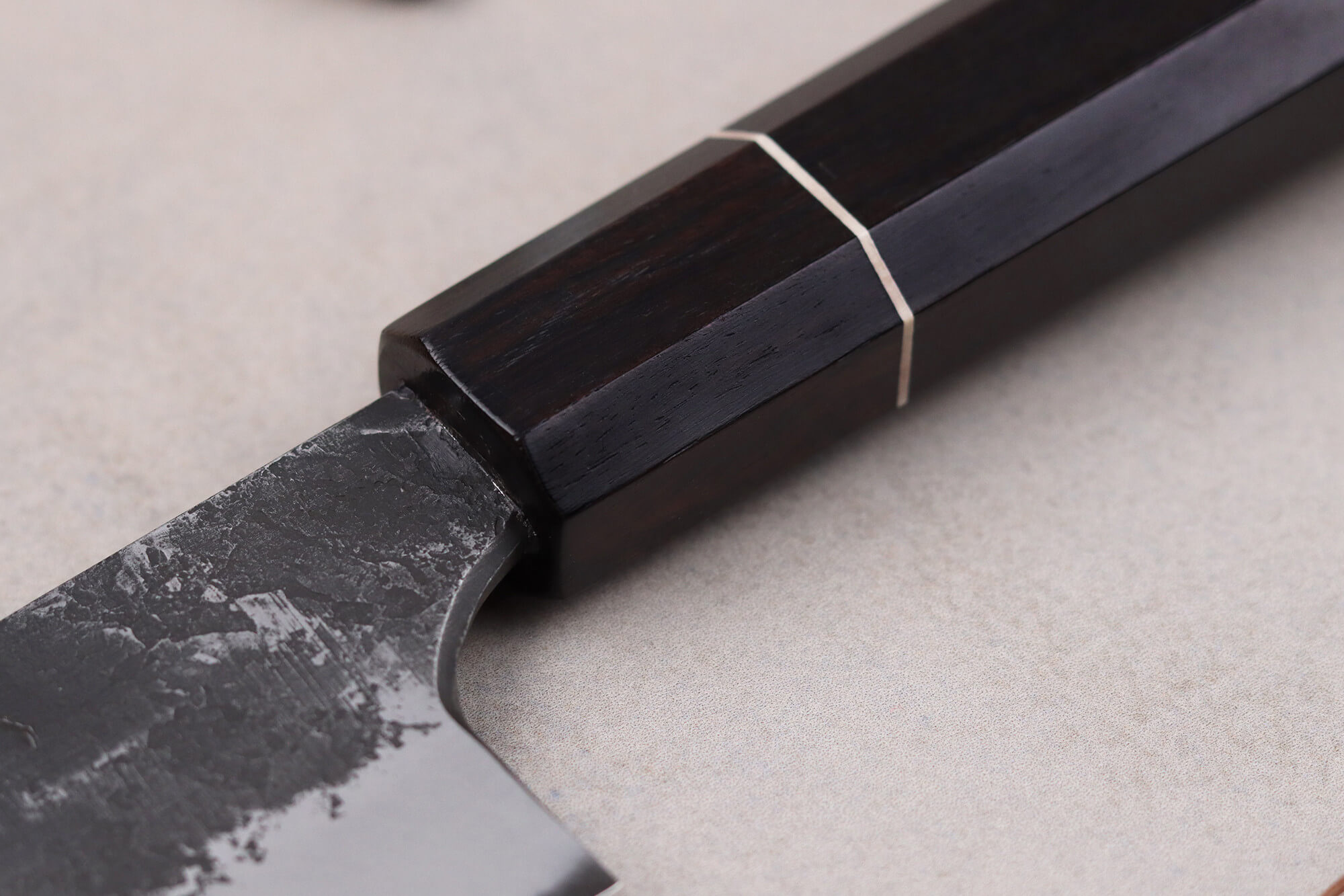 Enfin, Naoki Mazaki étant également maître aiguiseur, il a lui-même affûté la lame sur différentes pierres pour vous offrir un tranchant impeccable. Il est important de noter que votre couteau devra être aiguisé à la pierre lorsque cela deviendra nécessaire.