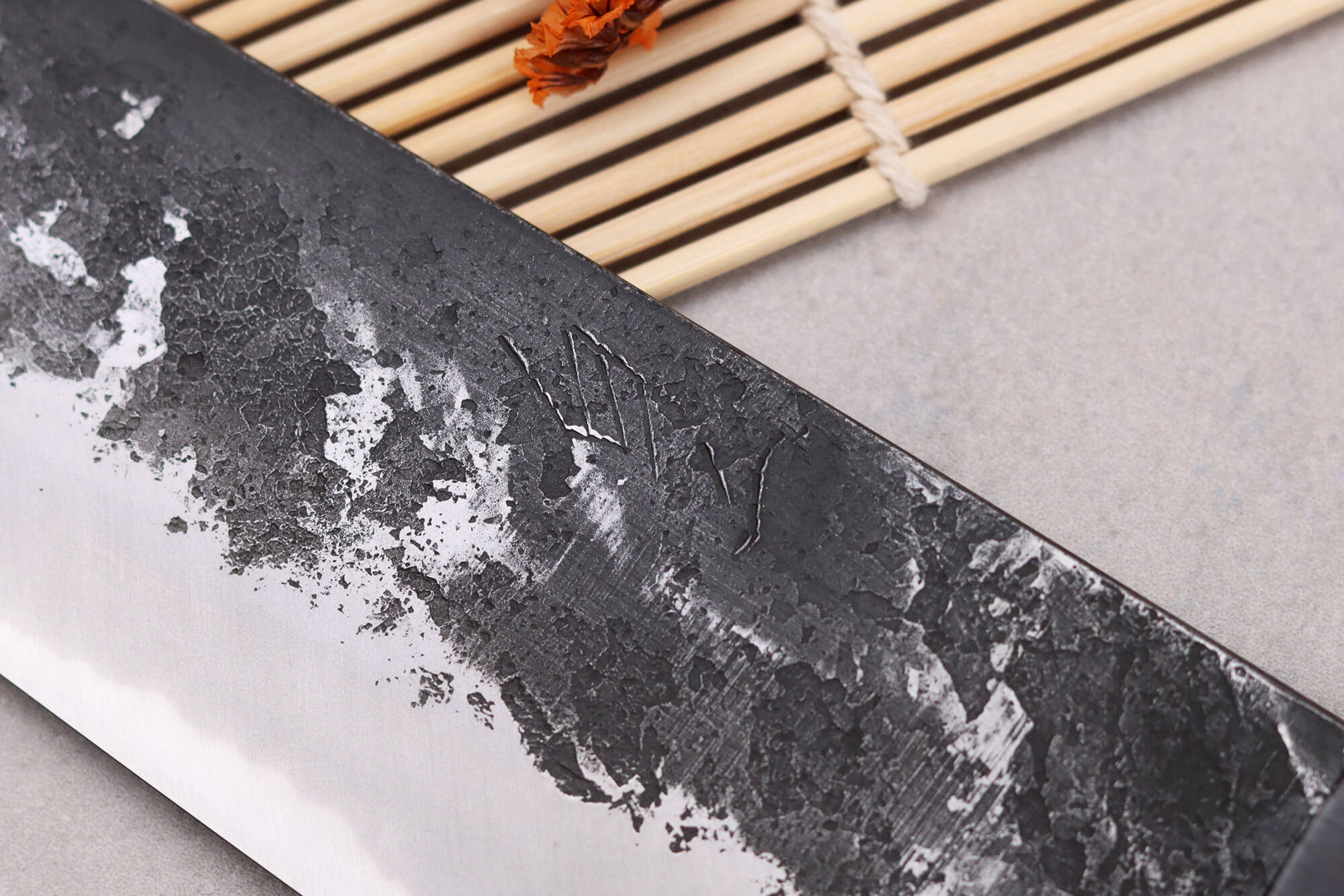 La lame bénéficie d'une magnifique finition Black Nashiji, qui lui confère un aspect authentique et rustique. On pourrait penser qu'elle n'a pas été polie et qu'elle conserve donc sa couleur noire. La finition Black Nashiji rappelle la finition brute de forge et a donné son nom à la gamme dont provient votre couteau. De plus, vous pouvez remarquer des kanji traditionnels gravés de chaque côté de la lame, ce qui renforce son authenticité.