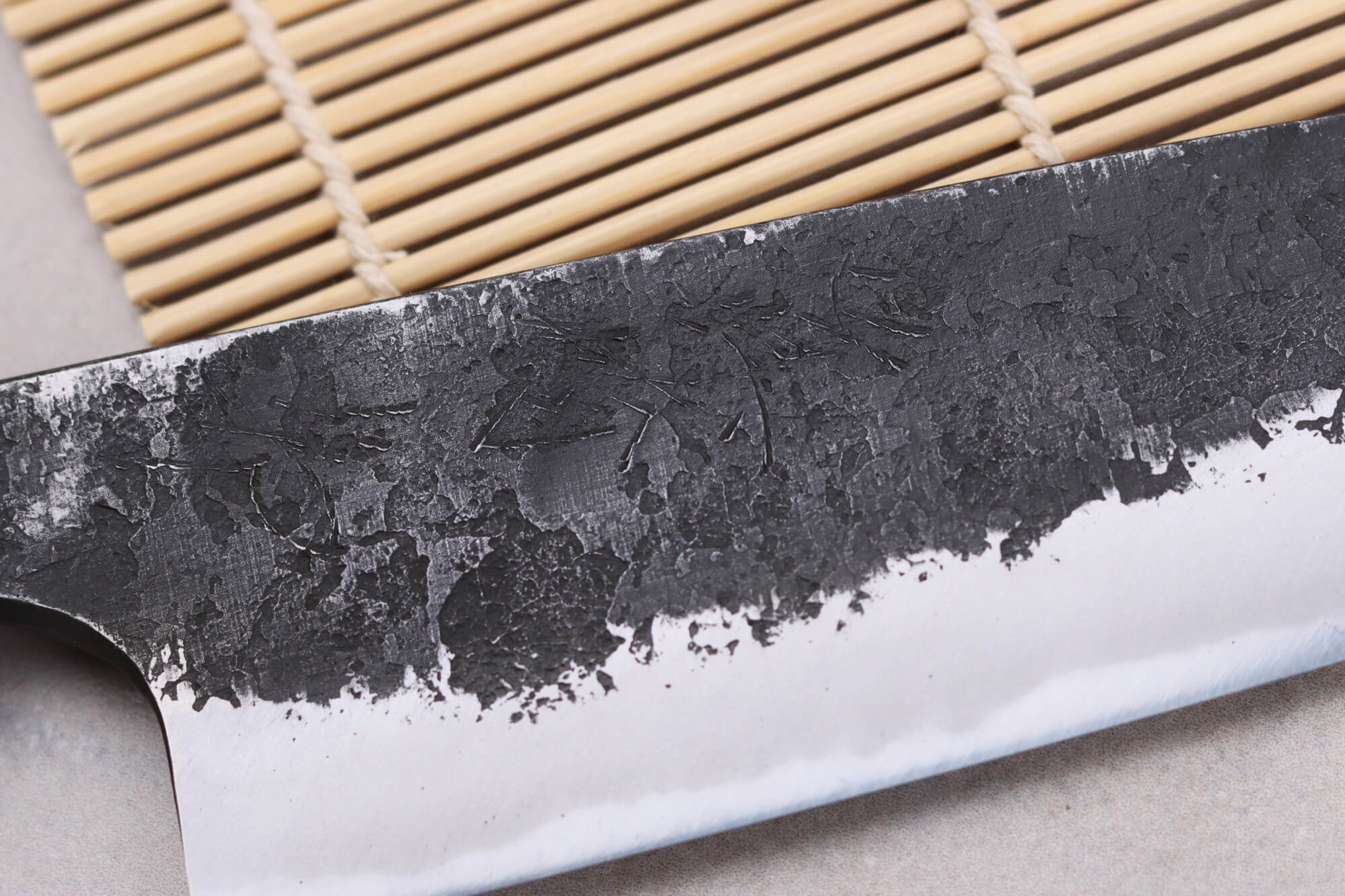 Naoki Mazaki a fait le choix de l'acier japonais Shirogami #2, également connu sous le nom de White Steel 2, pour créer le cœur du couteau. Cet alliage très prisé par les chefs est fabriqué par Hitachi, le célèbre sidérurgiste, qui fournit de nombreux forgerons. L'acier Shirogami #2 est réputé pour sa grande pureté et sa structure homogène, qui peut être observée au microscope. Il est considéré comme l'acier le plus proche du tamahagane qui est utilisé pour forger les épées traditionnelles. Cet alliage est également facile à affûter, ce qui garantit une grande précision de coupe. Avec un taux de carbone d'environ 1,3%, il atteint une dureté de près de 62 HRC.