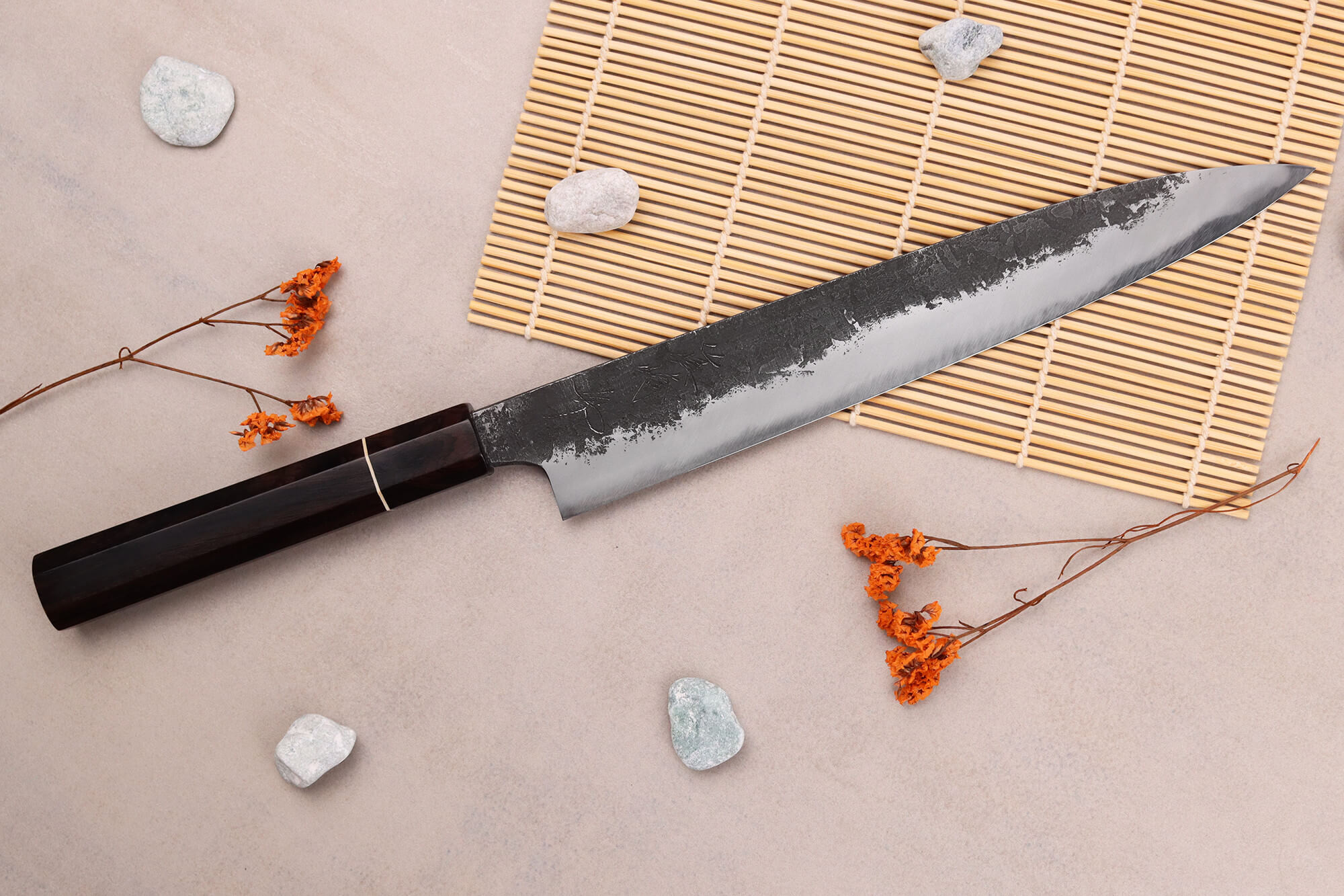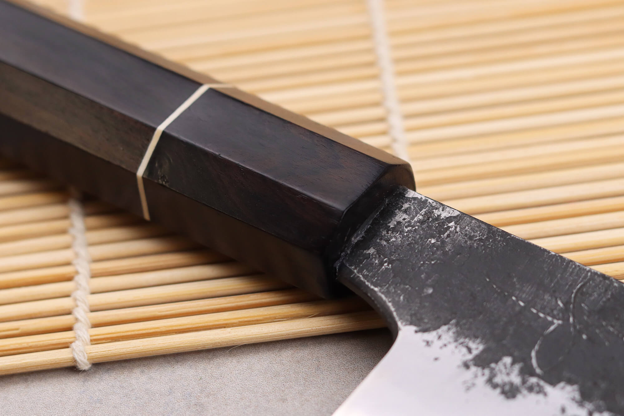 Votre couteau sujihiki est doté d'un manche en bois d'ébène, une essence luxueuse reconnaissable à ses tons chauds. Ce bois dense est résistant aux fissures, ce qui en fait le choix idéal pour une utilisation régulière en cuisine. Pour compléter le manche, une mitre en corne de buffle noire a été ajoutée. Elle permet d'équilibrer et d'harmoniser le couteau. Un fin anneau en micarta blanc sépare avec élégance les deux matériaux.