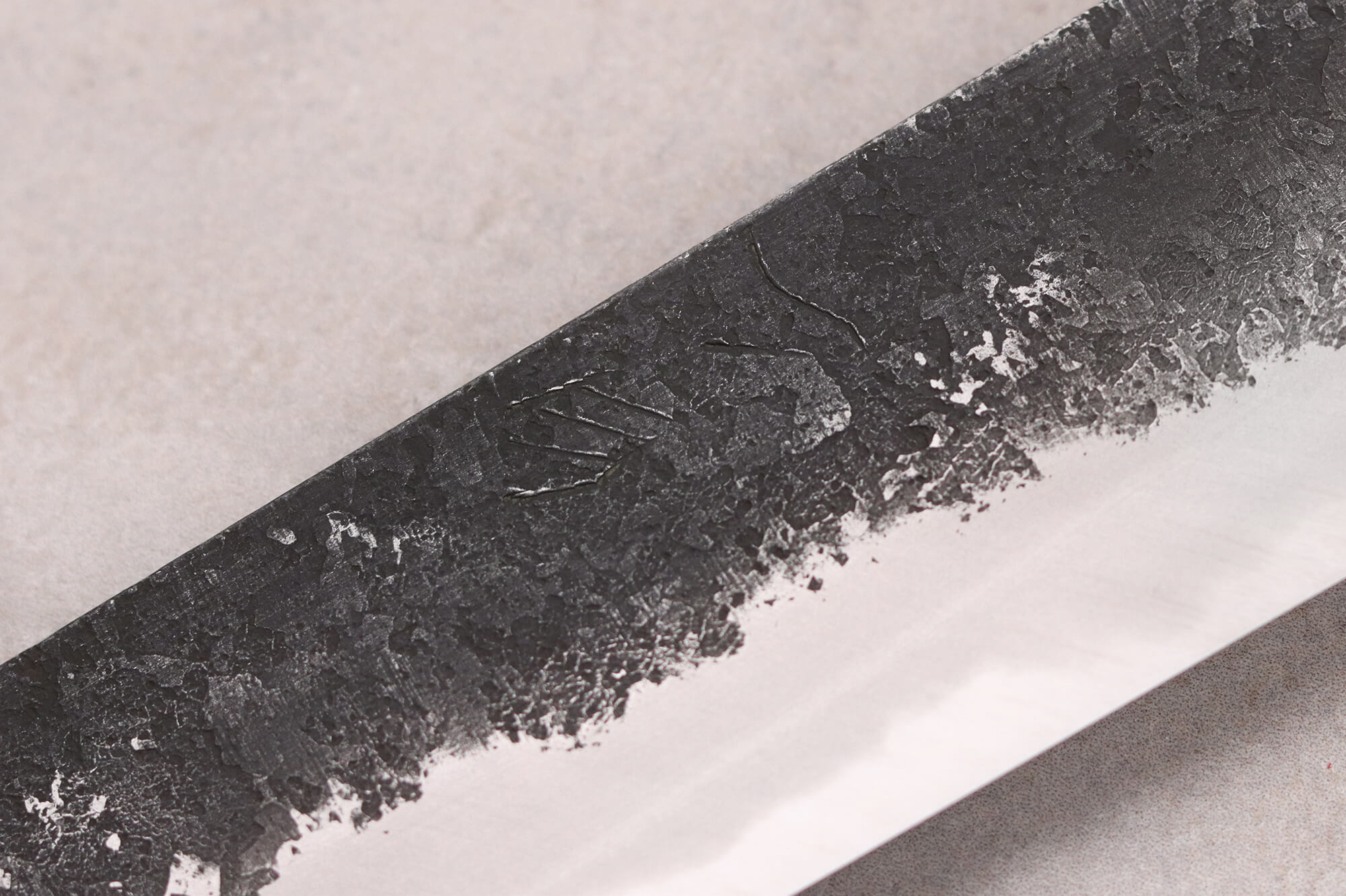 Ce noyau rigide en Shirogami #2 est ensuite enveloppé d'une couche de fer plus doux, formant une structure en sandwich qui se replie de chaque côté du noyau. Cette couche supérieure lui apporte de la souplesse tout en le protégeant. La structure rend le couteau moins sensible aux chocs, et donc plus résistant face à la casse lors des découpes. Les différentes couches d'acier créent un élégant motif ondulé aléatoire visible tout le long du tranchant.
