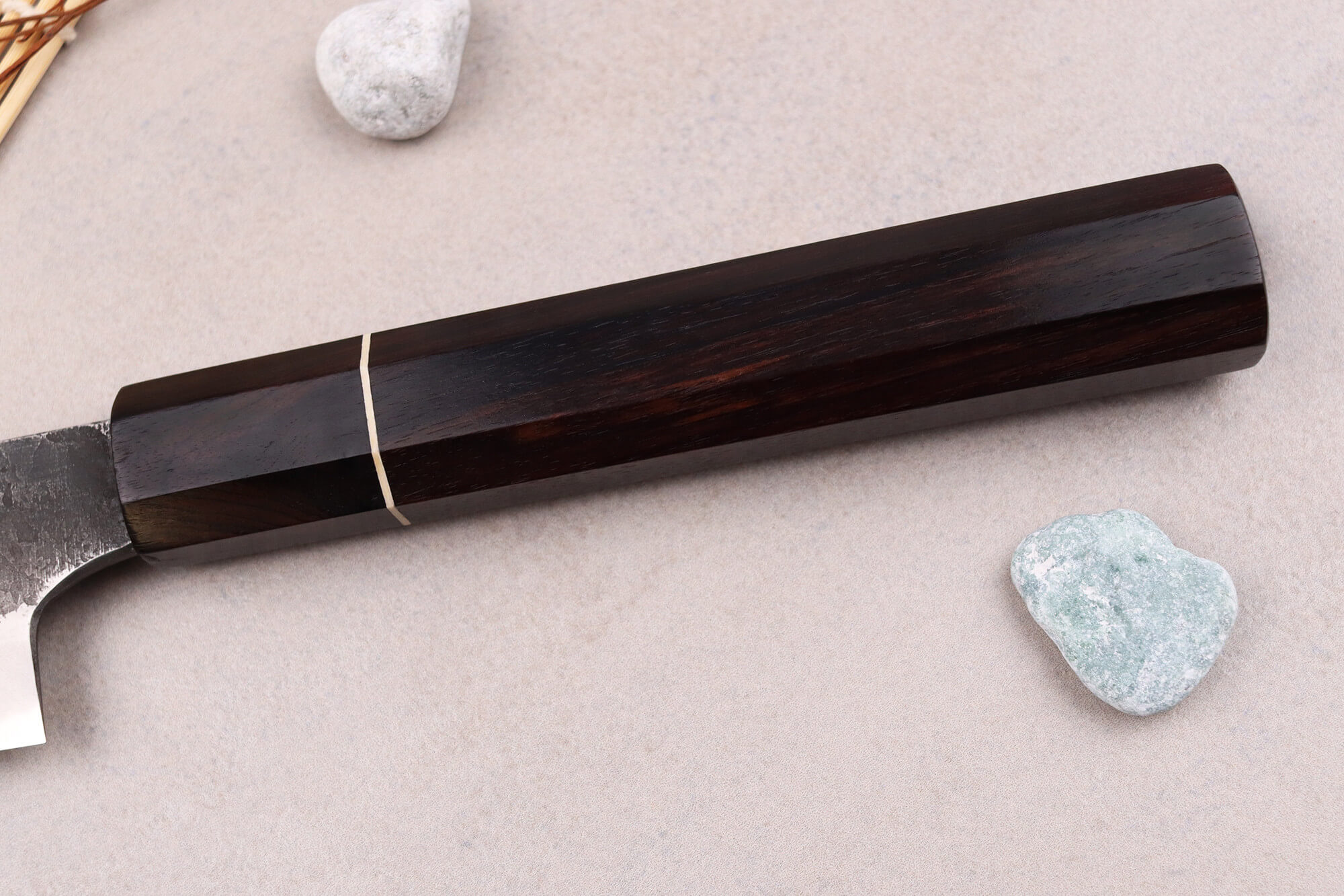 Pour finir avec la lame, Naoki Mazaki l'a personnellement affûté car il est aussi maître aiguiseur. En passant la lame sur plusieurs pierres à aiguiser, il vous garantit un tranchant des plus nets. Notez d'ailleurs que votre couteau devra être aiguisé à la pierre lorsque le besoin se fera sentir.