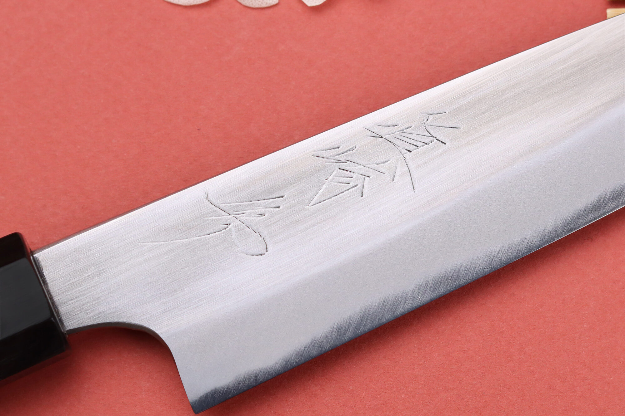 De superbes kanji sont gravés sur les faces avant et arrière de la lame, lui conférant un caractère authentique. La lame a aussi été polie à la main et présente une élégante finition miroir.