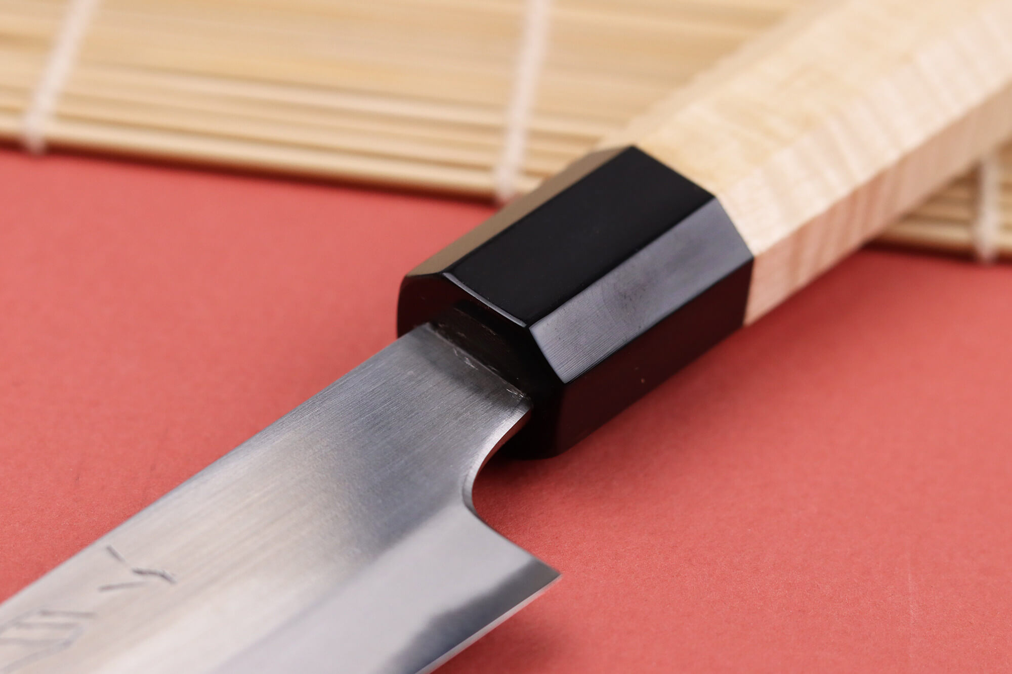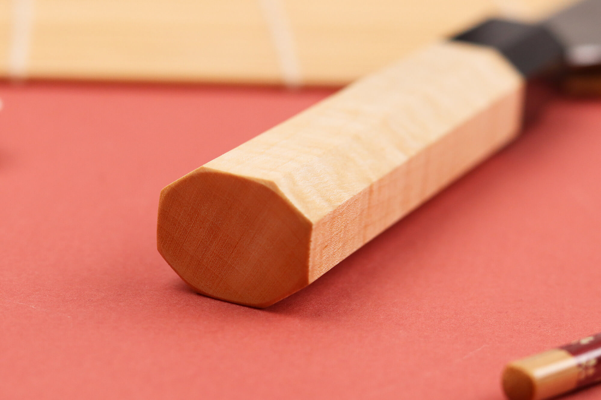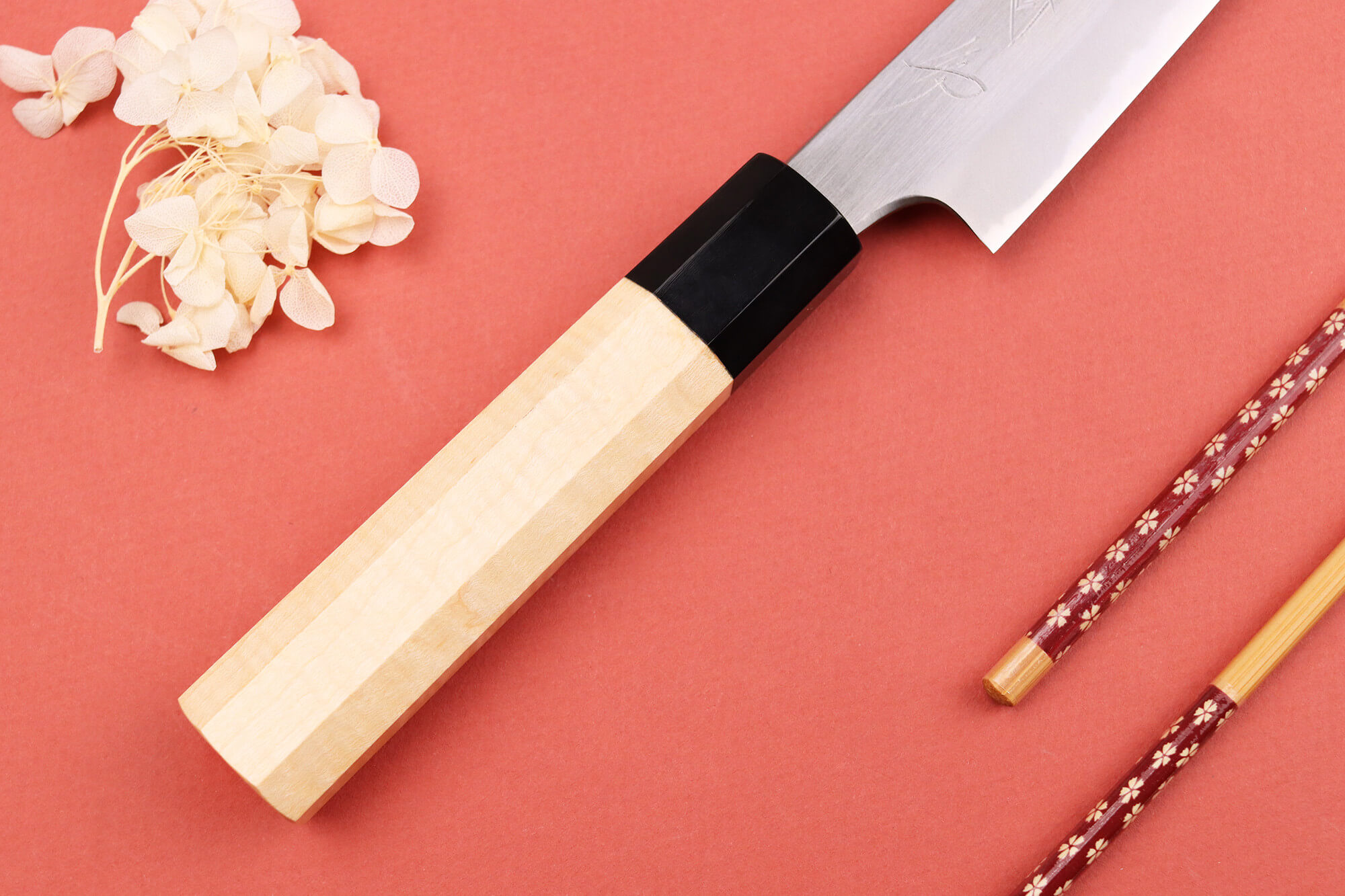Naoki Mazaki étant également maître aiguiseur, il a lui-même affûté le couteau en utilisant plusieurs pierres à aiguiser pour obtenir un tranchant impeccable. D'ailleurs, chaque fois que le besoin se fait sentir, il est recommandé d'aiguiser votre couteau à la pierre.