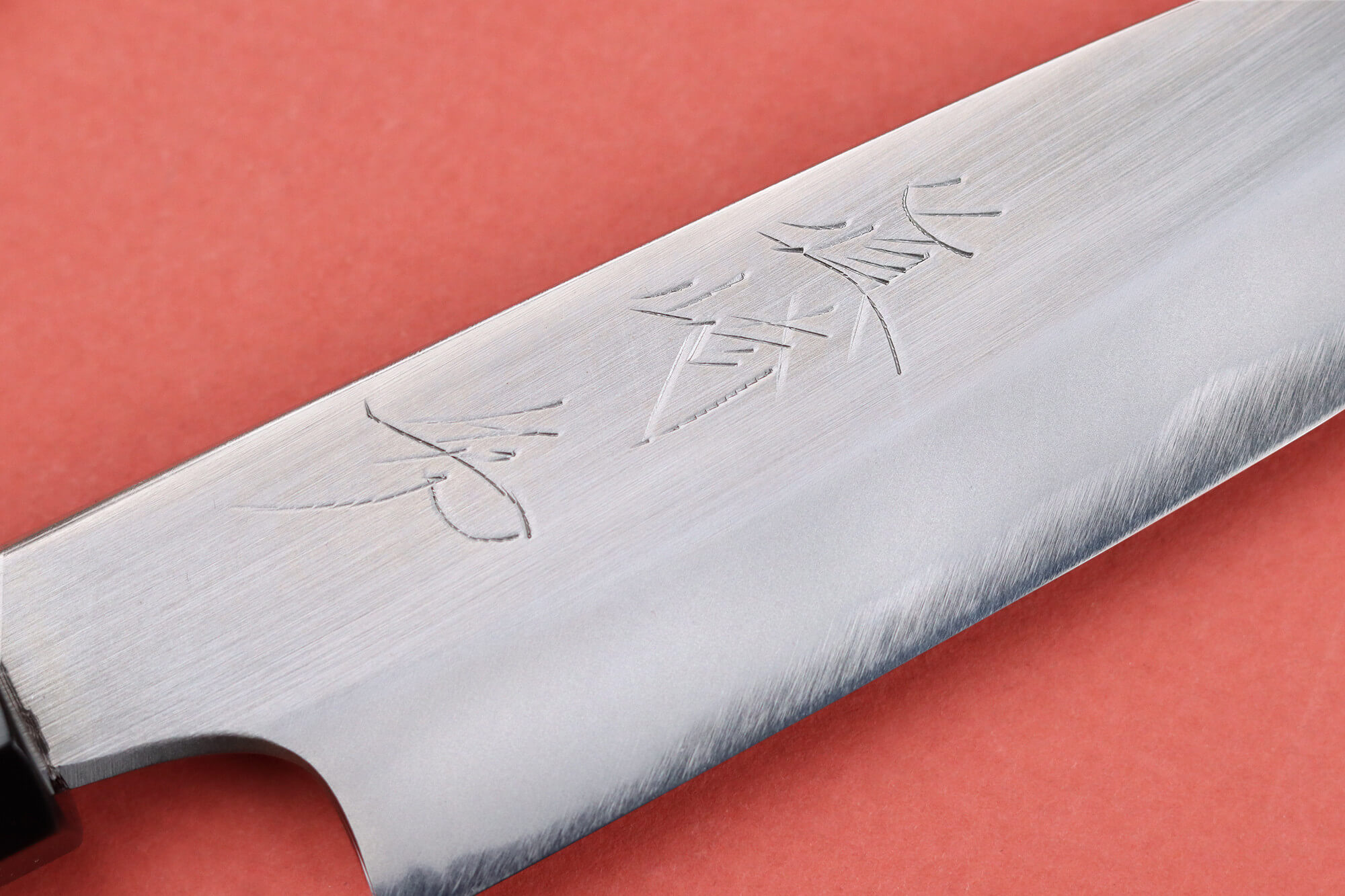 De magnifiques kanji authentiques ont été gravés à la main de chaque côté de la lame, ce qui lui ajoute une touche de caractère supplémentaire. Ensuite, la lame a été soigneusement polie manuellement pour obtenir une finition miroir d'une grande élégance.