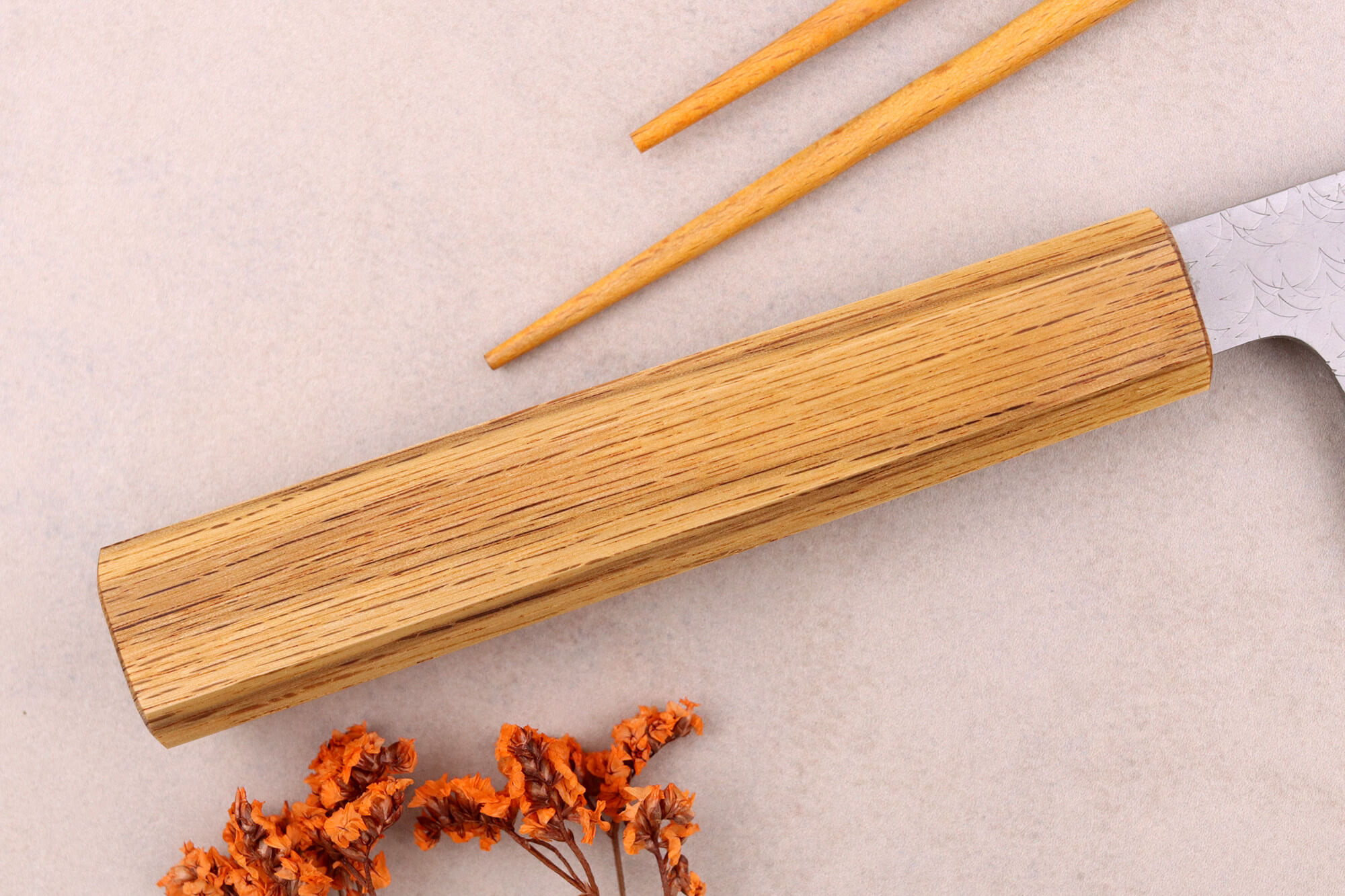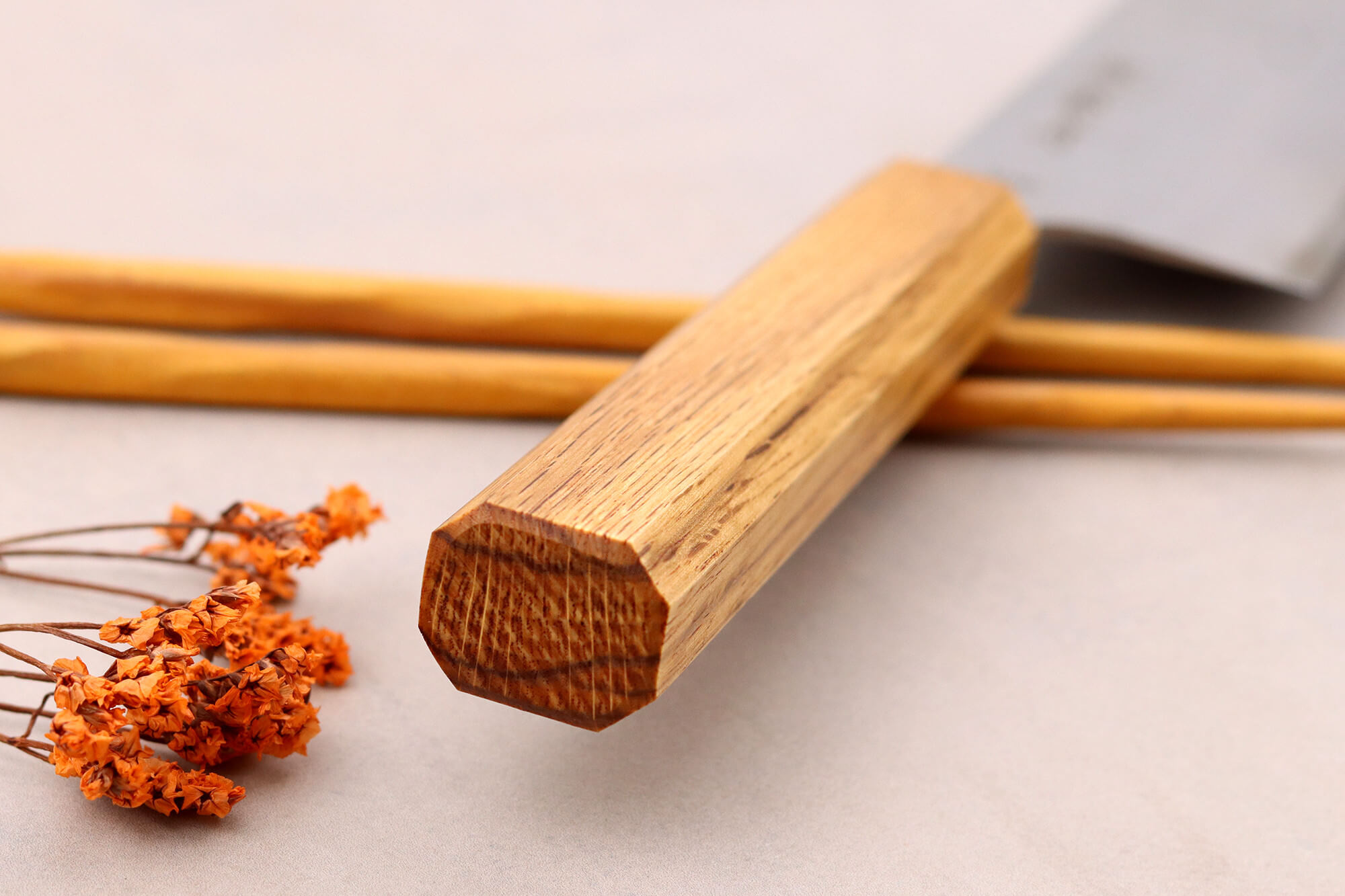 Votre couteau artisanal japonais est équipé d’un manche en chêne, un bois local robuste, léger et naturellement agréable en main. Ce bois a été laqué pour faire ressortir son veinage tout en lui apportant une meilleure solidité. Son toucher naturel est très apprécié en cuisine japonaise traditionnelle.