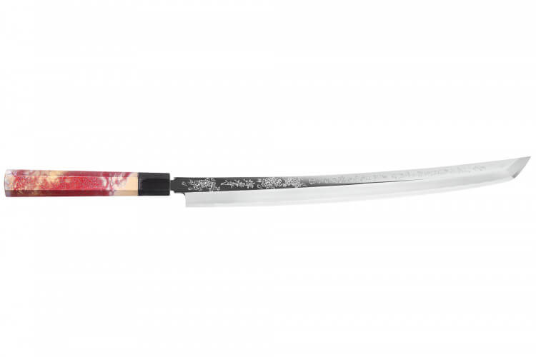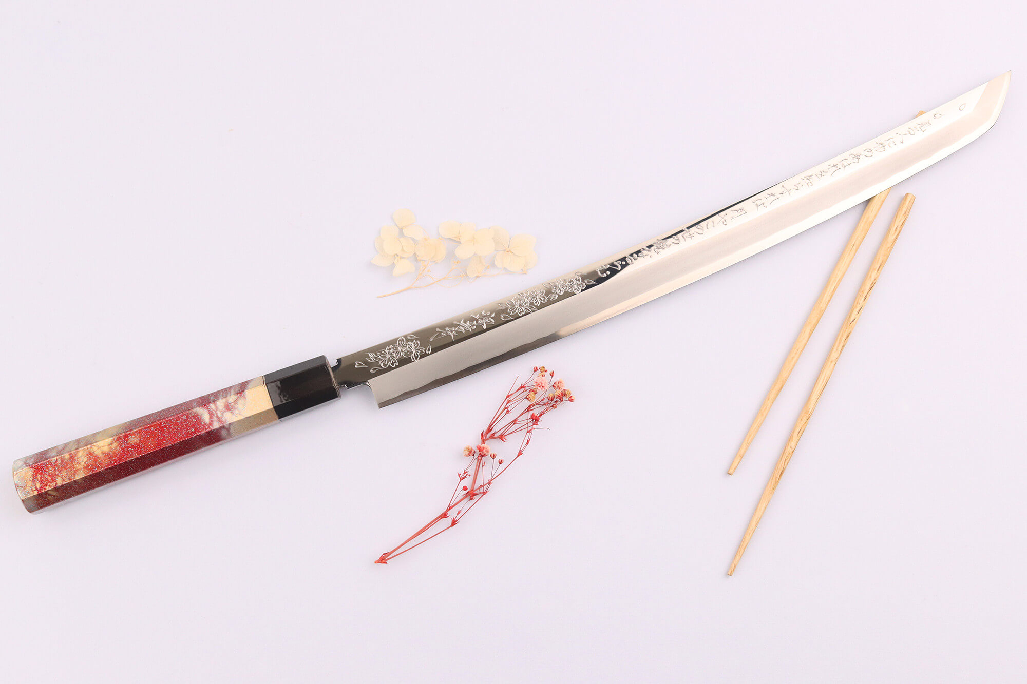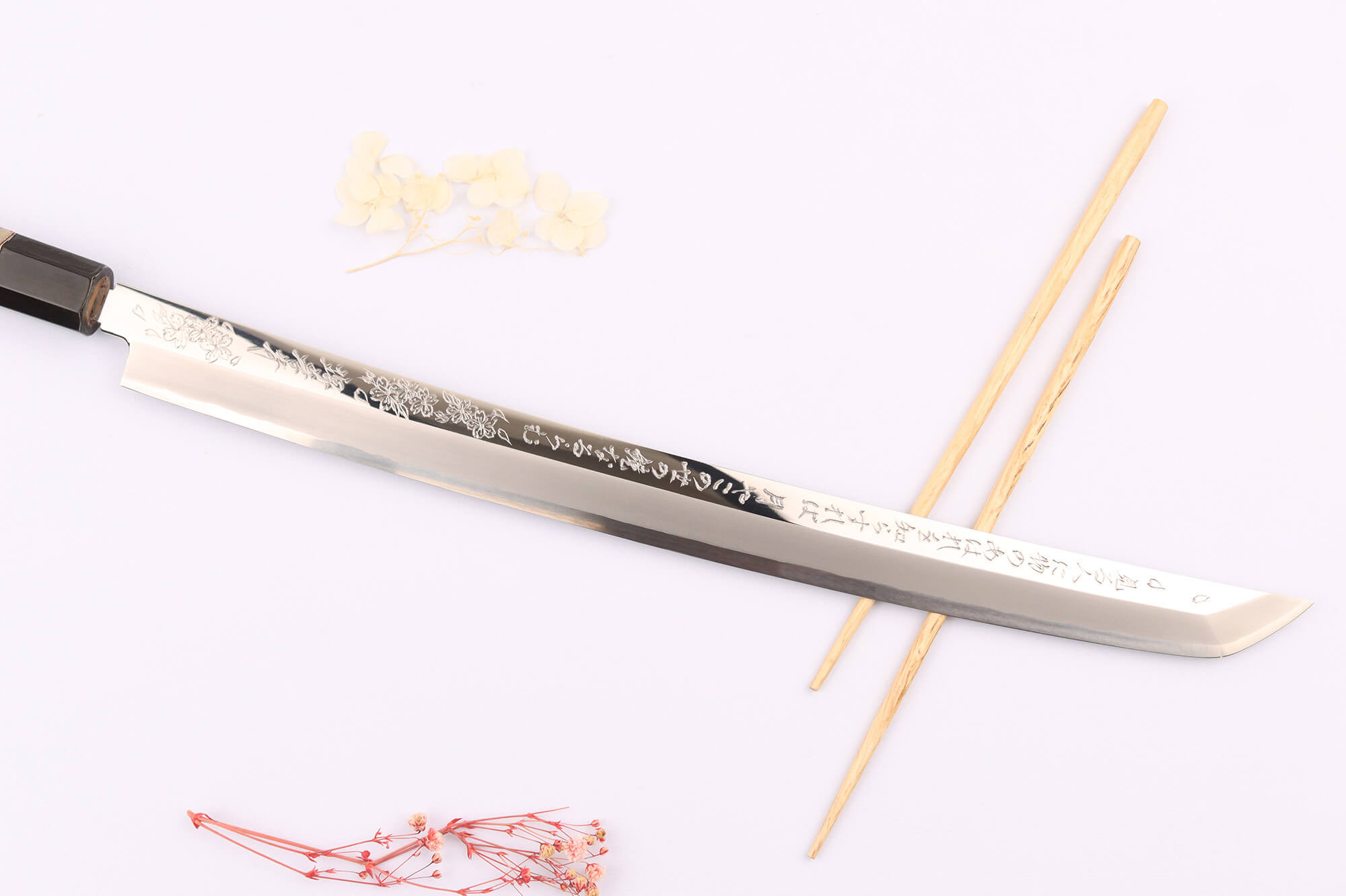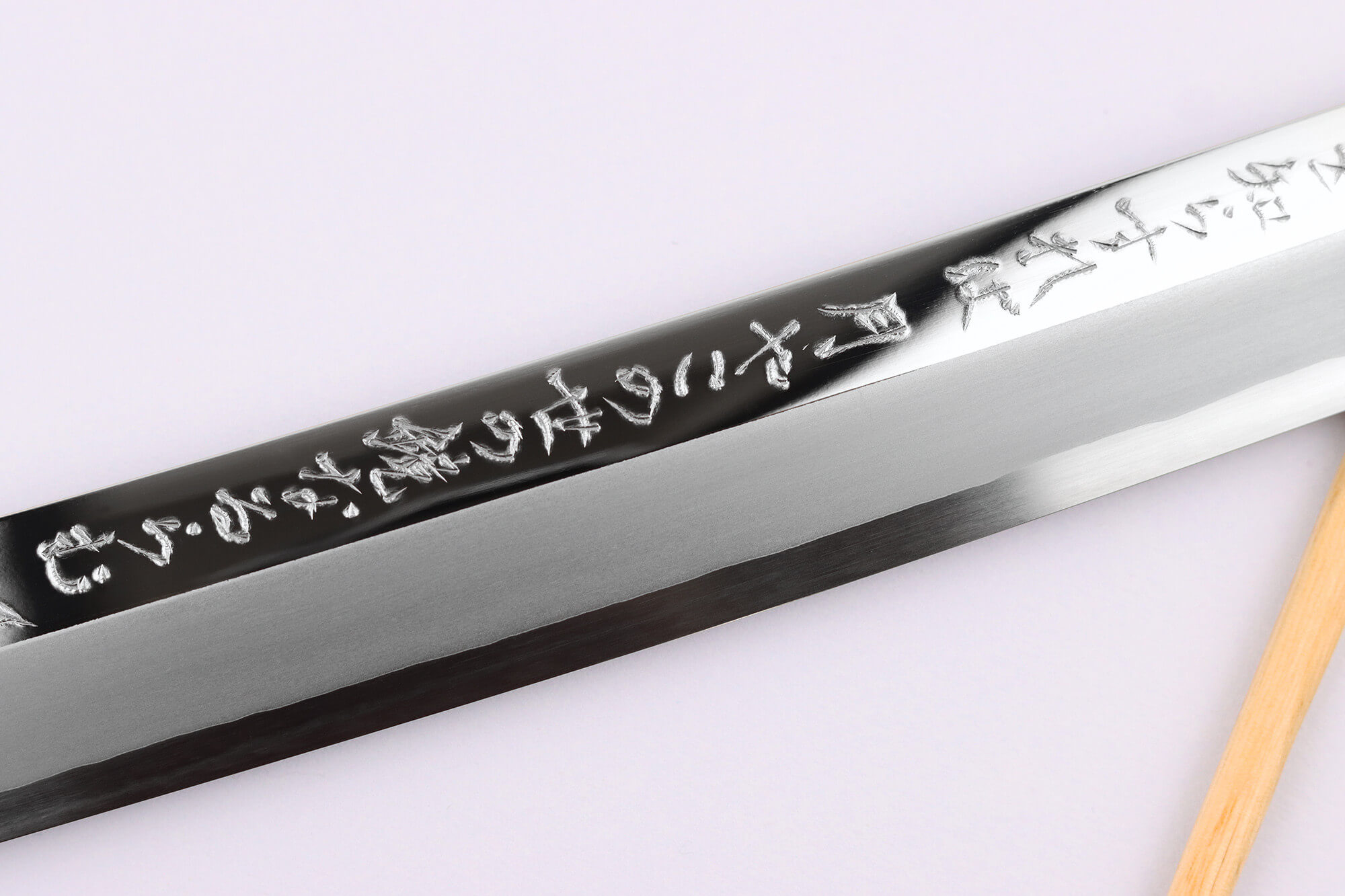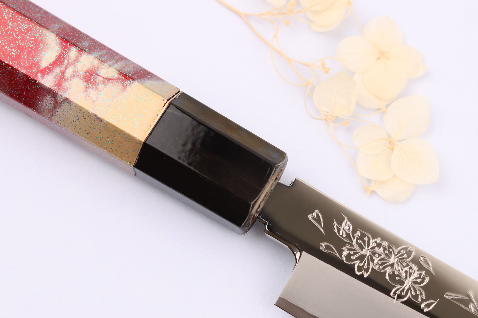 Ce qui rend la lame exceptionnelle, ce sont ses gravures artisanales réalisées par Michiko Kubota, une artisane graveuse sur couteau originaire de Sakai. À l'aide d'un marteau et d'un poinçon, elle a délicatement sculpté des fleurs de sakura (fleurs de cerisier) et un waka, l'ancêtre du haiku, poème traditionnel japonais, qui contient 31 syllabes.