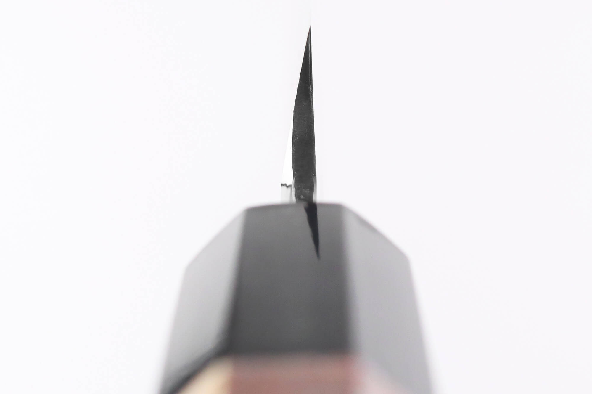 Le machi a été laissé apparent. Il s'agit de la petite partie en acier situé à l'intersection de la lame et du manche. On pourrait croire que la soie du couteau n'est pas parfaitement insérée dans le manche, mais cet écart est volontaire. Propre à la région de Sakai, il a pour but d'offrir un meilleur équilibre au couteau en jouant sur son centre de gravité pour une maniabilité et une précision optimales.