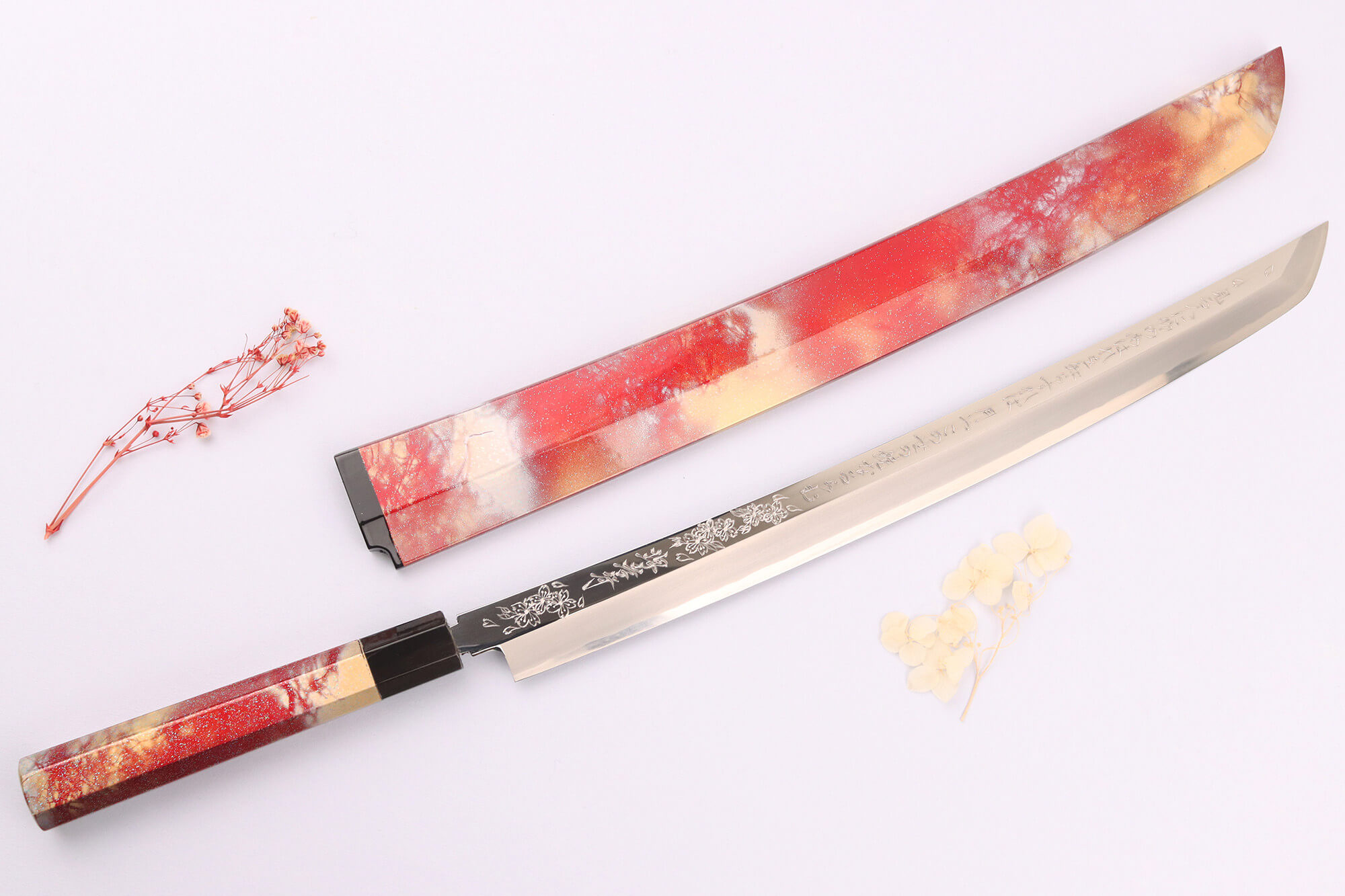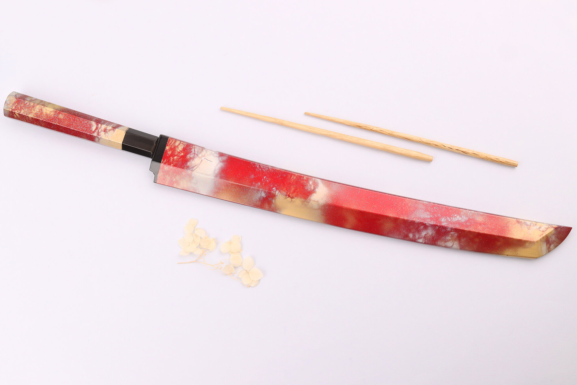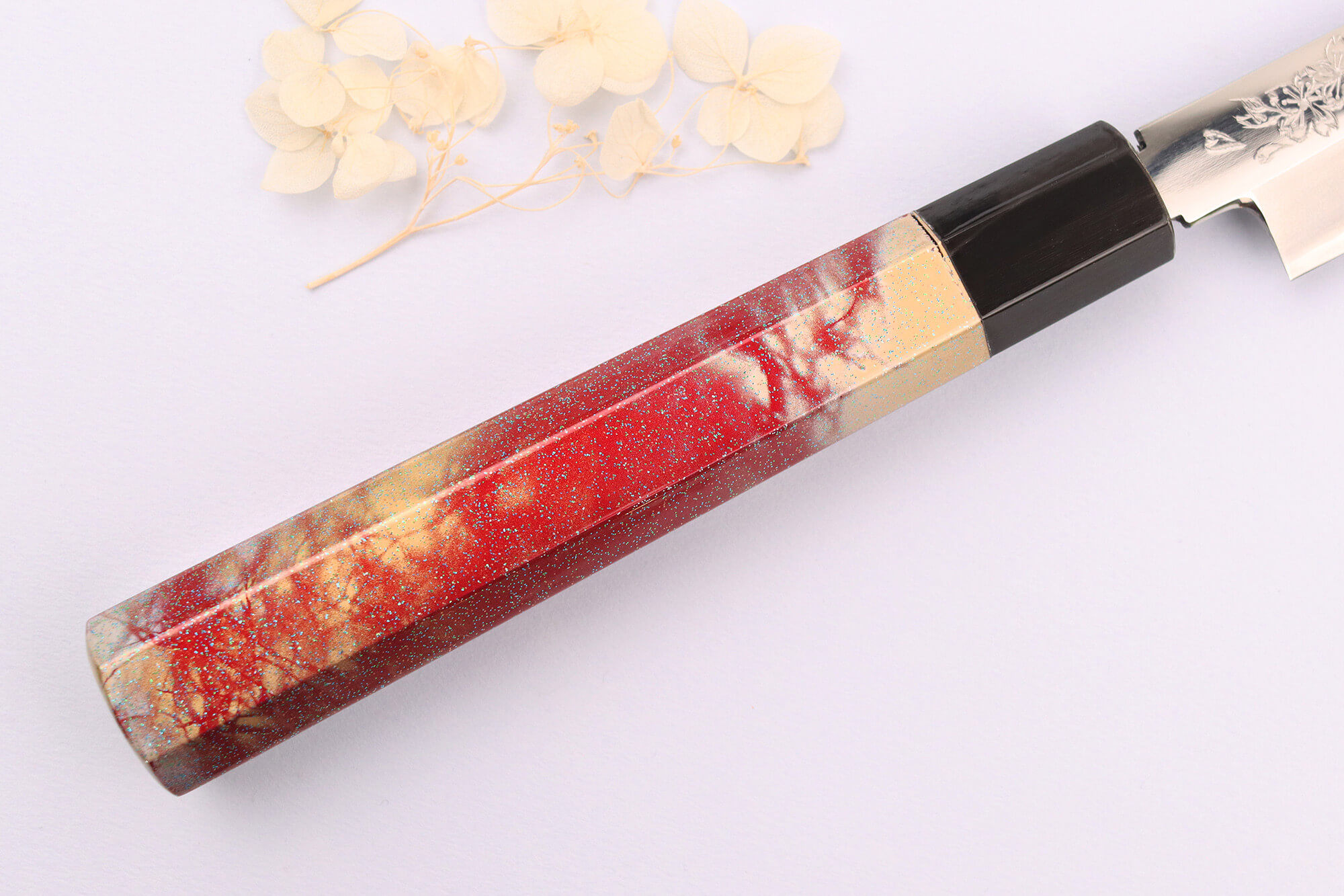 Le cerisier est un bois clair facile à teinter. Il présente ainsi un somptueux laquage Urushi Kijiro, technique traditionnelle de laque végétale, appliquée à la main. Le rendu visuel, rouge marbré d’or pailleté, évoque à la fois le ciel flamboyant du printemps et les pétales tombant des cerisiers. Chaque pièce est unique : la teinte et les motifs du laquage varient légèrement d’un couteau à l’autre.