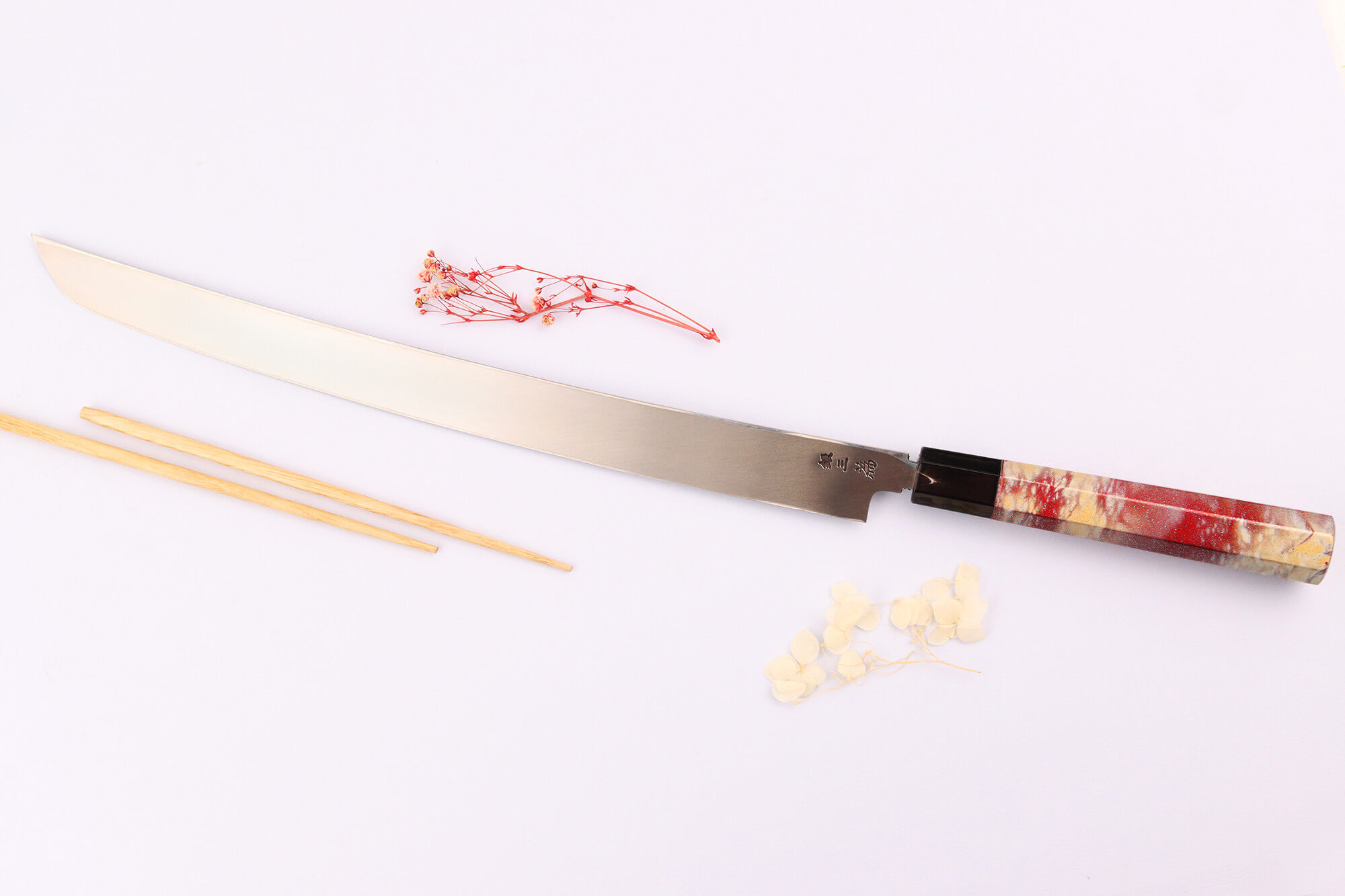 L'émouture de la lame est asymétrique, elle est idéale pour les découpes nettes et précises des sashimis. Cette lame convient à une utilisation par les cuisiniers droitiers. Elle a été polie miroir à la main, offrant un reflet tel de l'eau claire.