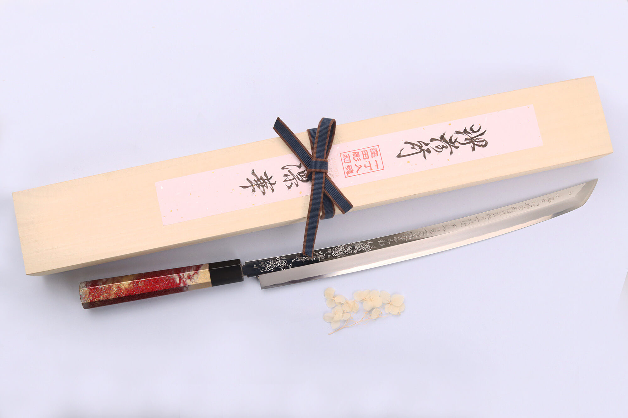 Sakai Takayuki est une maison emblématique de la coutellerie japonaise. Elle est installée à Sakai, ville réputée depuis le 16ème siècle pour ses lames de qualité supérieure. Les couteaux de la série Rinka y sont forgés à la main par des maîtres artisans, dont certains ont plus de 40 ans d’expérience. Cette gamme mêle l’excellence de l’acier japonais à un travail artistique rare, grâce à la collaboration avec Michiko Kubota, spécialisée dans les gravures traditionnelles. Le laquage Urushi, lui, est confié à des artisans spécialisés dans cette technique ancestrale. Chaque pièce est le fruit de plusieurs semaines, voire mois, de travail minutieux.