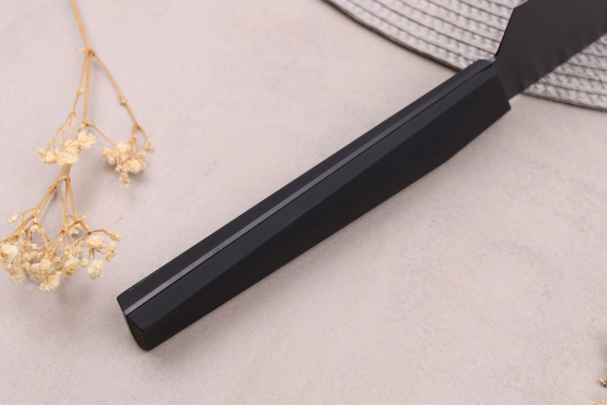 Le manche de ce couteau japonais est fabriqué en matière synthétique robuste, garantissant une grande durabilité et une résistance à l'humidité. Ce matériau antidérapant assure aussi une prise en main sécurisée.