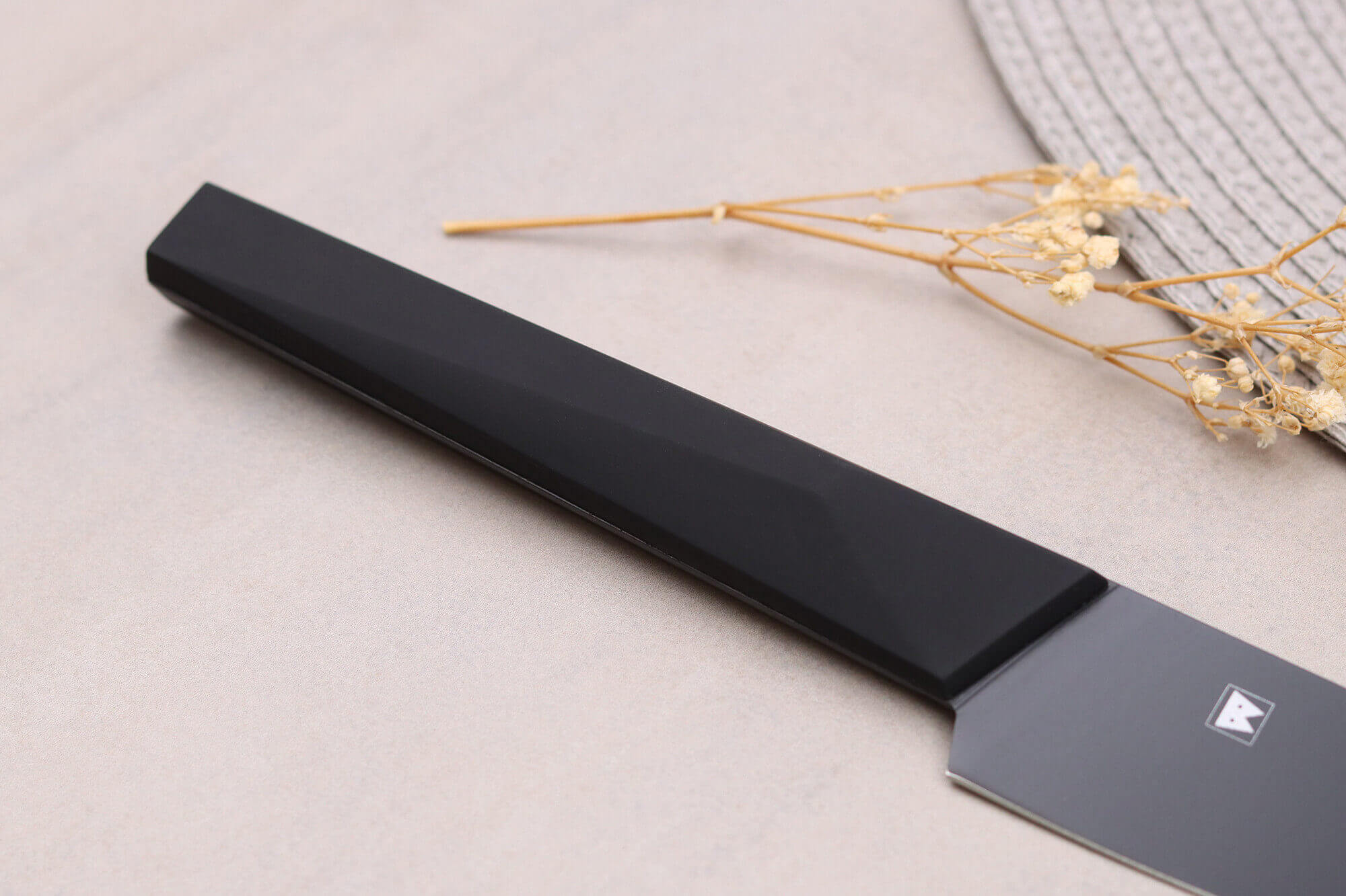 Le manche de ce couteau japonais est conçu en matière synthétique solide, assurant une grande durabilité et une résistance à l'humidité. Ce matériau est également antidérapant pour vous garantir une prise en main sûre.
