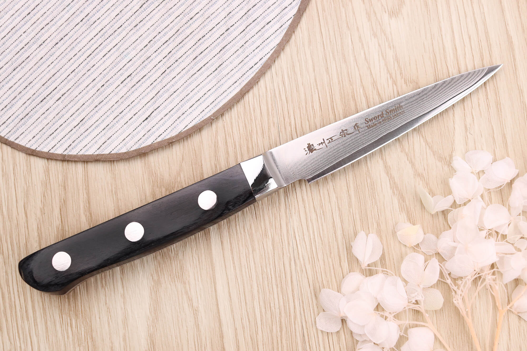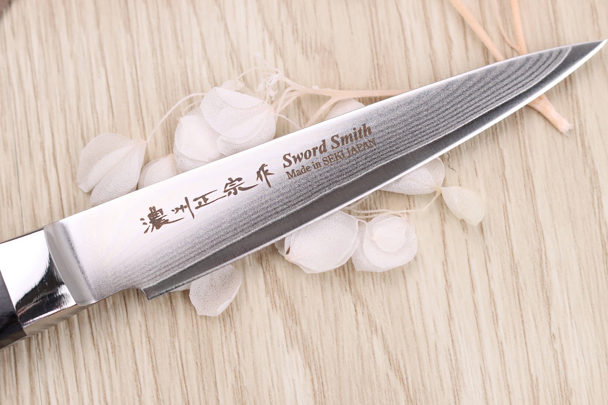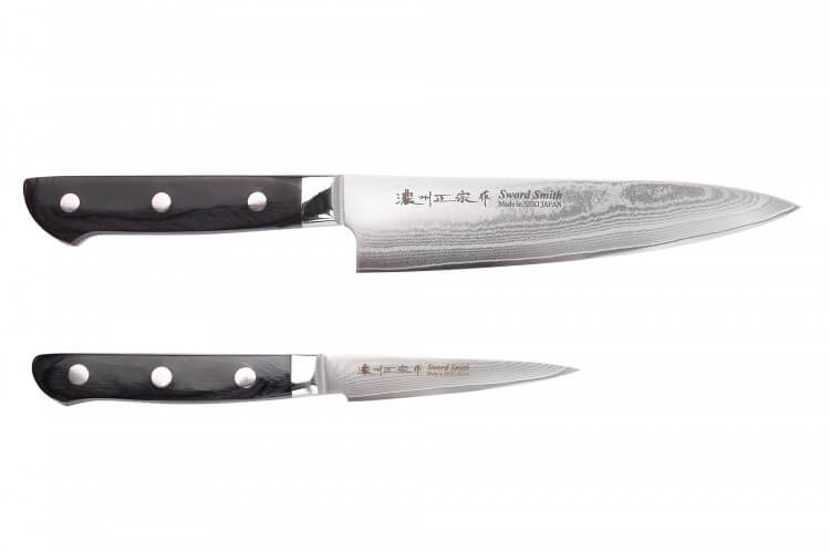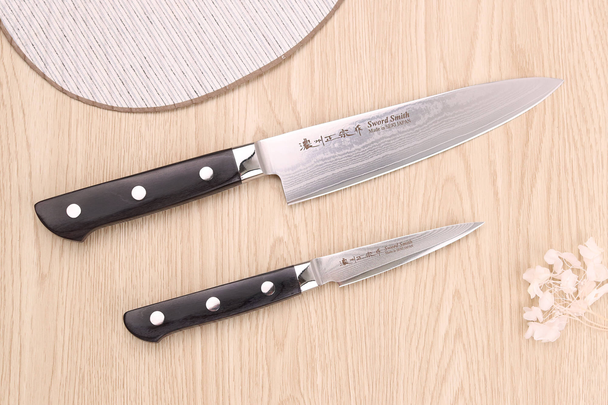 Ces couteaux japonais possèdent une lame damassée, une technique de forge qui consiste à réaliser un noyau en acier rigide, entouré de plusieurs couches d'acier souple. Cette méthode apporte une protection supplémentaire au cœur des lames tout en équilibrant leur rigidité.