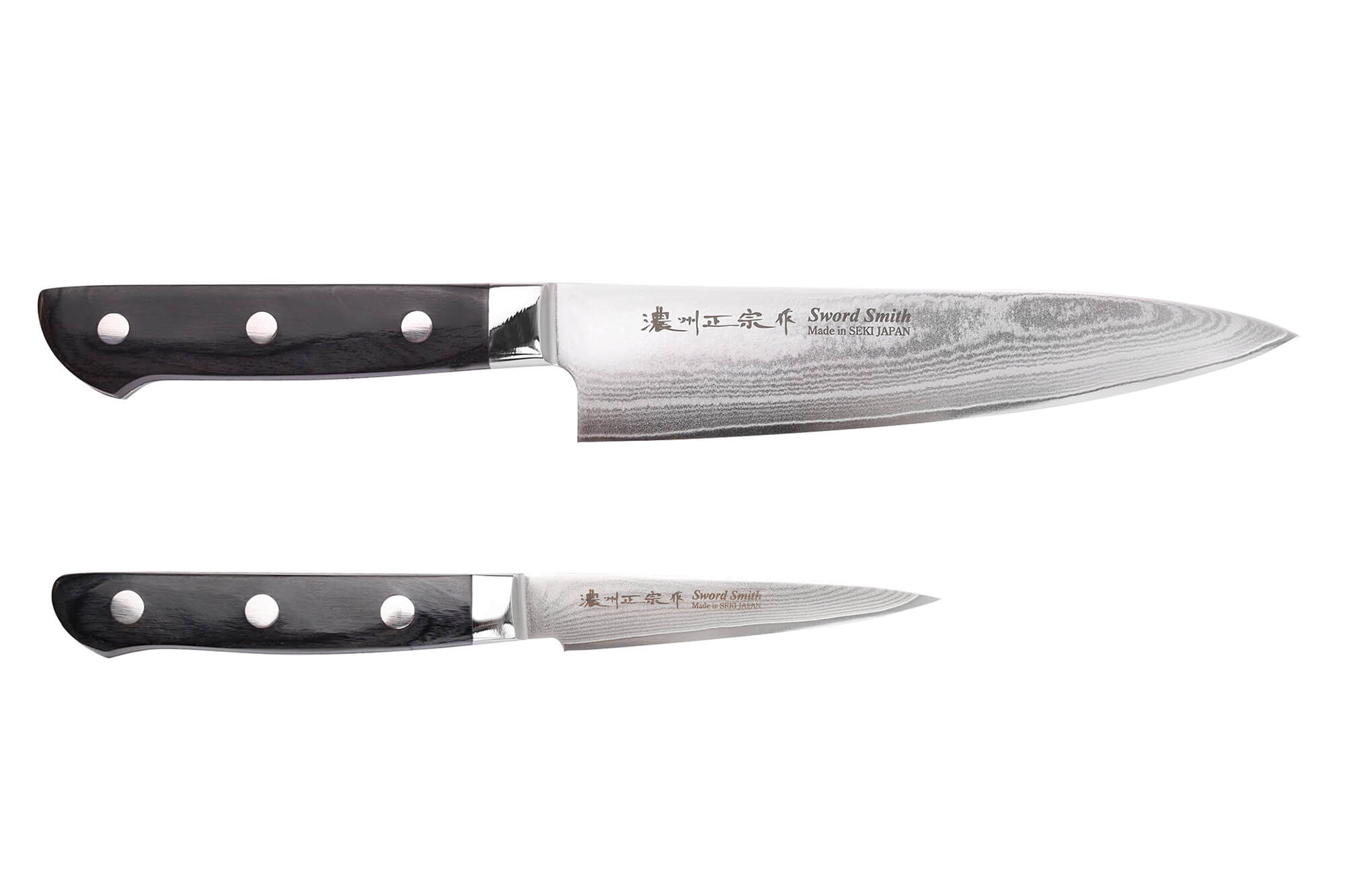 Coffret de 2 couteaux Wusaki Damas 10Cr manches en olivier Santoku + Office