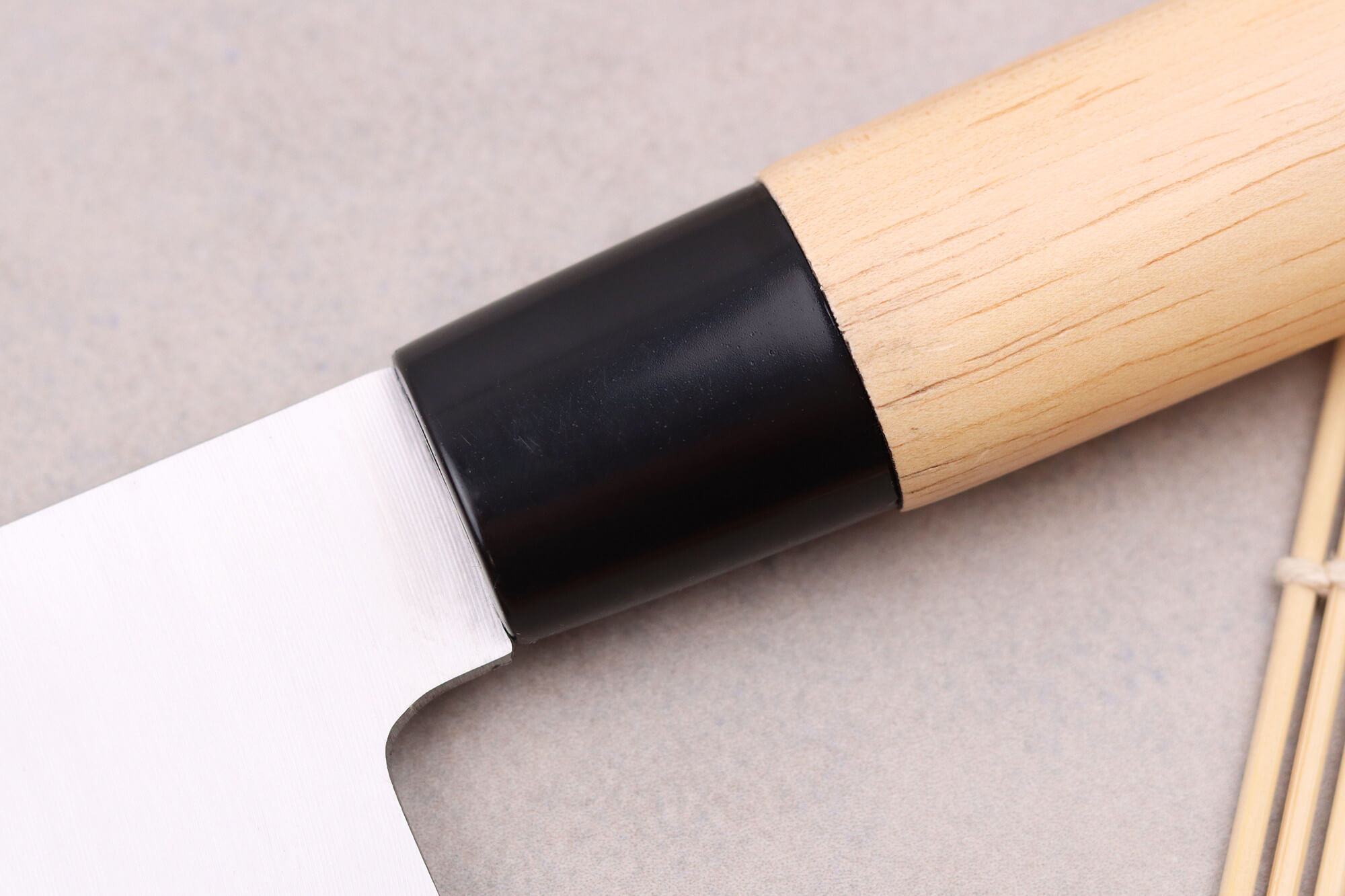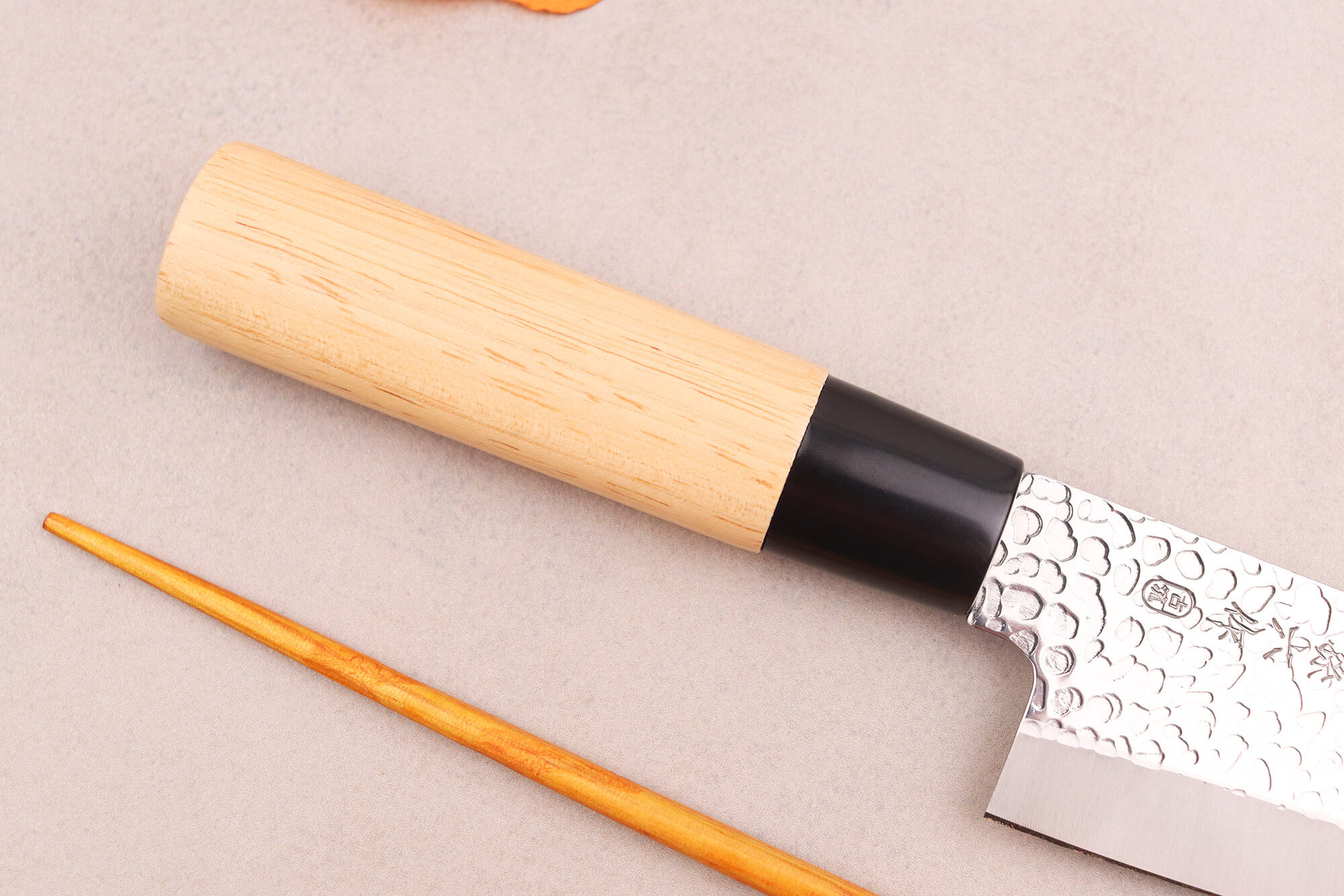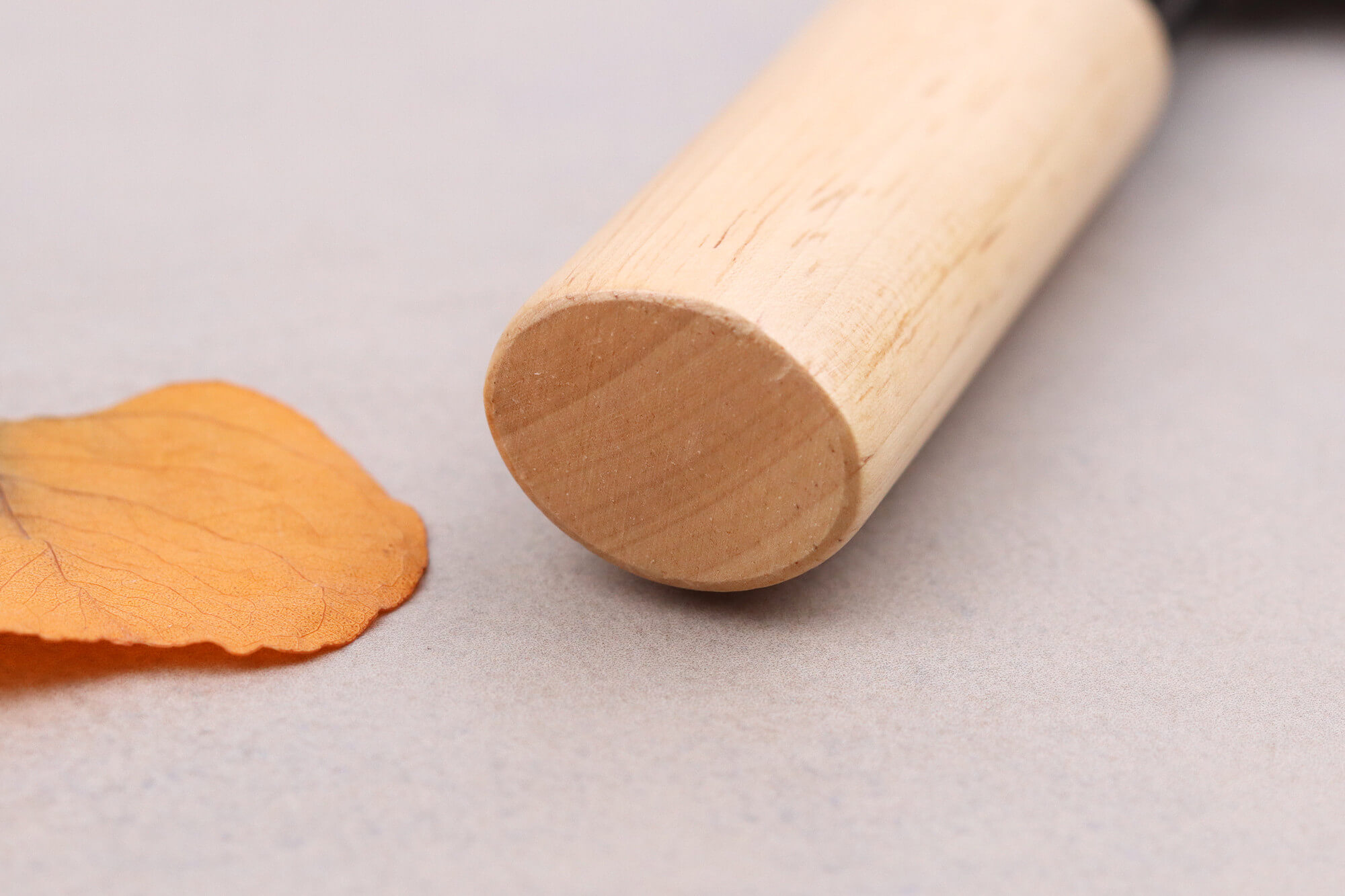 Ce couteau possède un manche en bois de magnolia, une essence appréciée pour sa teinte claire allant vers le crème. Cette essence précieuse, traditionnellement utilisée pour fabriquer les fourreaux des sabres japonais, est caractérisée par sa légèreté, sa résistance à l'humidité et son toucher doux.