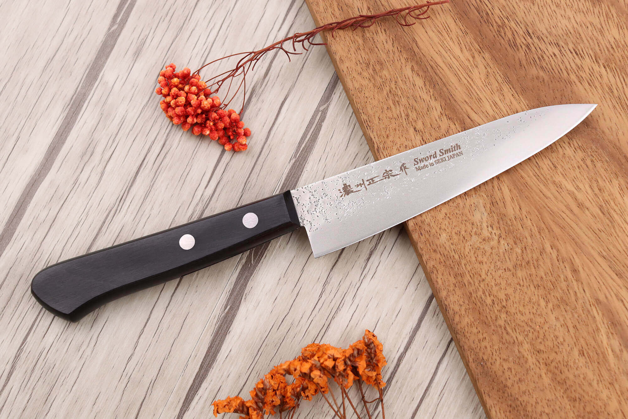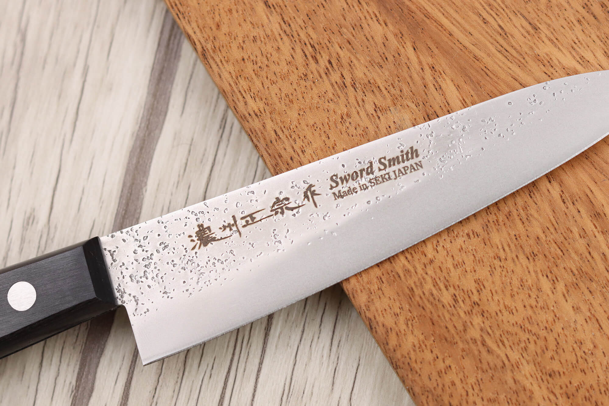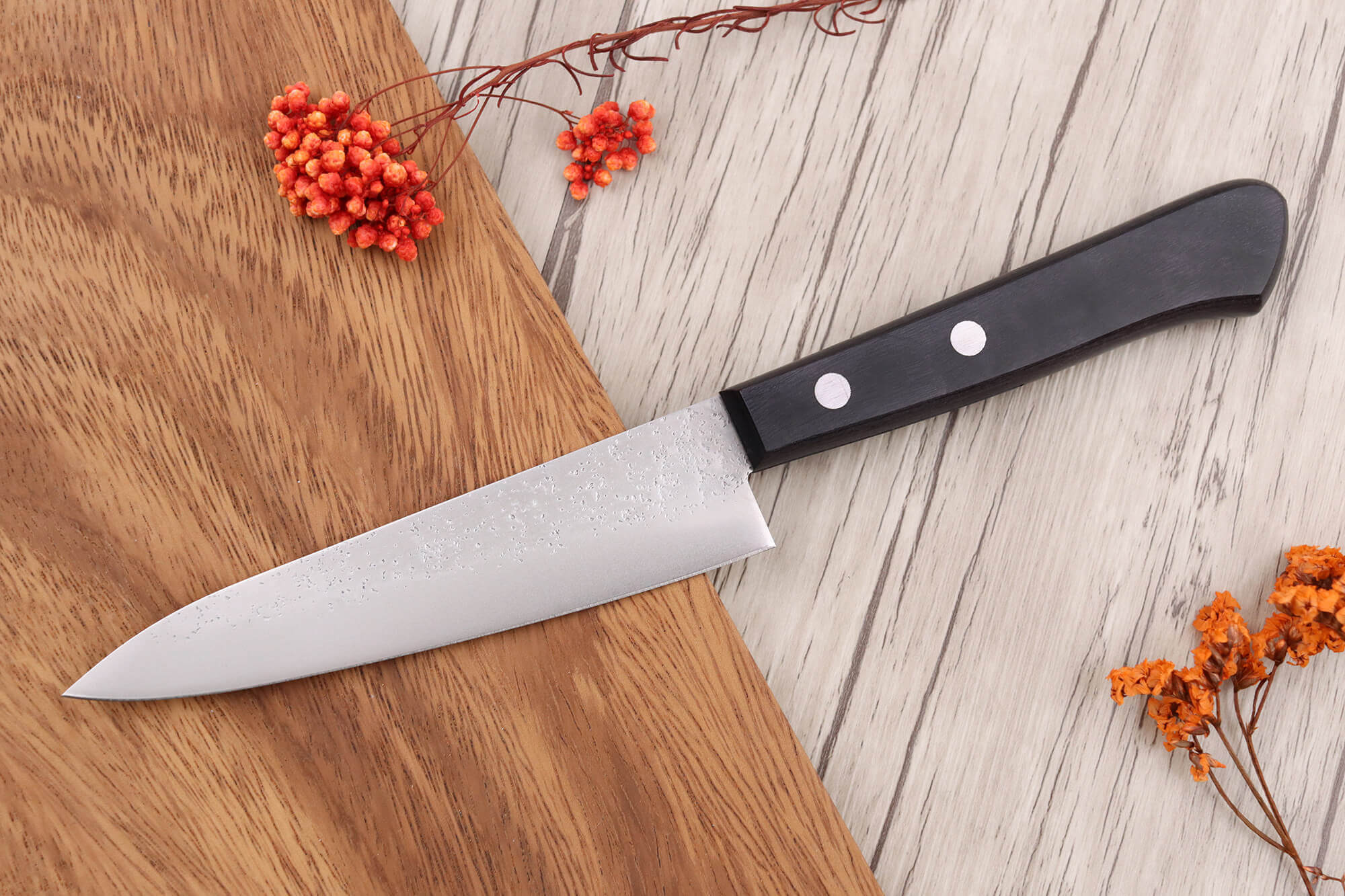 Pour garantir une fixation solide, 2 rivets en acier inoxydable sont intégrés au manche, maintenant fermement la lame demie-soie de votre couteau Satake.