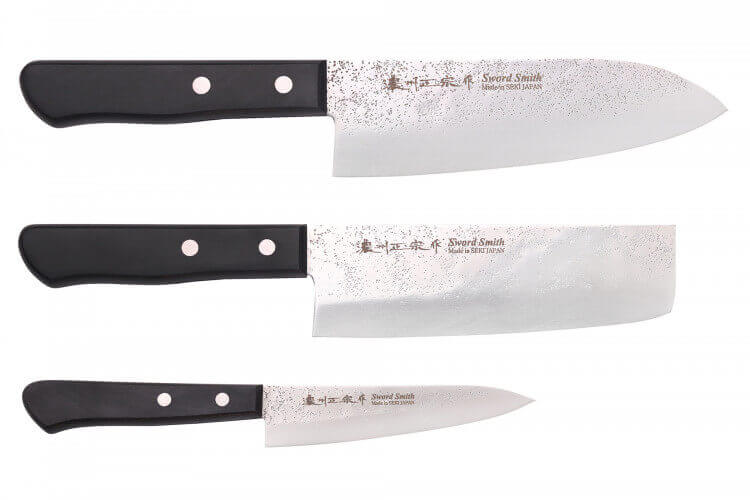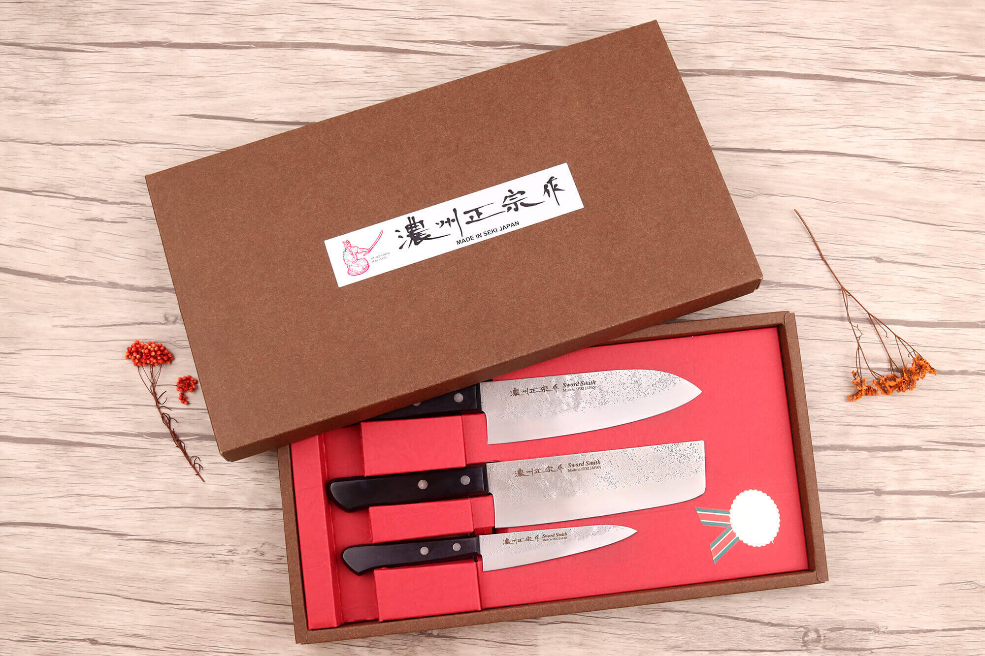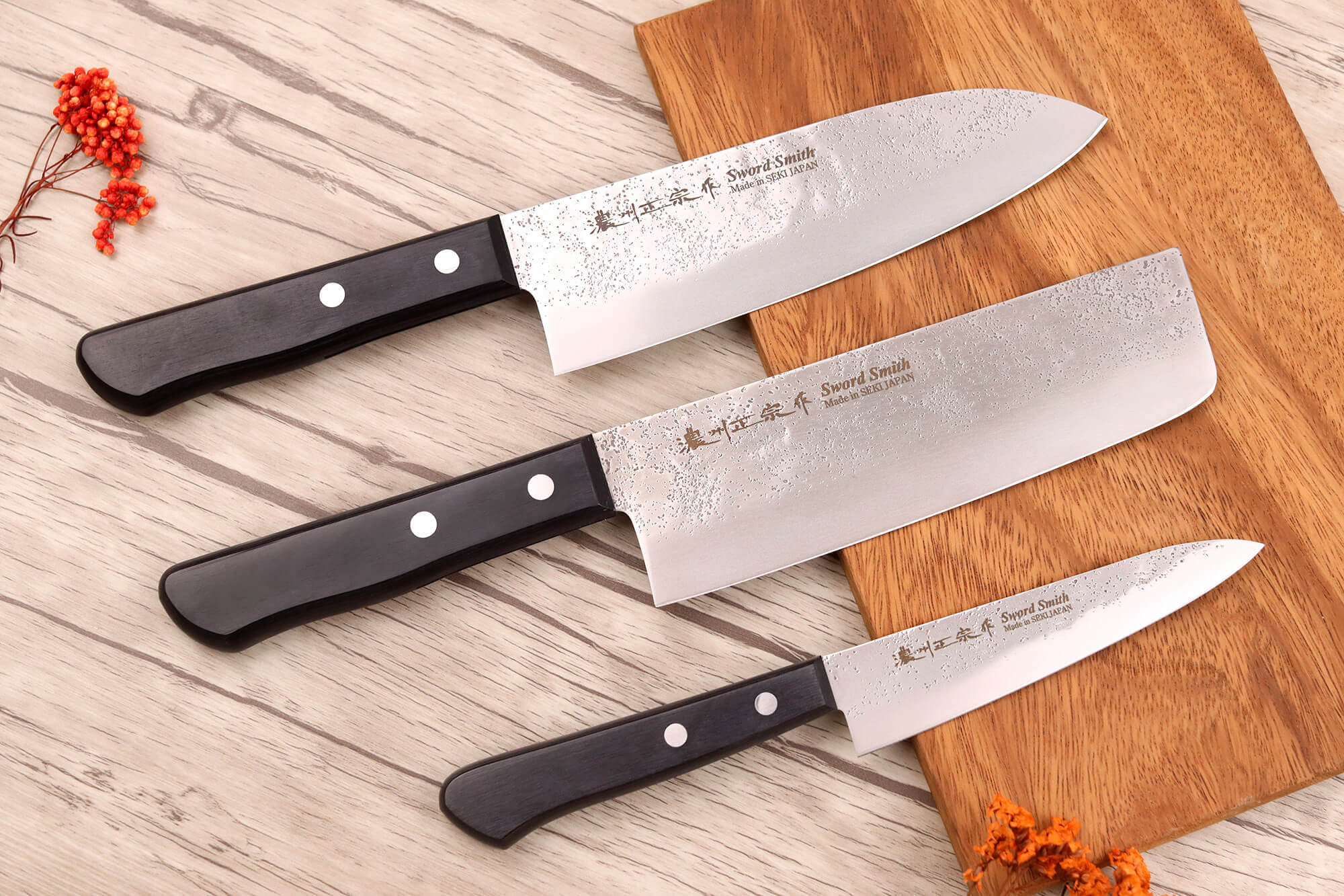 Contient 1 couteau d'office + 1 couteau nakiri + 1 couteau santoku