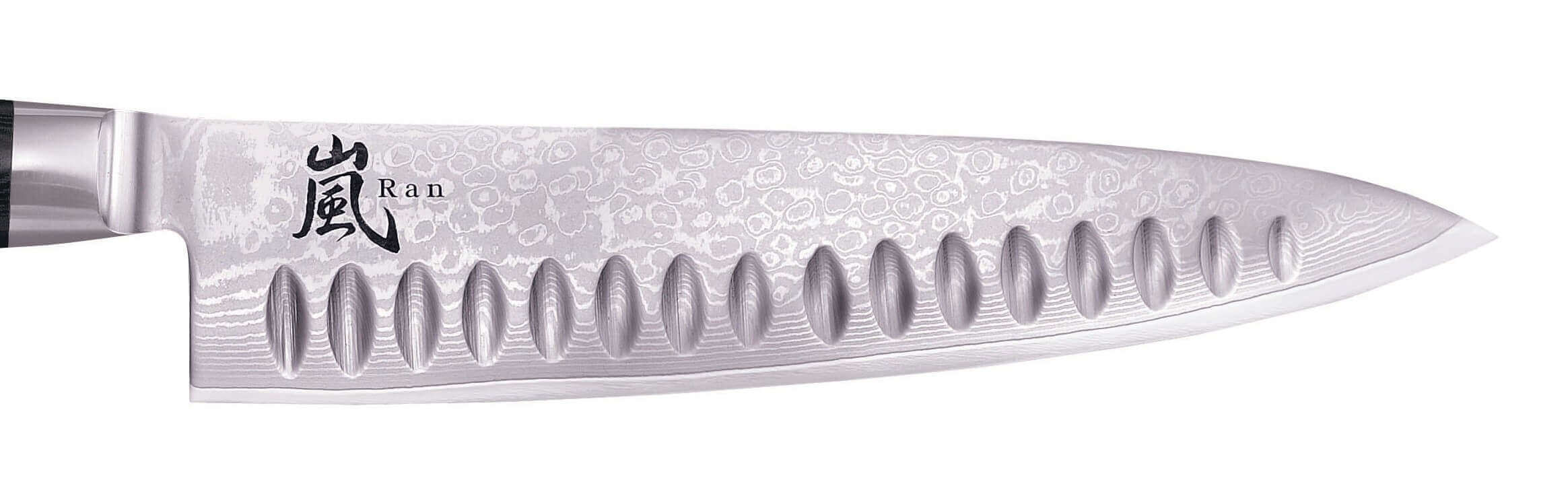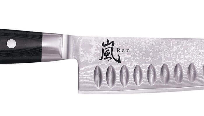 Ce coeur est entouré de 68 couches d'acier dur et doux posées en alternance par dessus (soit 34 couches de chaque côté) : c'est le procédé de damasquinage. Cette technique d'orfèvre est utilisée pour assurer à la lame une solidité et une élasticité se mêlant à la perfection. Les alvéoles présentes le long de sa surface de coupe permettent des découpes aisées, empêchant les aliments de coller de trop.
