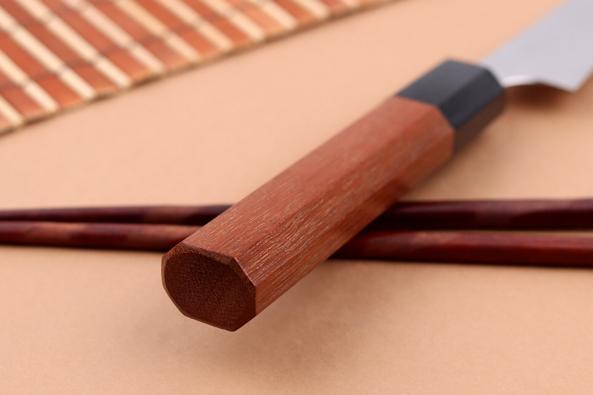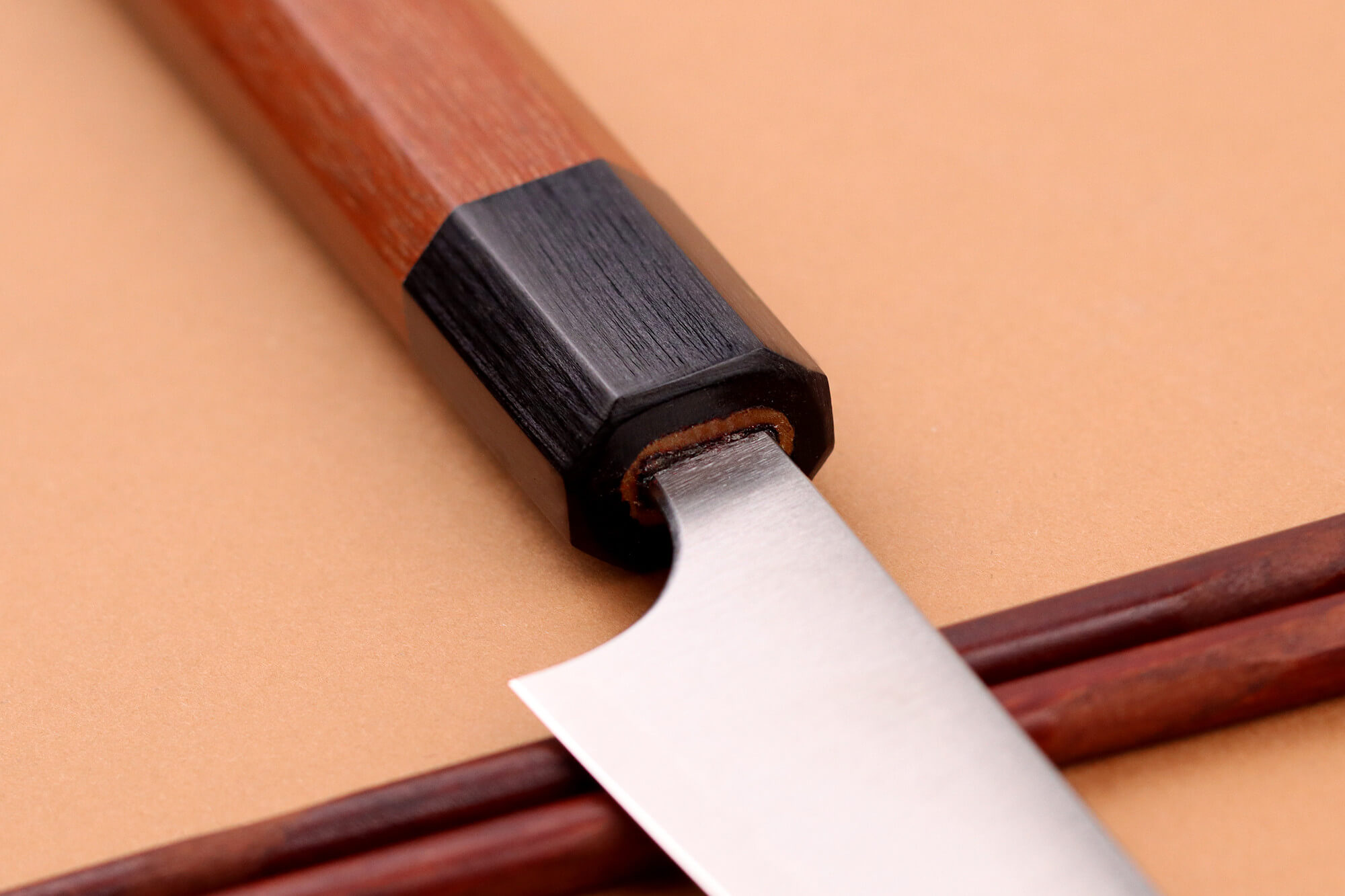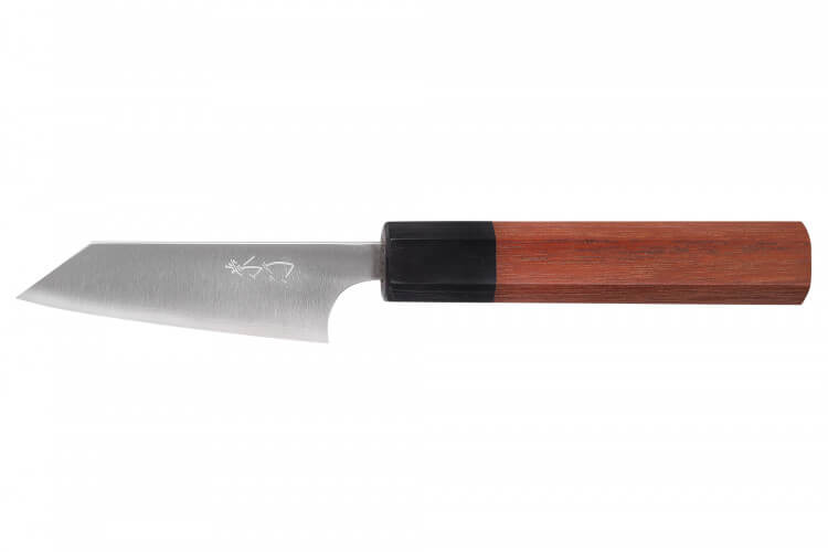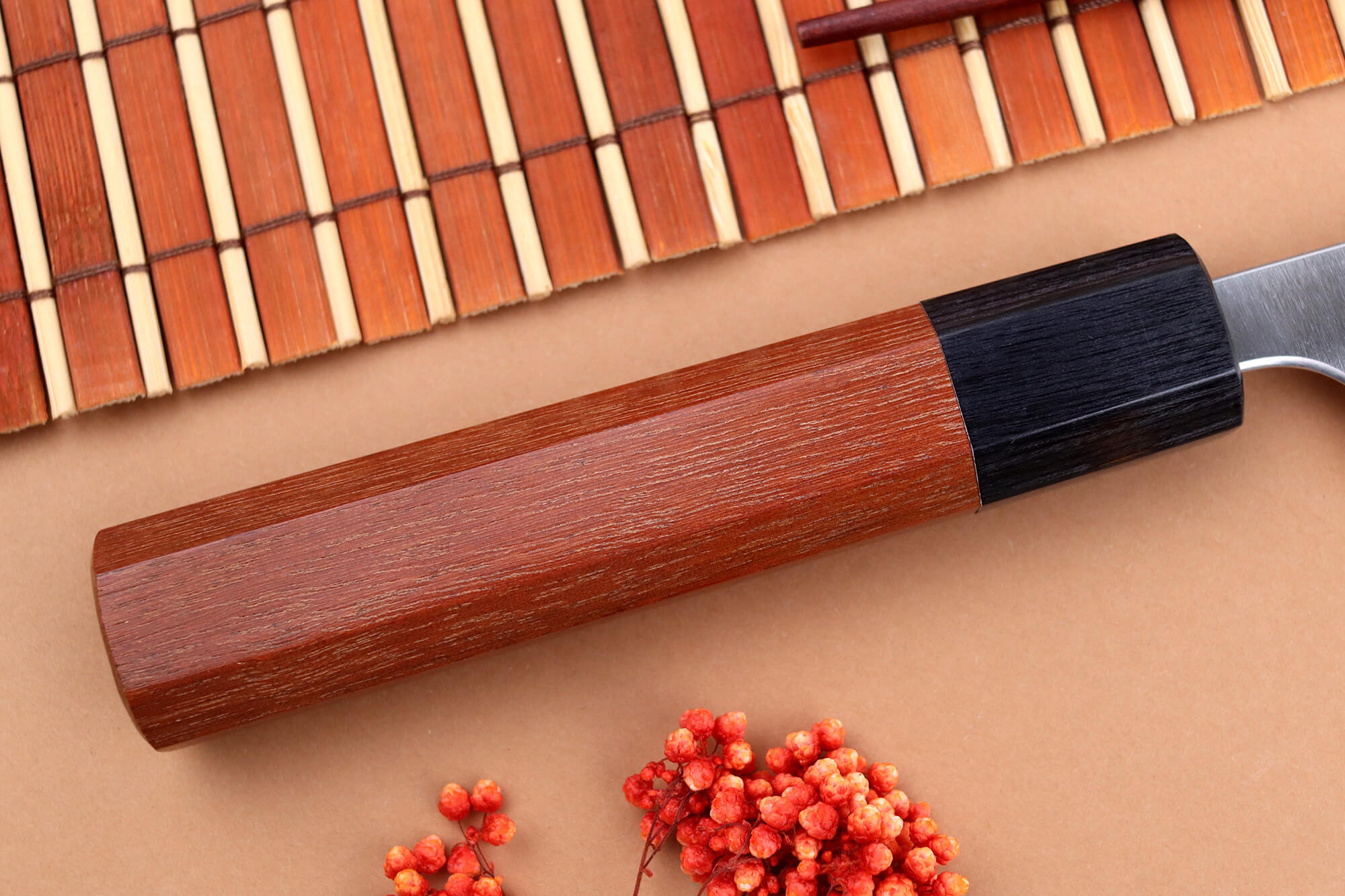Le manche de ce couteau japonais de cuisine est fabriqué en bois de jarrah tropical, une essence réputée pour sa robustesse et sa durabilité, particulièrement résistante à l’humidité. Sa teinte marron aux nuances chaudes apporte une touche d’élégance naturelle et chaleureuse, très prisée des amateurs de coutellerie artisanale.