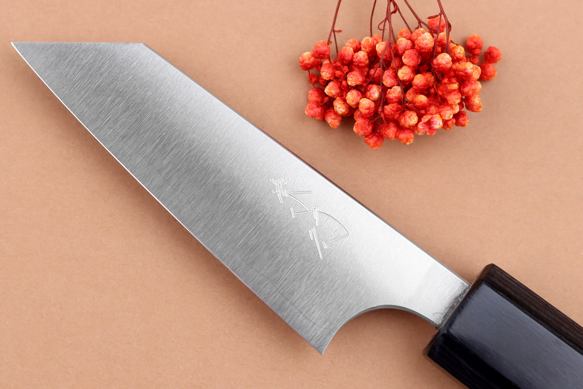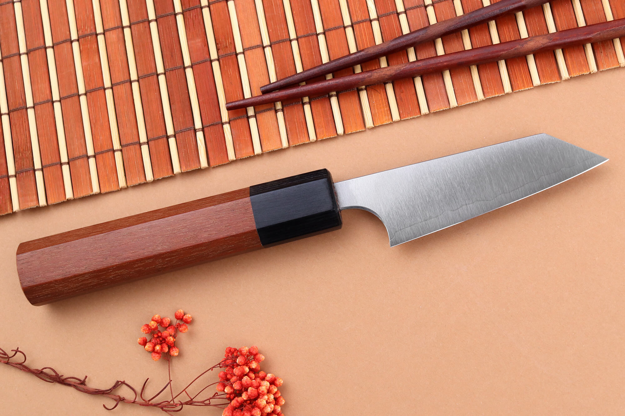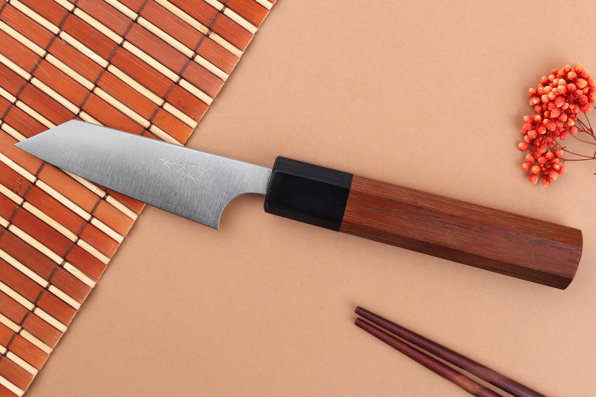 Le manche de ce couteau japonais de cuisine est fabriqué en bois de jarrah tropical, une essence réputée pour sa robustesse et sa durabilité, particulièrement résistante à l’humidité. Sa teinte marron aux nuances chaudes apporte une touche d’élégance naturelle et chaleureuse, très prisée des amateurs de coutellerie artisanale.