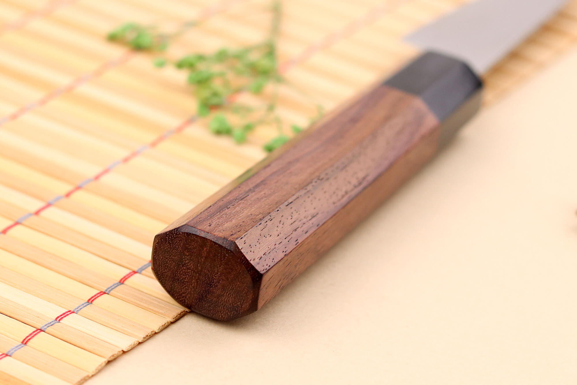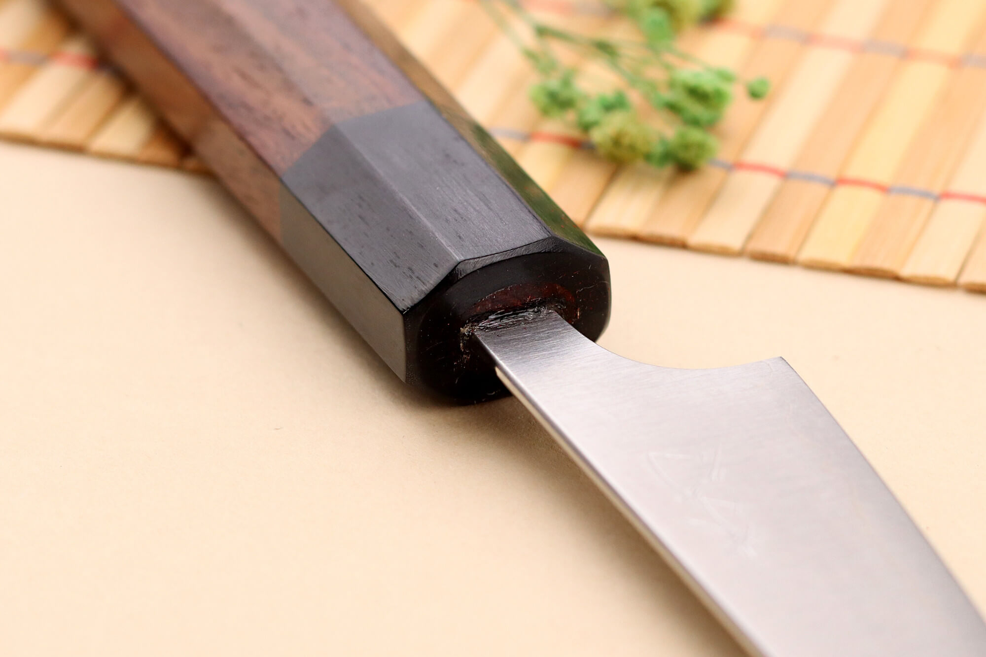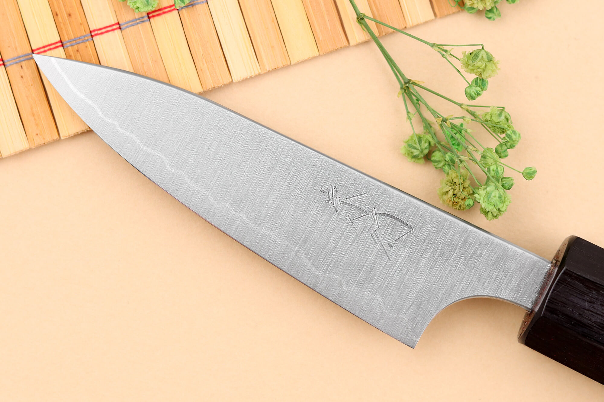 La structure San Maï (trois couches d’acier) intègre un cœur en acier japonais Aogami Super (aussi appelé Blue Paper Steel) à 1,5 % de carbone, offrant une dureté de 65HRC. Ce choix garantit un tranchant très durable et facile à aiguiser, avec une lame fine et ultra glissante grâce à sa finition polie. Une couche d'acier inox vient recouvrir le noyau pour lui apporter plus de robustesse.
