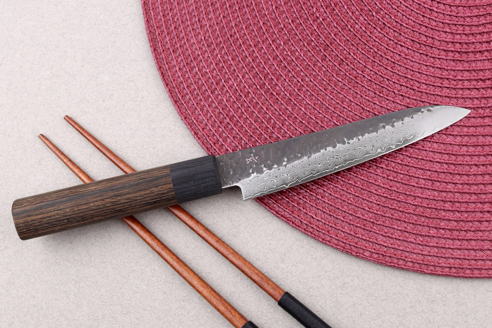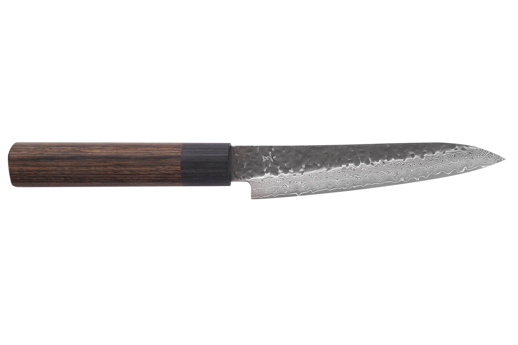 La lame de 13 cm est confectionnée d'un noyau en acier VG10 entouré de 33 couches d'inox, créée par une structure damassée. Le cœur, riche en carbone d'environ 1 %, atteint une dureté de 60HRC sur l'échelle de Rockwell, garantissant une excellente rétention du tranchant. La finition brute de forge et la surface martelée, non seulement embellissent la lame, mais limitent aussi l’adhérence alimentaire.