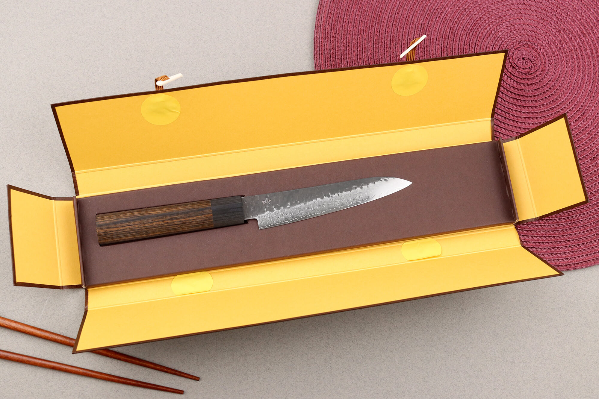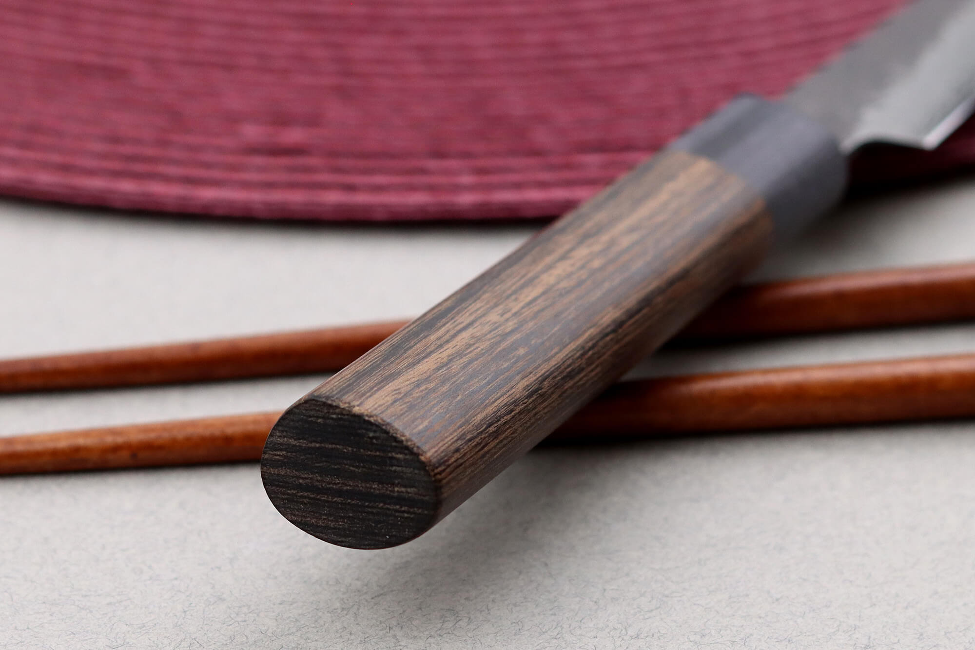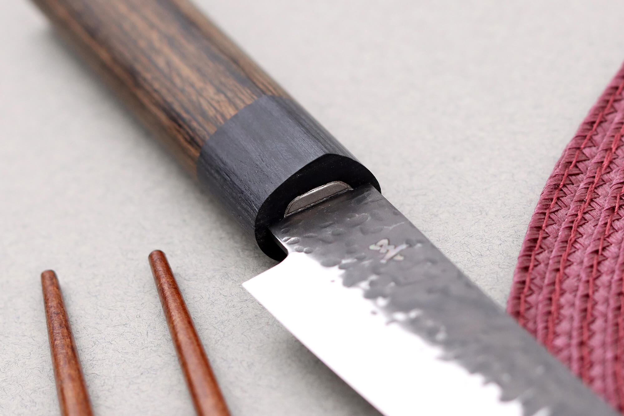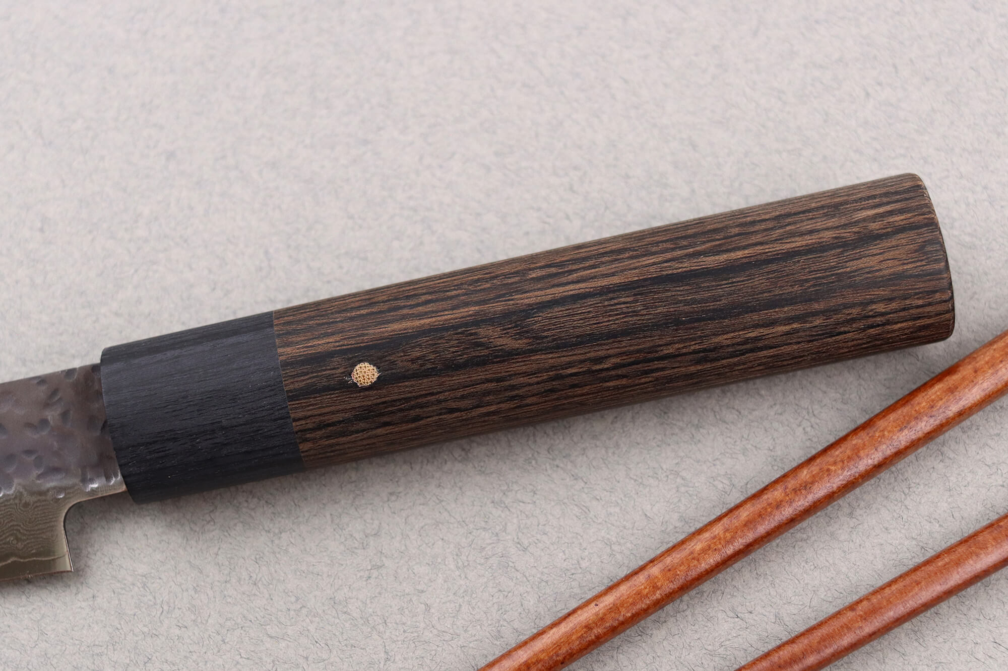 Le manche de forme D, en pakkawood, offre une ergonomie naturelle, adaptée aux gestes de précision. Ce bois composite allie durabilité et résistance à l’humidité, tout en conservant un toucher chaleureux. La mitre assortie participe à l’équilibre du couteau, conférant confiance et maîtrise à chaque mouvement.