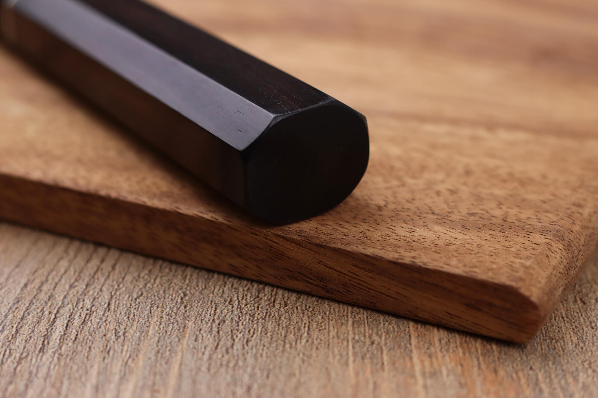 Votre kiritsuke arbore un très élégant manche en ébène de Macassar, aussi appelé bois d'ébène d'or. Cette essence provenant d'Indonésie est très dure, vous assurant un manche de couteau solide. Sa teinte brune foncée aux larges veinages noirs marqués, parfois marbrés, lui confère son aspect prestigieux. Le grain du bois est lisse et uniforme pour que la prise en main soit agréable.