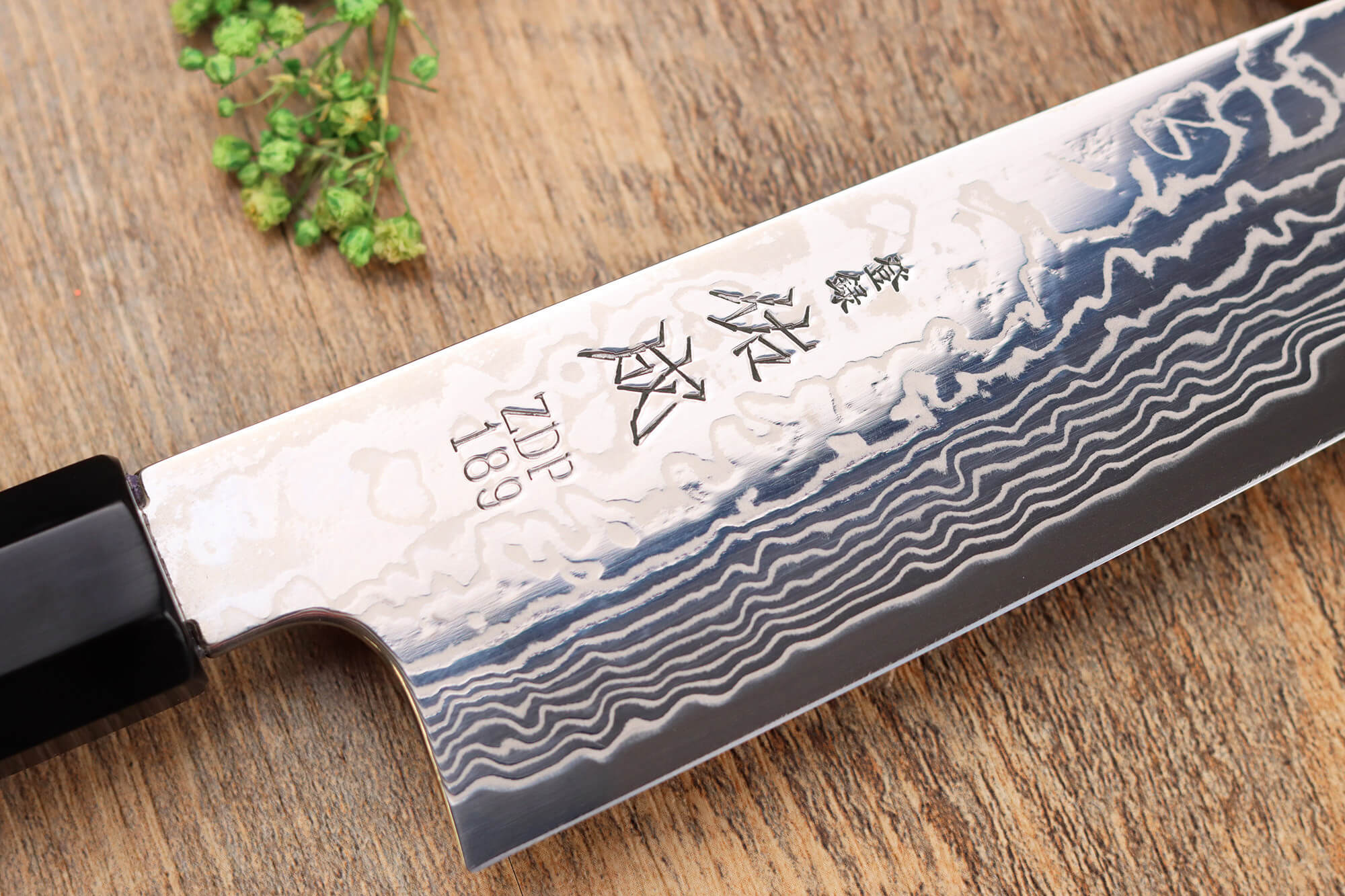 Ensuite, l'acier ZDP-189 est entouré de plusieurs couches d'acier au nickel plus douces. Les couches s'alternent pour créer le damas et viennent donc équilibrer la forte rigidité du cœur et le protéger.