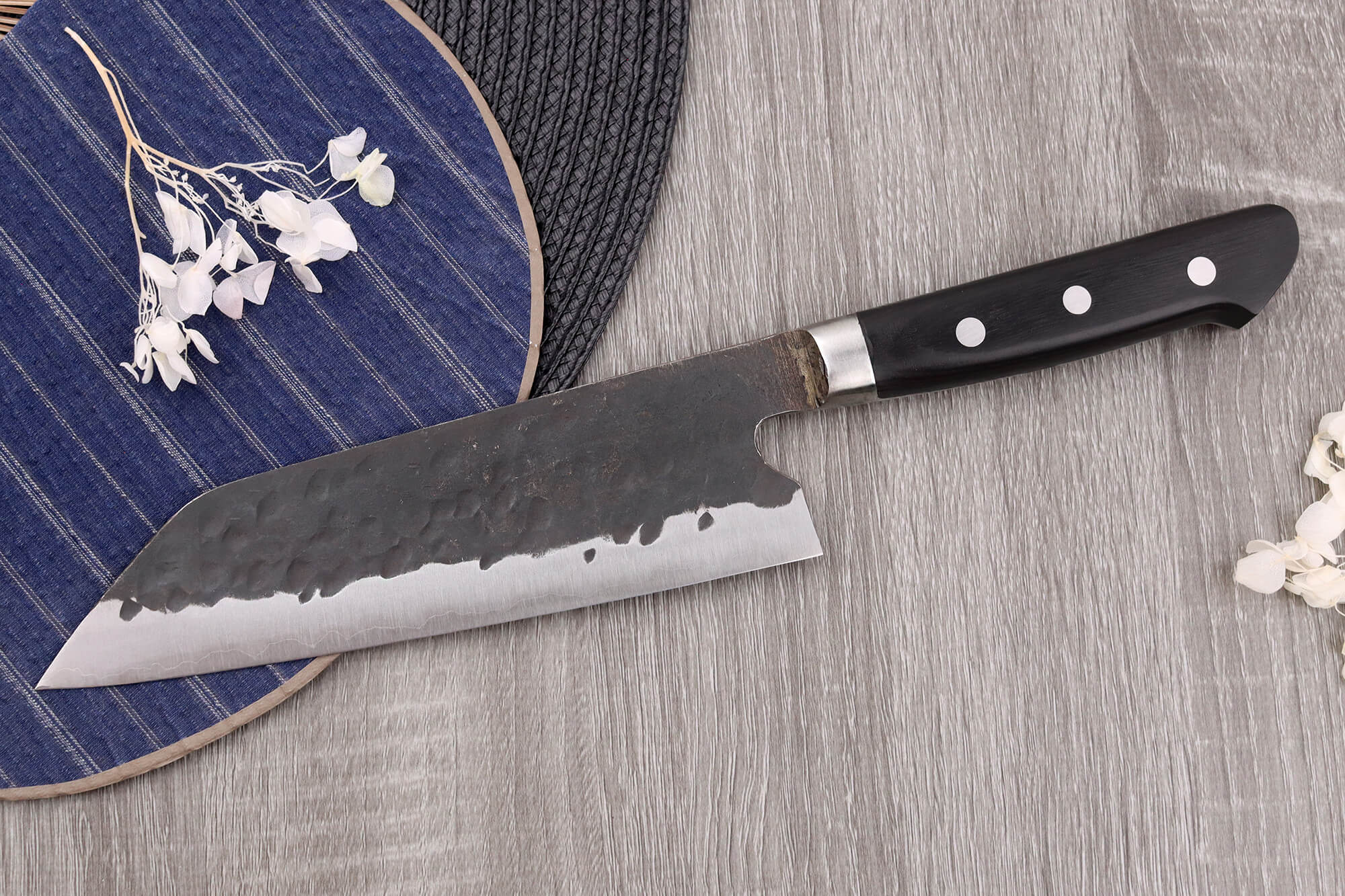 Votre couteau artisanal japonais dispose d'un noyau en acier Aogami Super (aussi appelé Blue Super Steel). Il s’agit d’un alliage haut de gamme contenant environ 1,5 % de carbone, ainsi que du tungstène, du chrome et du vanadium. Cette composition lui confère une dureté élevée proche de 65HRC Rockwell, ce qui garantit une rétention de coupe longue durée et un aiguisage très fin, prisé des cuisiniers exigeants !