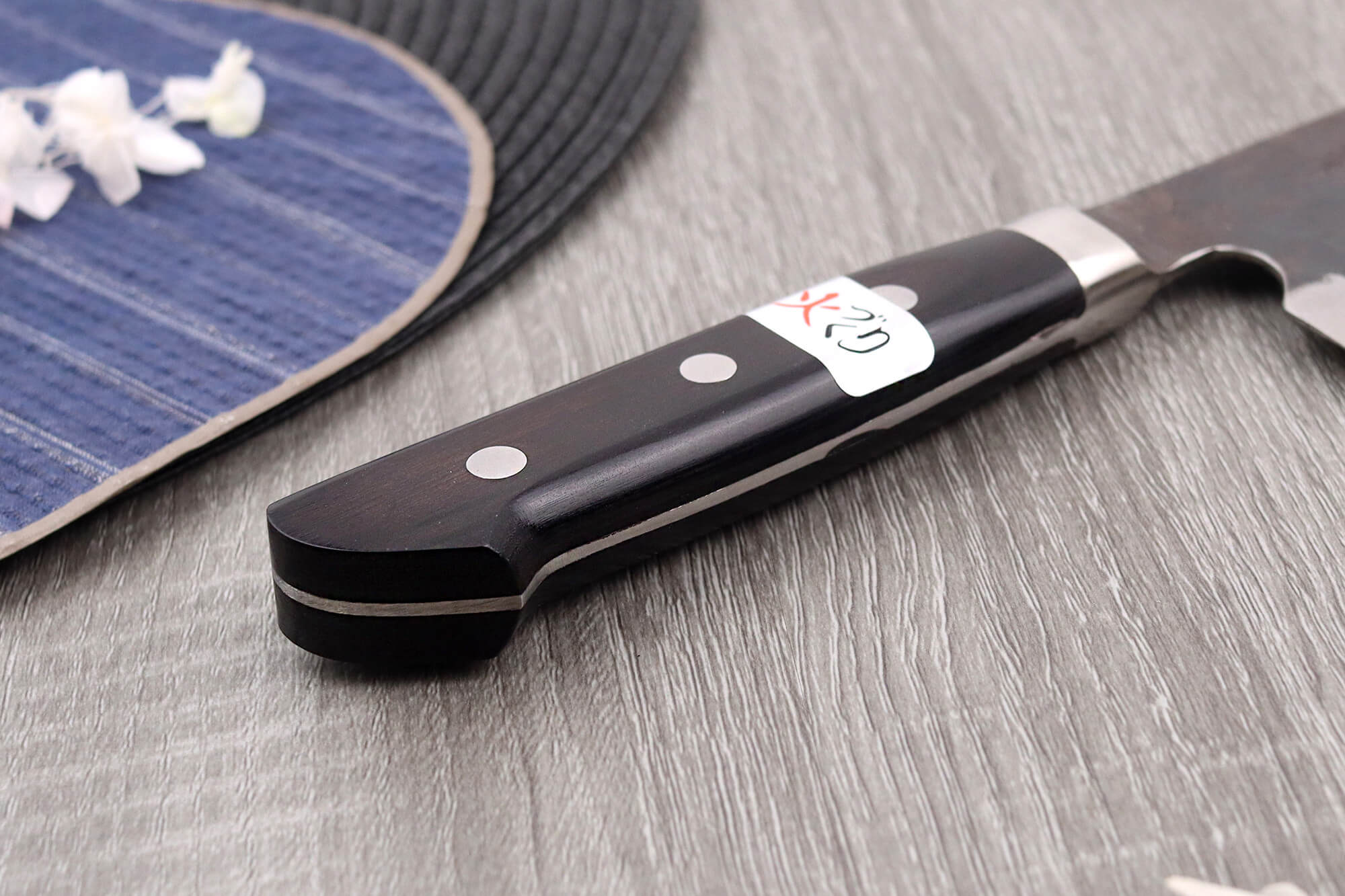 Le manche de ce couteau japonais de cuisine se distingue par sa forme occidentale, en pakkawood. Cette matière est un bois stabilisé par résine haute densité, appréciée pour sa résistance à l’humidité et aux variations de température. Le bois de pakka est aussi hygiénique et facile d’entretien, un vrai atout au quotidien.